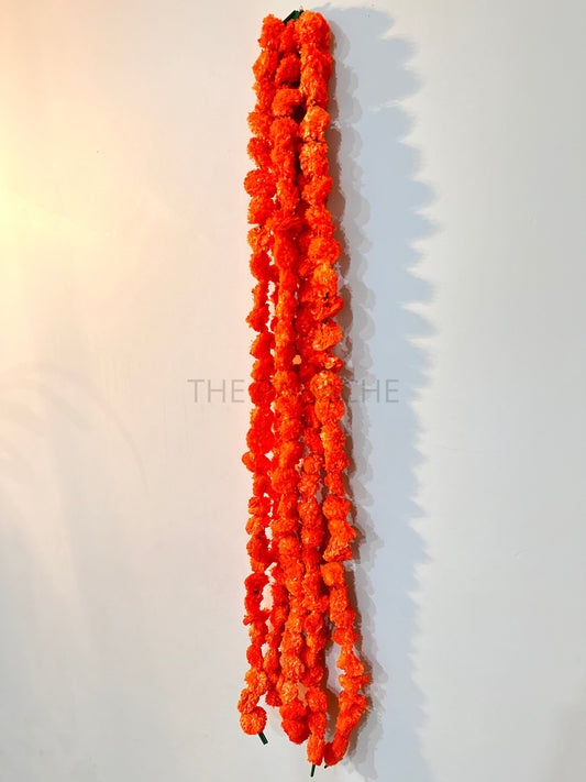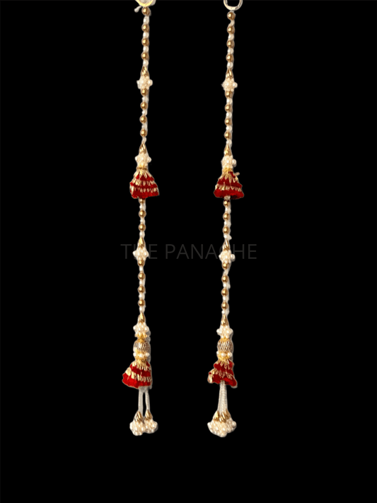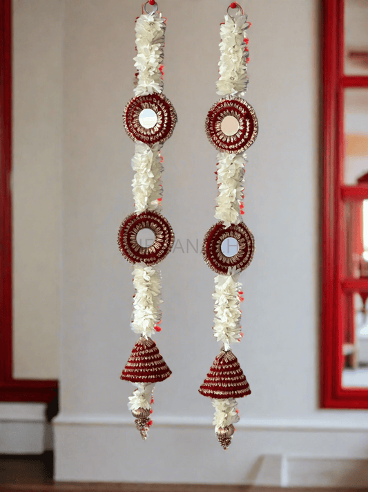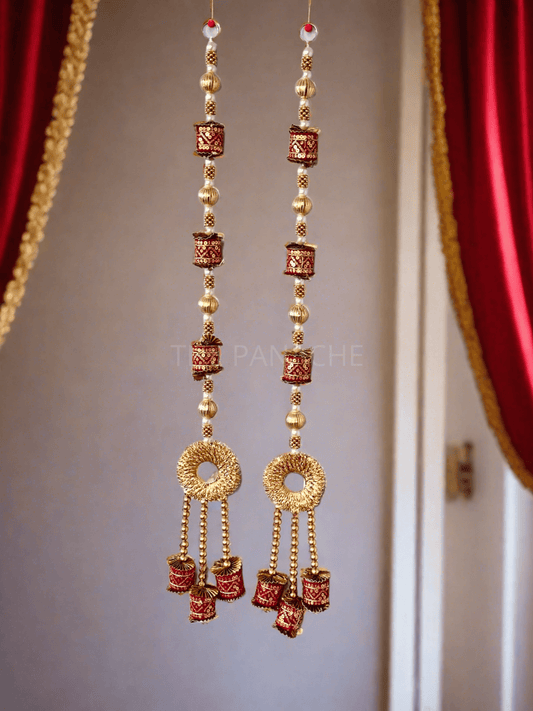 Red Cylindrical Golden Beads, Round Mirror, and Pearl Toran