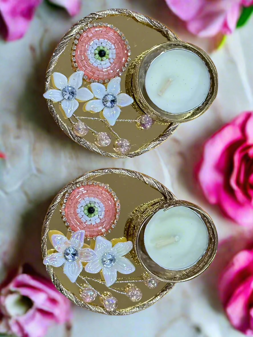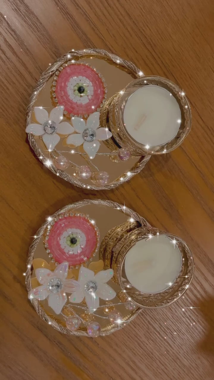 Pink Evil Eye Candle/Diya offers a unique blend of protection and style, combining the symbolic power of the evil eye with modern design. The holder features a soft pink finish with the iconic evil eye motif, believed to ward off negative energy and bring good luck. Adorned with intricate detailing, this diya holder is as protective as it is beautiful. The set comes with two tea-light candles, perfect for creating a calming, radiant glow.