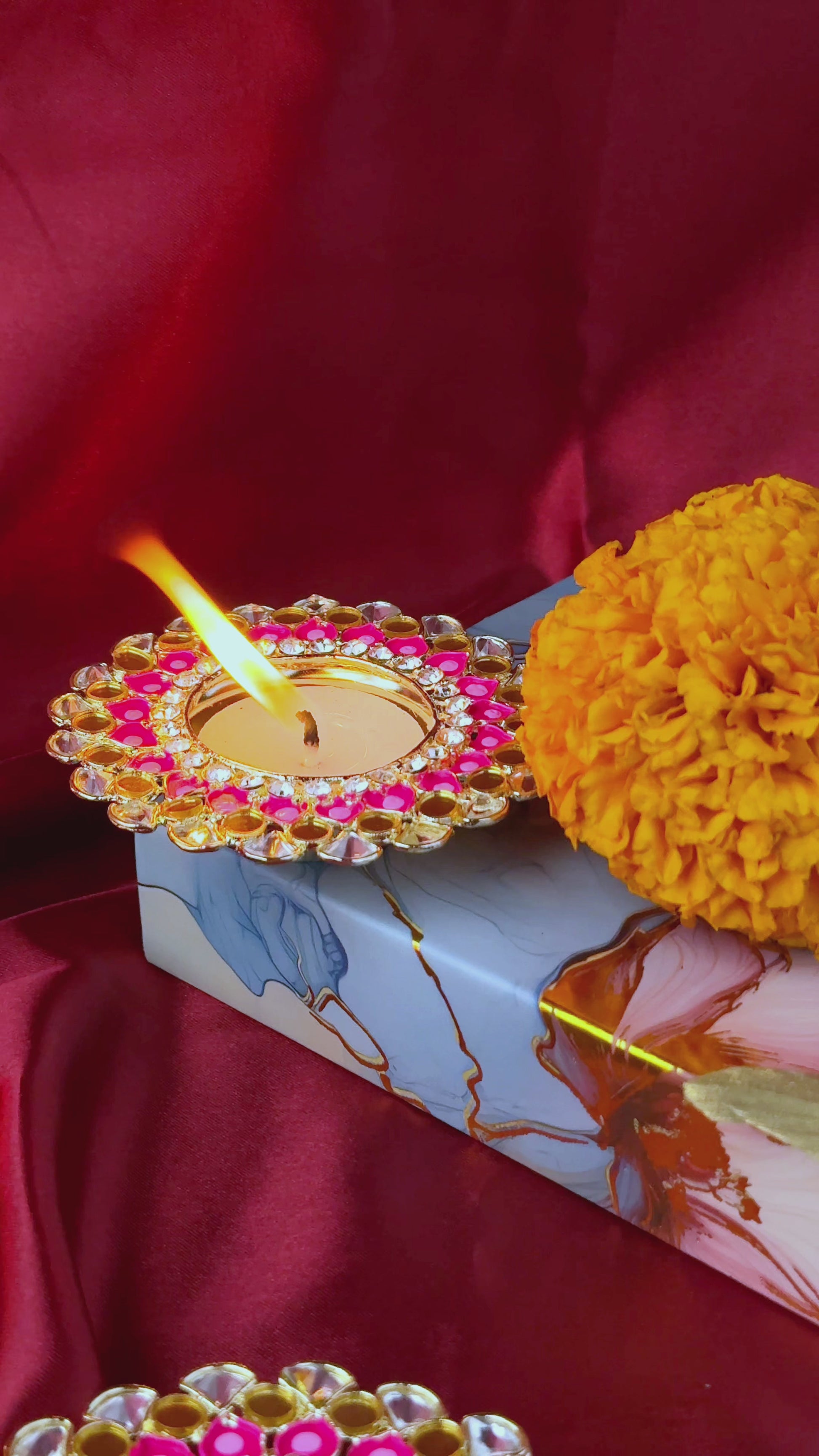 Pink Cherry Blossom Diya Holders with 2 Tealight Candles are a perfect blend of beauty, tradition, and versatility. Shaped like delicate cherry blossoms with a soft pink finish, these diya holders are designed to add a touch of elegance to any space. Each set includes two tealight candles, offering a warm, inviting glow that’s perfect for illuminating special moments.