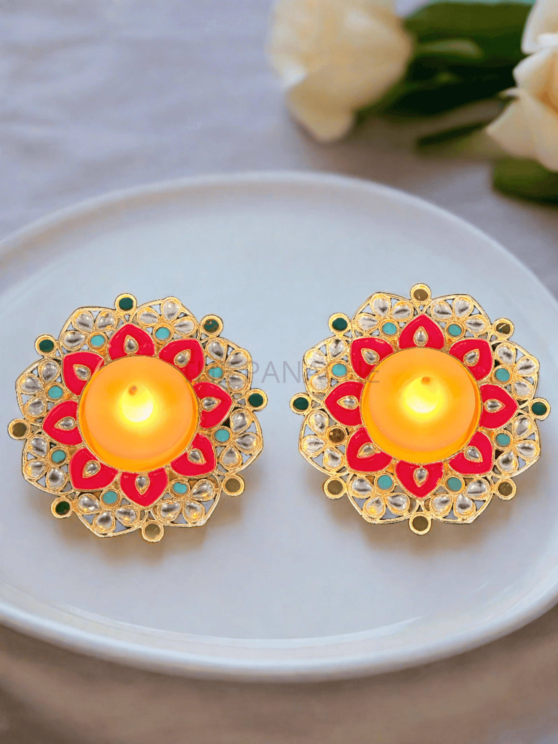 Imagine these candles adorning a beautifully set dinner table, their flickering flames casting a soft, inviting glow, while the kundan detailing catches and reflects the light, creating a mesmerizing play of colors and patterns. Whether used for special occasions or to elevate everyday moments, dark pink kundan-studded candles are sure to be a captivating and memorable addition to any space.