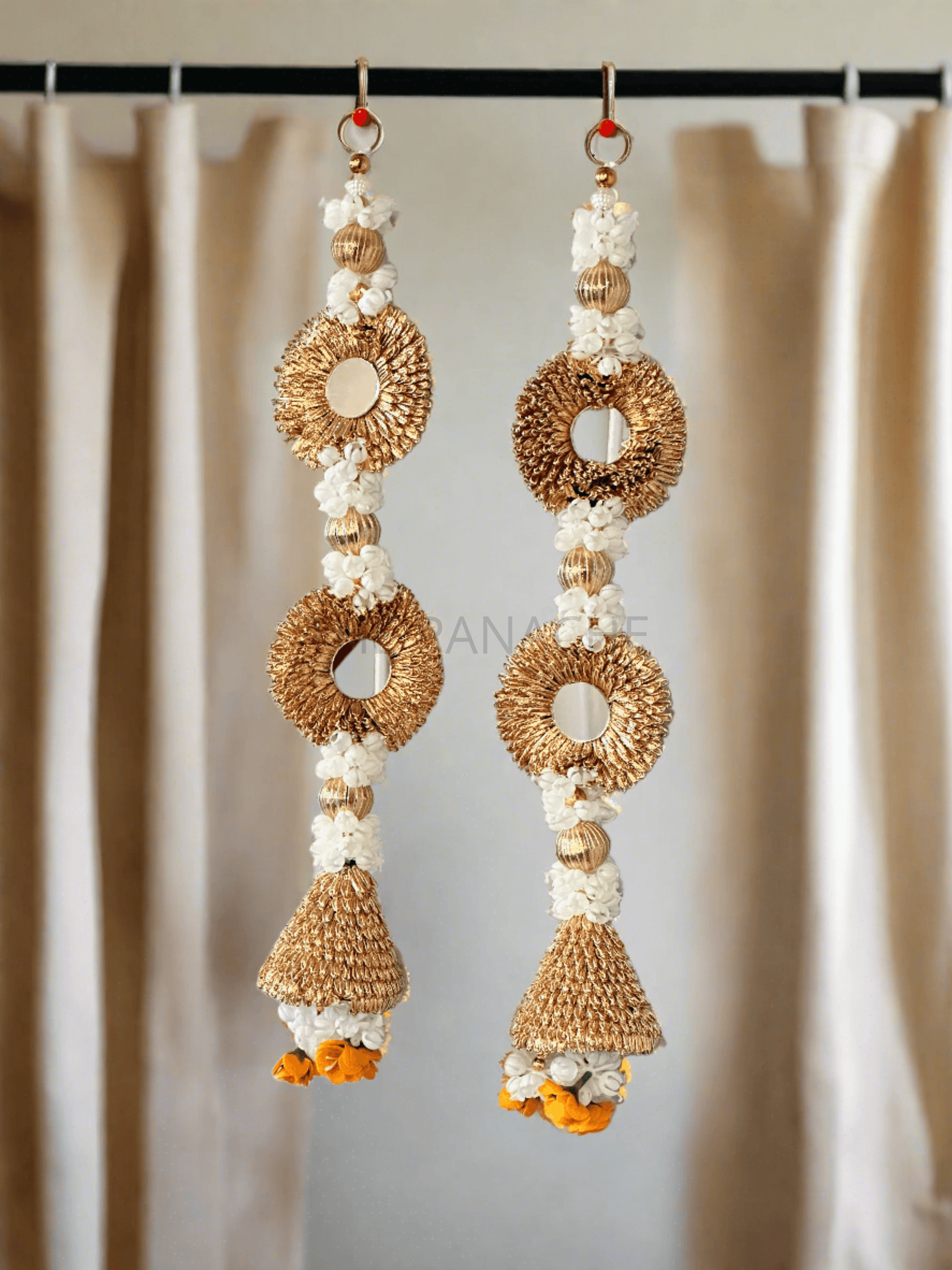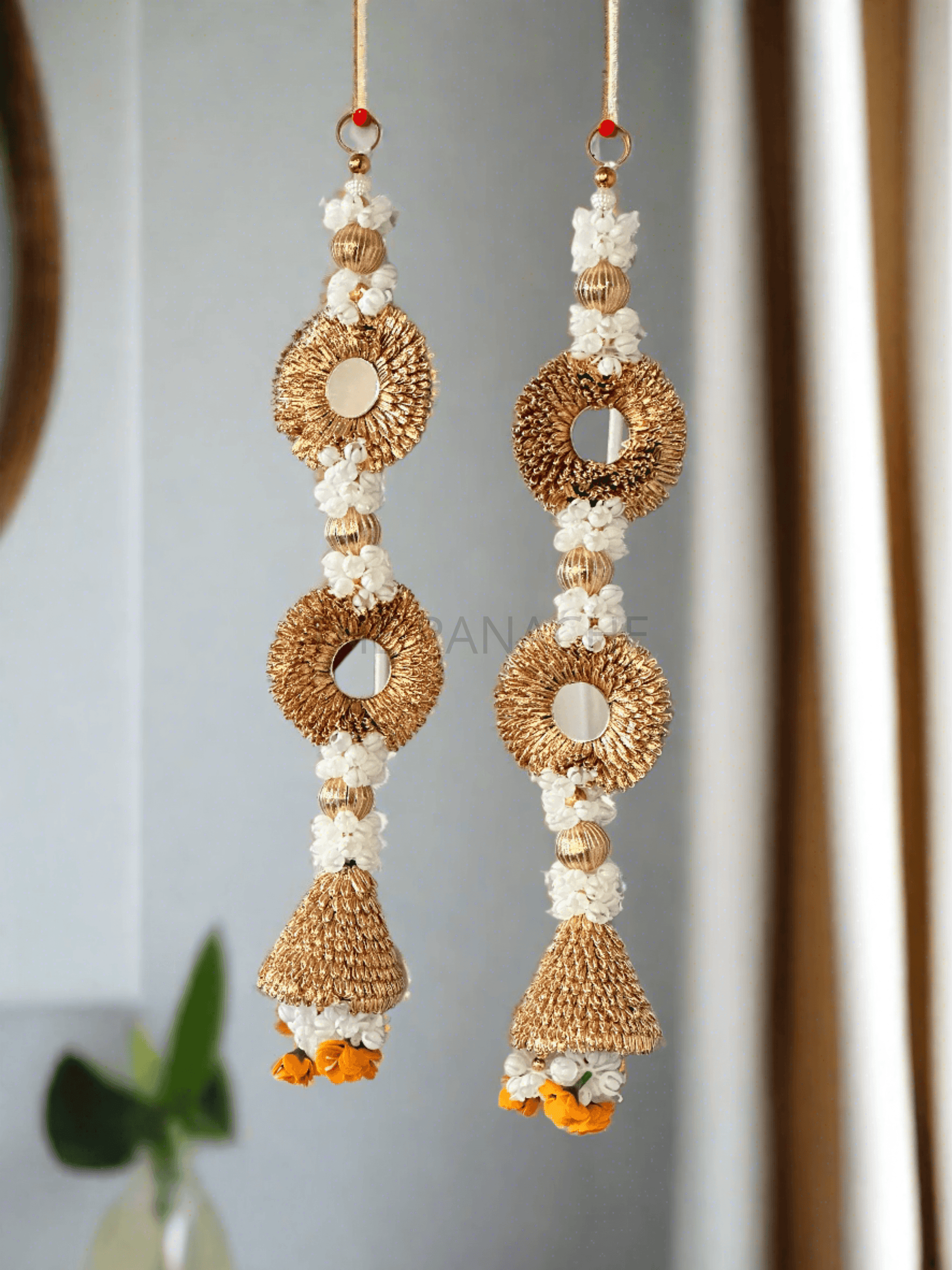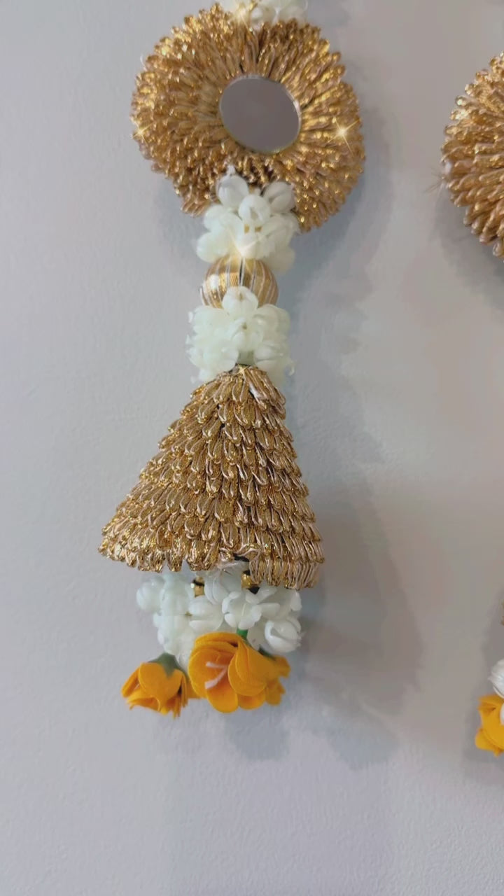 A golden bell adorned with white mogra flowers and mirrors creates a captivating fusion of elegance and luxury.