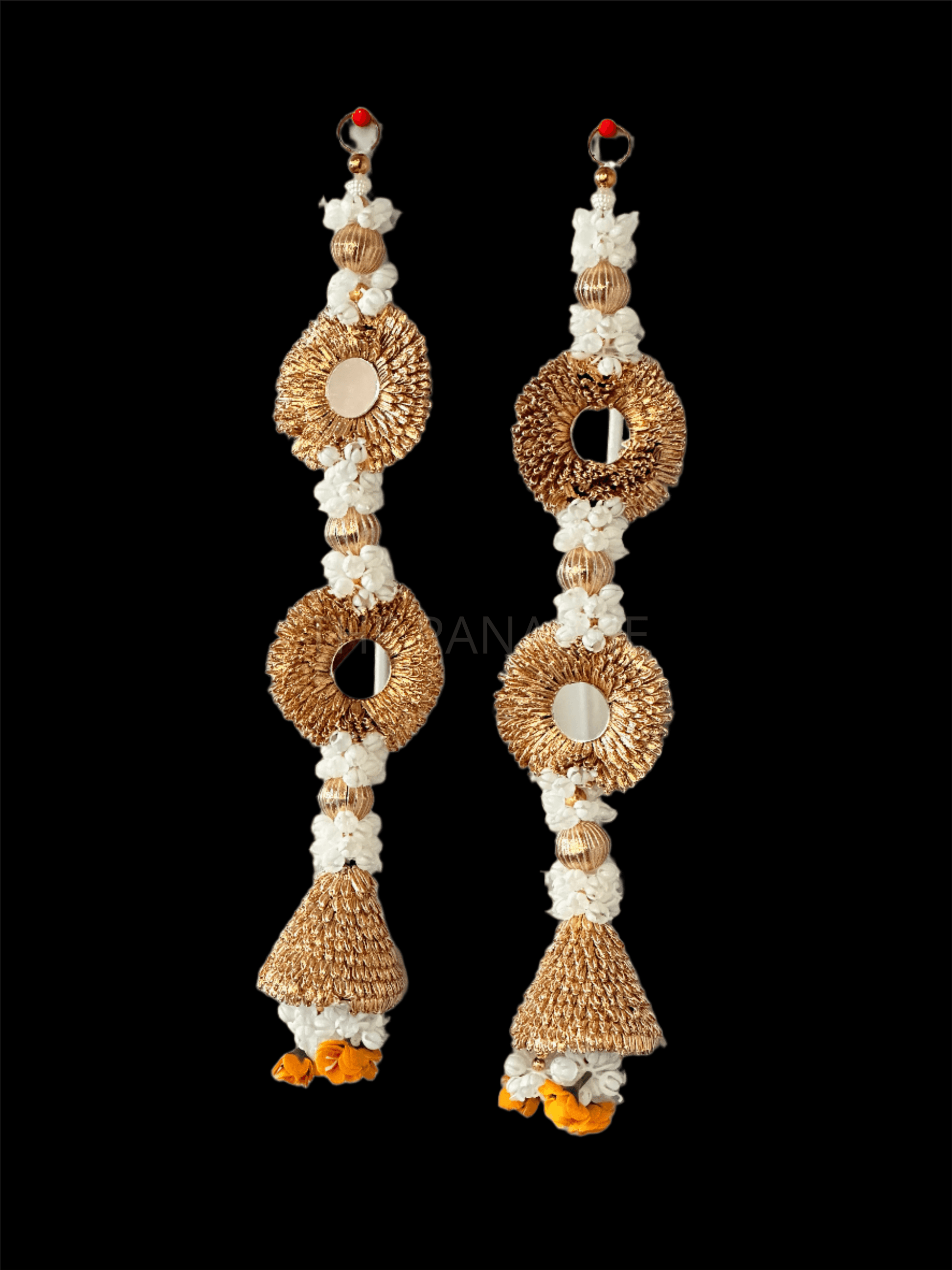 Interspersed among the mogra flowers are small mirrors, strategically placed to catch and reflect the light, creating a mesmerizing interplay of sparkle and shine. As light dances upon them, the mirrors add a touch of glamour and sophistication to the arrangement, elevating its visual appeal.