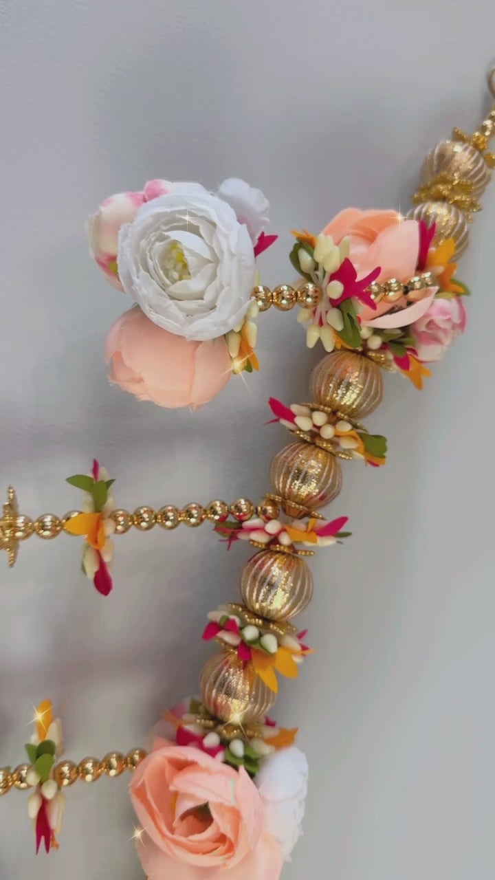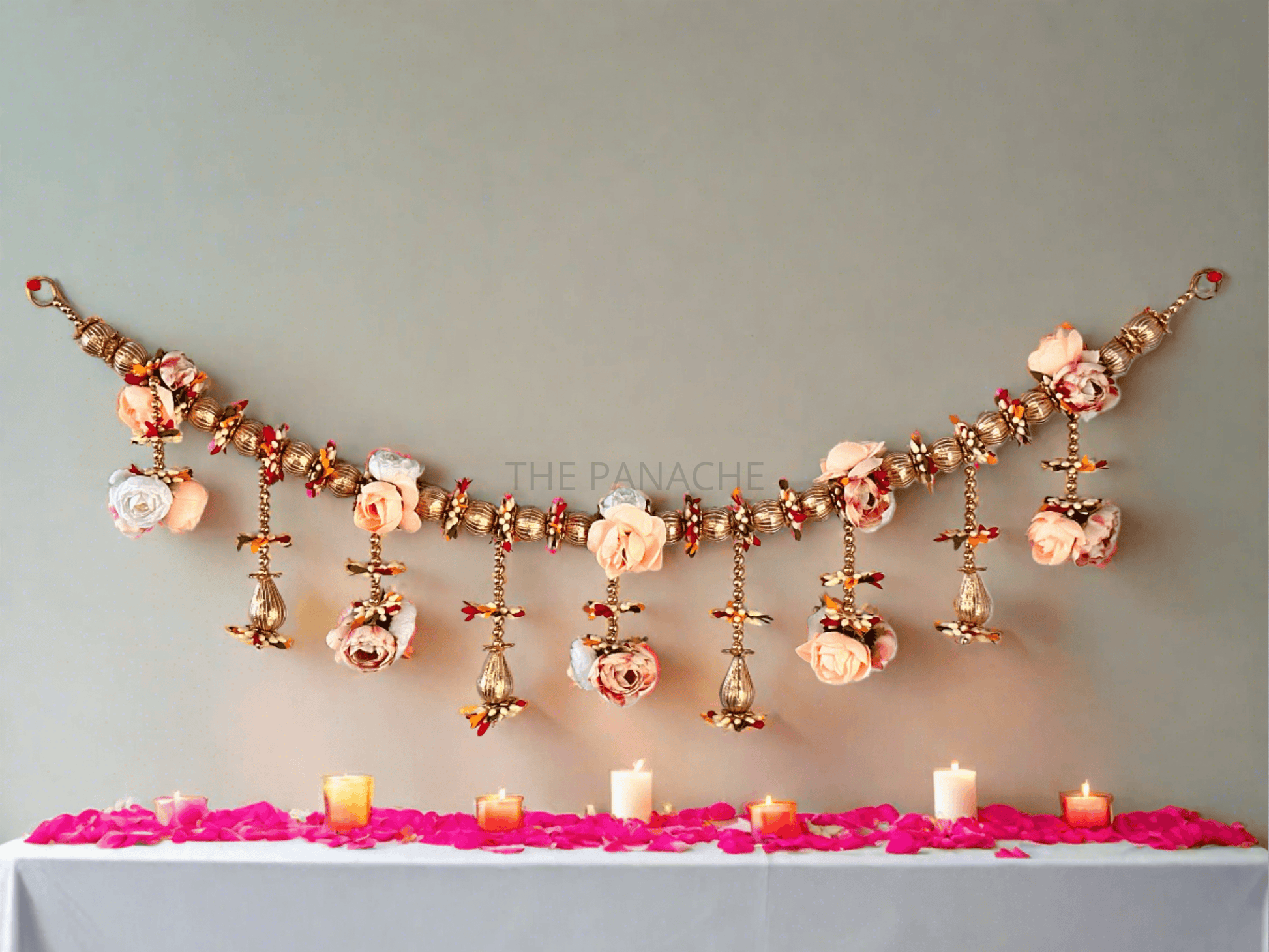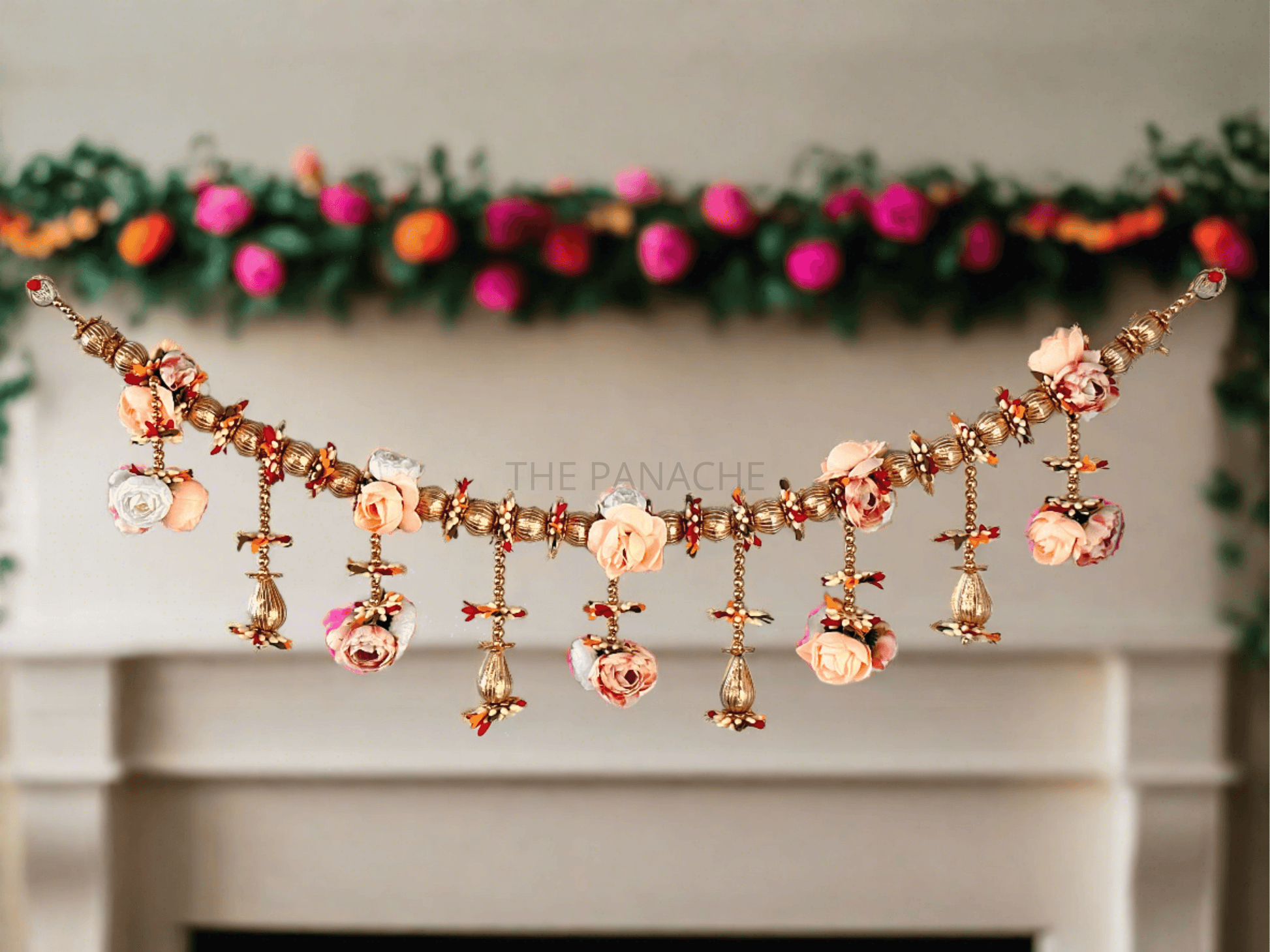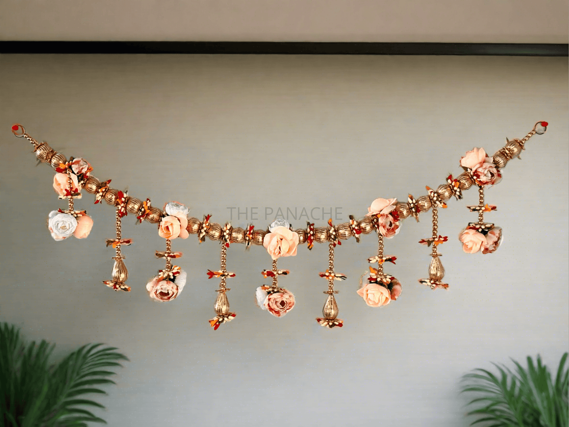 Adorning the toran are intricately woven strands of golden beads, their shimmering presence adding a sense of opulence and glamour to the arrangement. These golden beads catch the light, casting a warm and inviting glow that enhances the beauty of the peach roses.