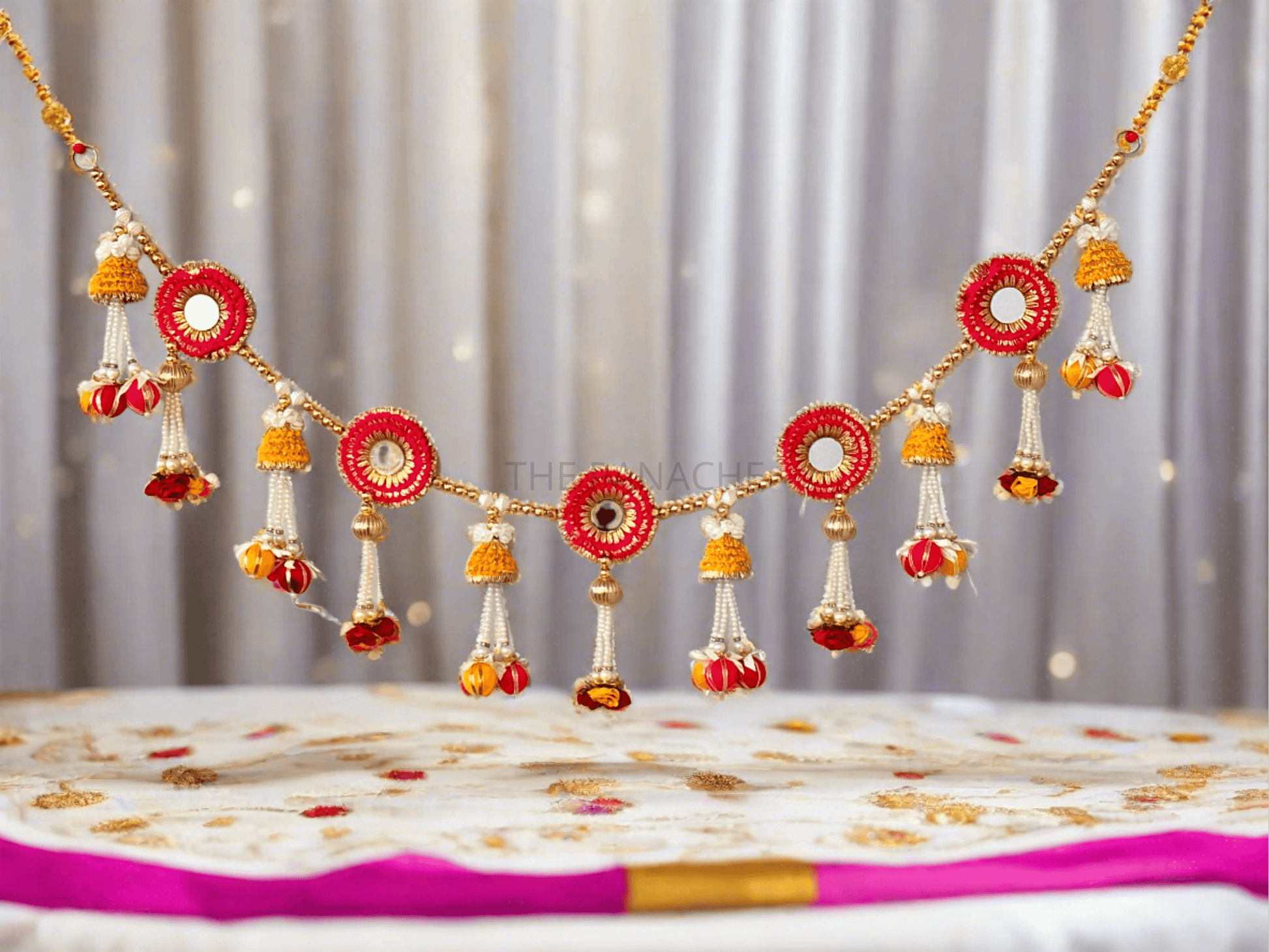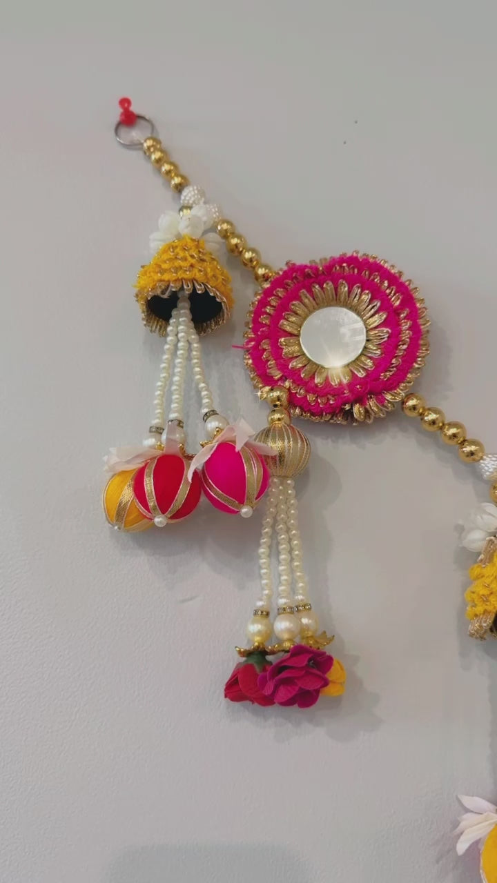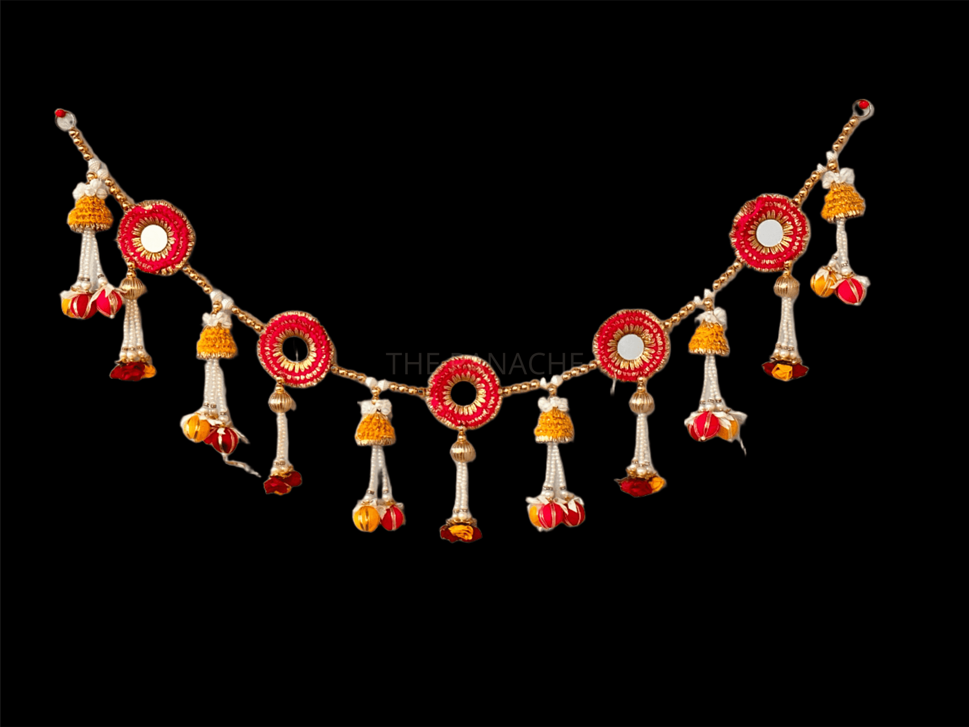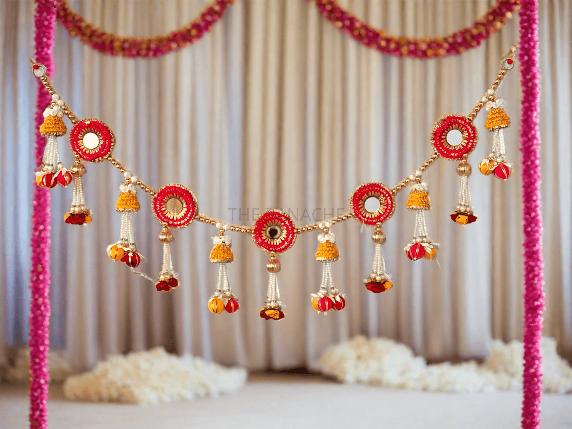 Suspended from slender strings or ribbons, the pink round hangings and yellow cone-shaped torans create a visually captivating display, swaying gently in the breeze and infusing the space with warmth and charm. Whether hung above doorways, windows, or as part of a festive backdrop, they add a festive touch to any occasion.