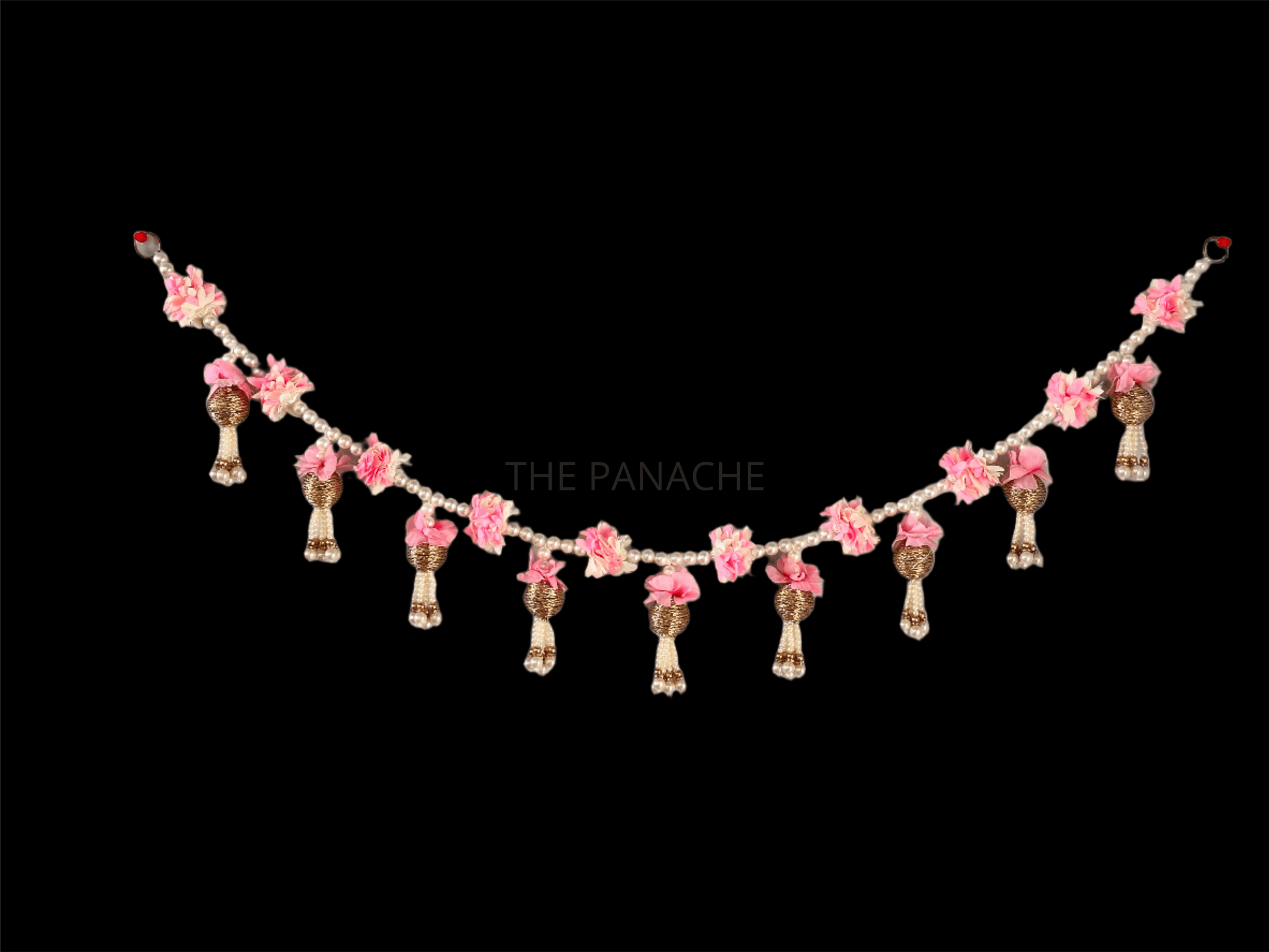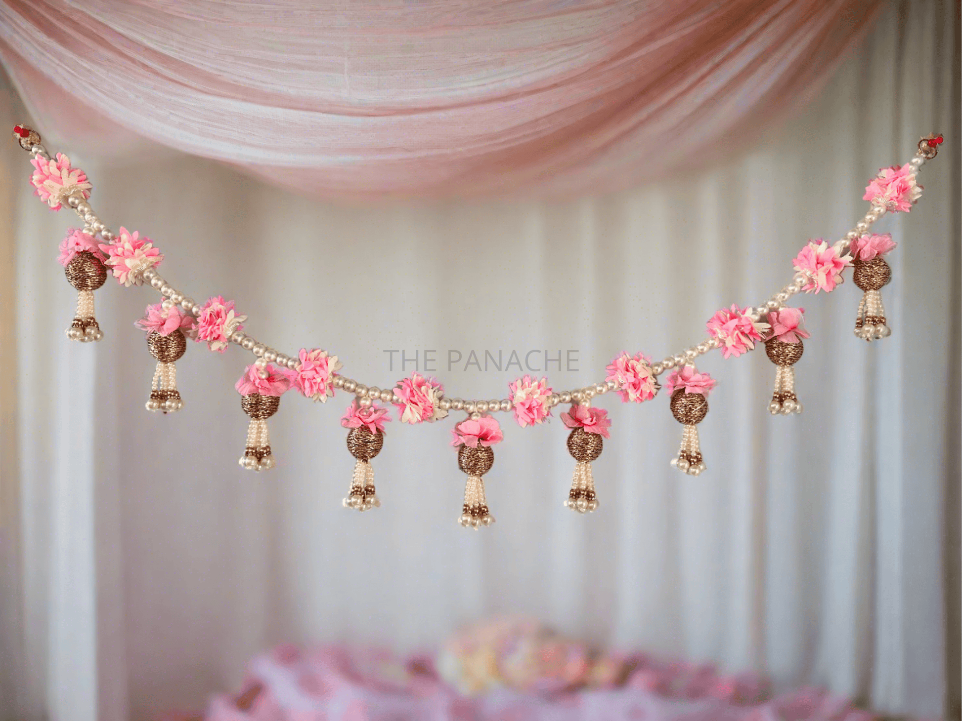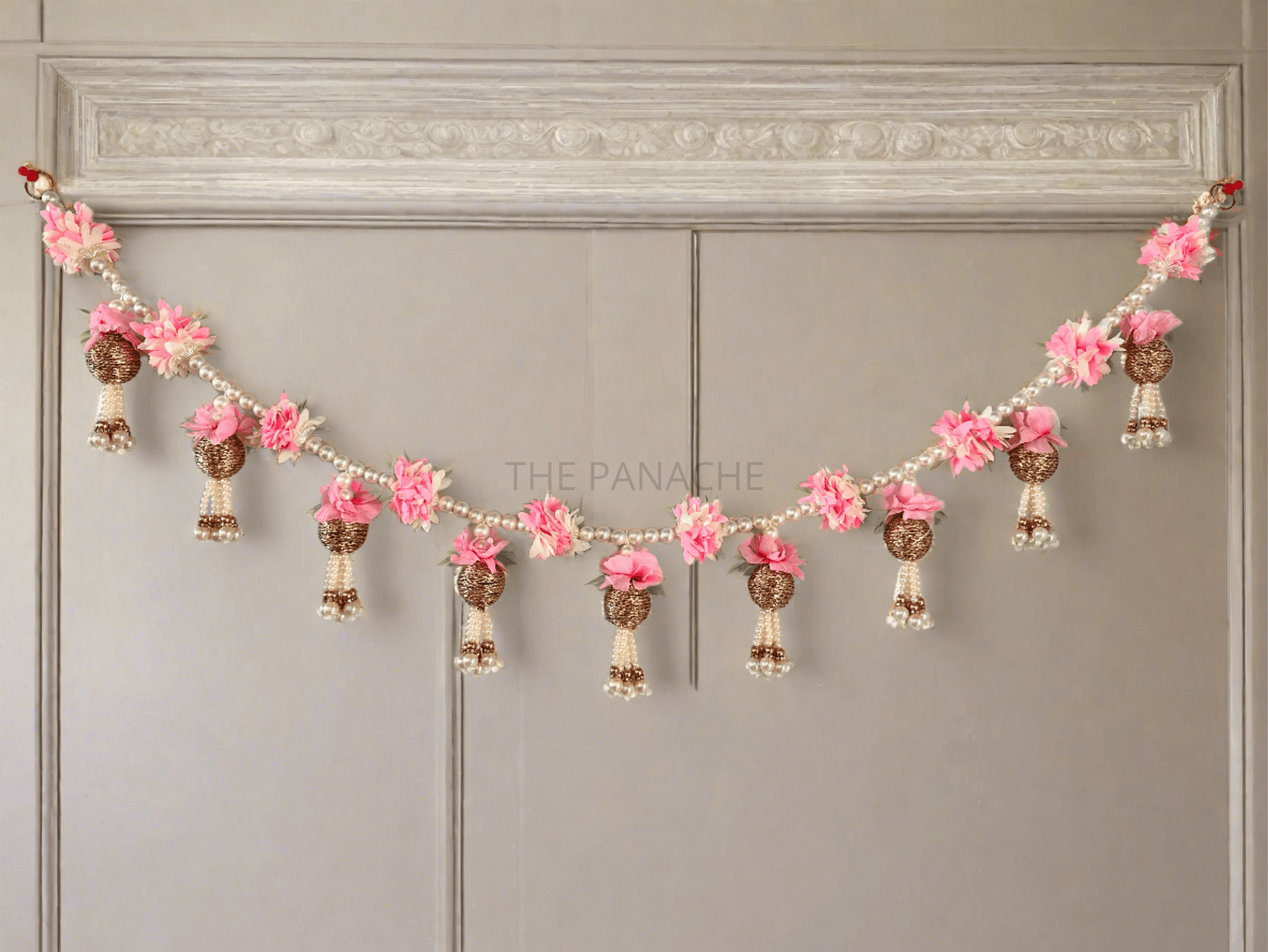 As guests admire the beauty of the toran, they are transported to a world of enchantment and beauty, where every detail is a testament to craftsmanship and artistry. The delicate pink flowers, lustrous pearls, and gleaming golden balls come together to create a truly mesmerizing display, inviting all who behold it to revel in its splendor.
