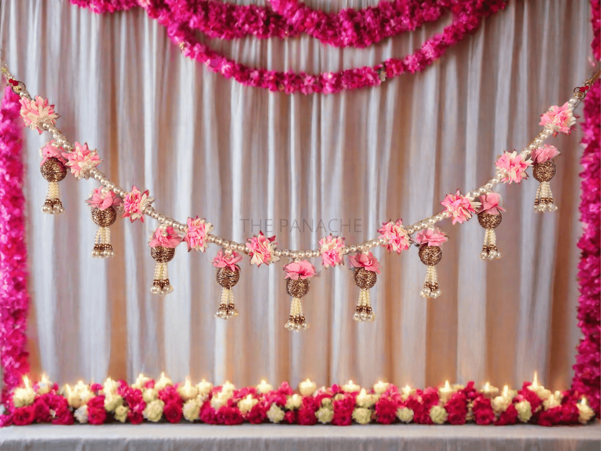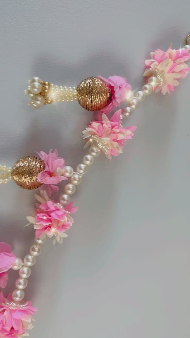 Suspended from a golden chain or ribbon, the pink flower, pearls, and golden ball toran creates a captivating focal point, infusing any space with elegance and charm. Whether hung above a doorway, window, or as part of a festive backdrop, it adds a touch of glamour and celebration to any occasion.