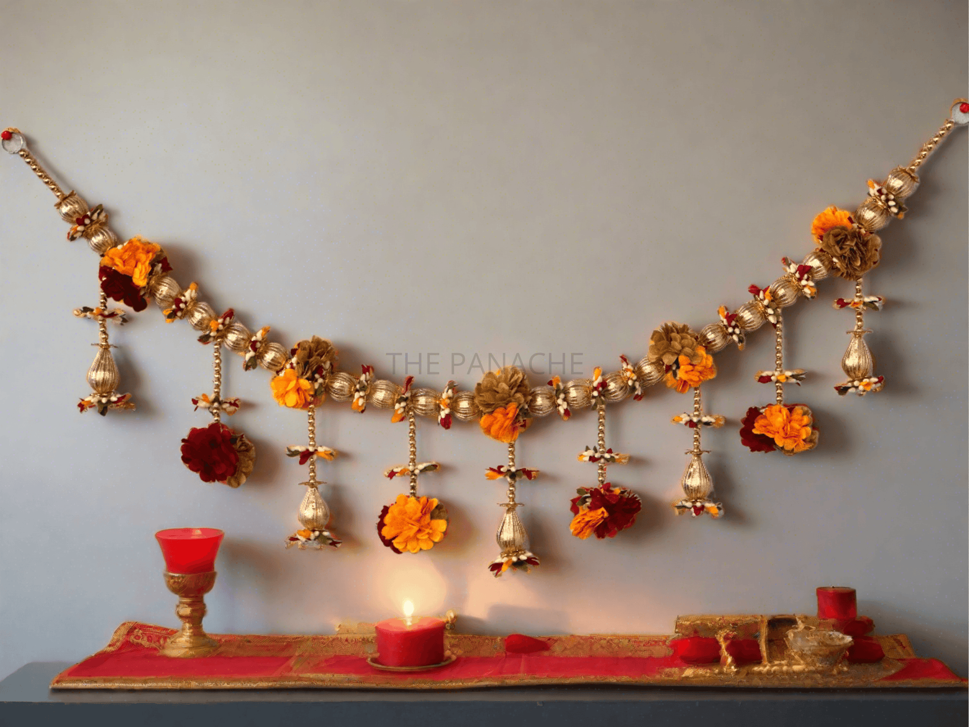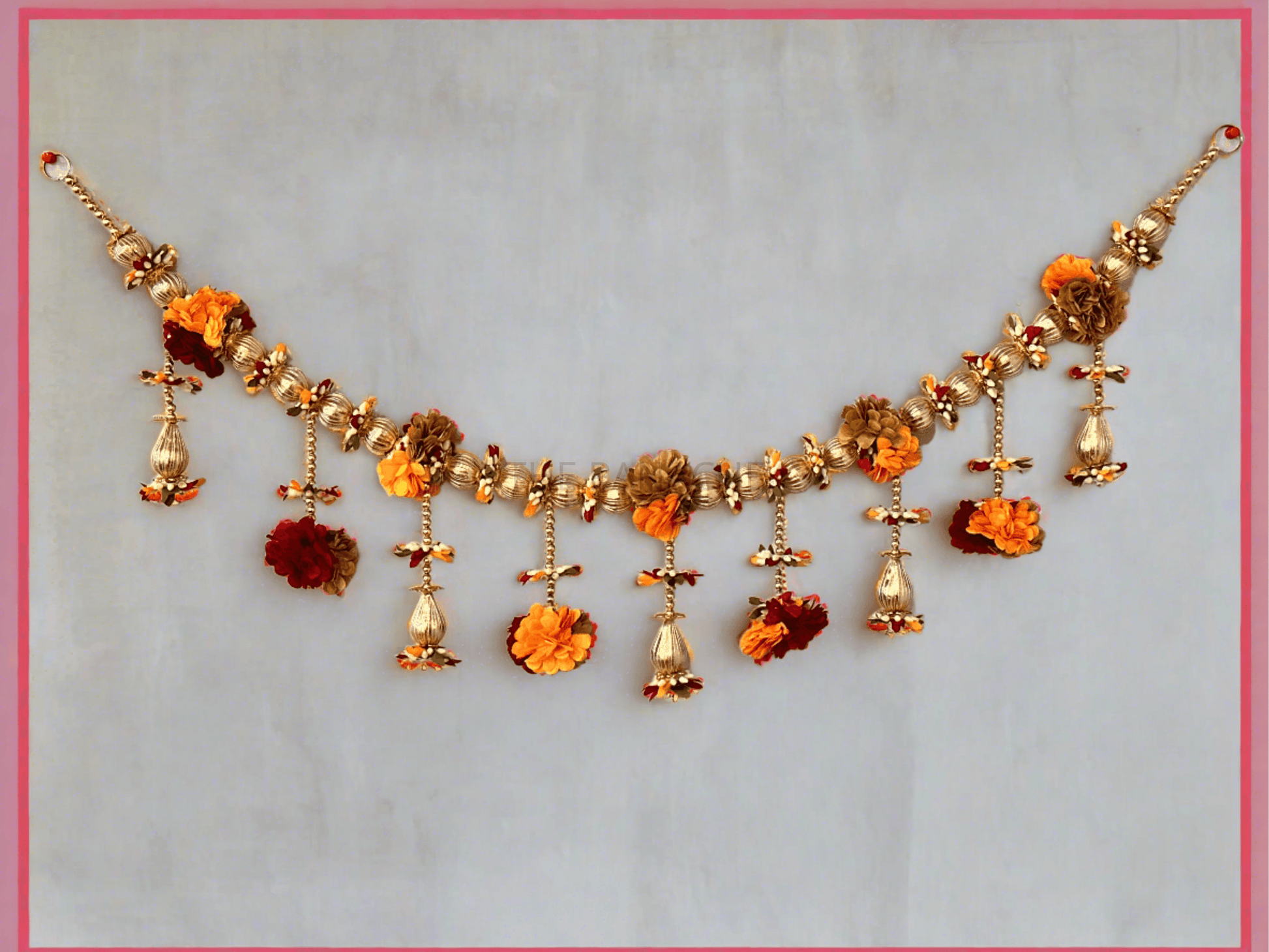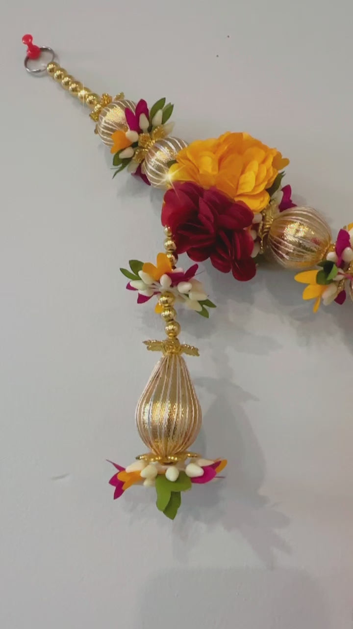 A toran featuring red, brown, and yellow blossoms adorned with golden beads and round golden fabric balls presents a rich and opulent decorative piece.