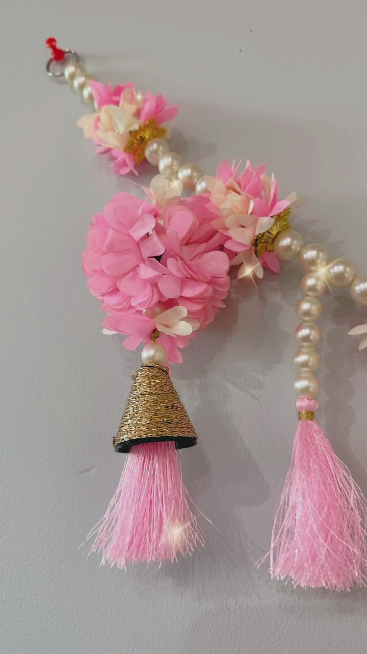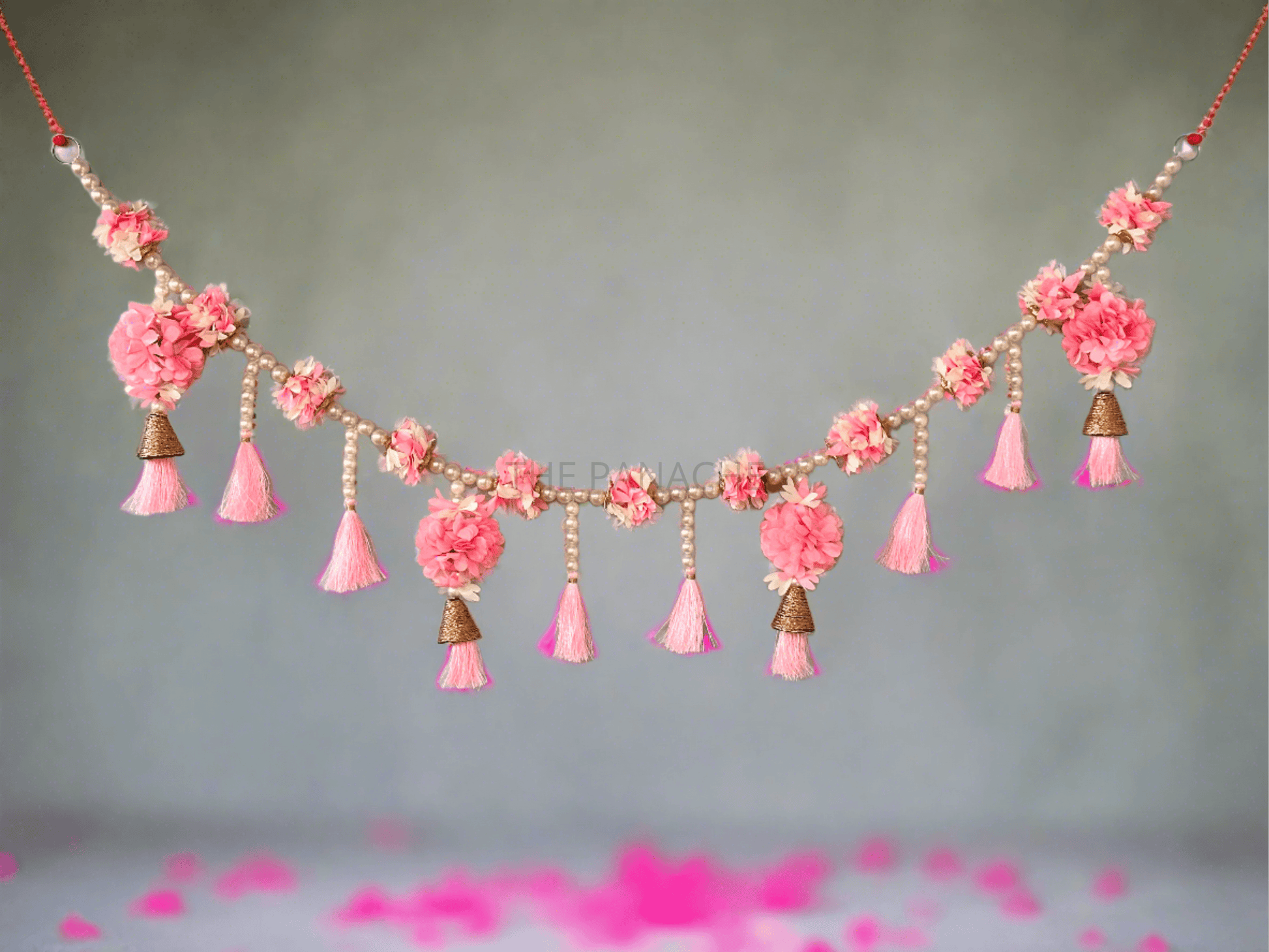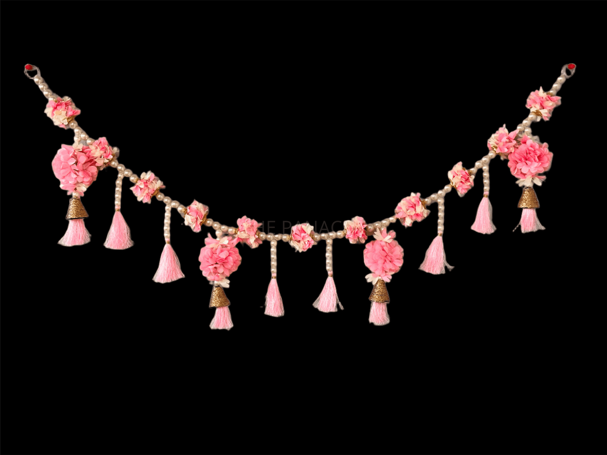 A toran featuring pink blossoms and white pearls offers a delicate and elegant decorative accent.