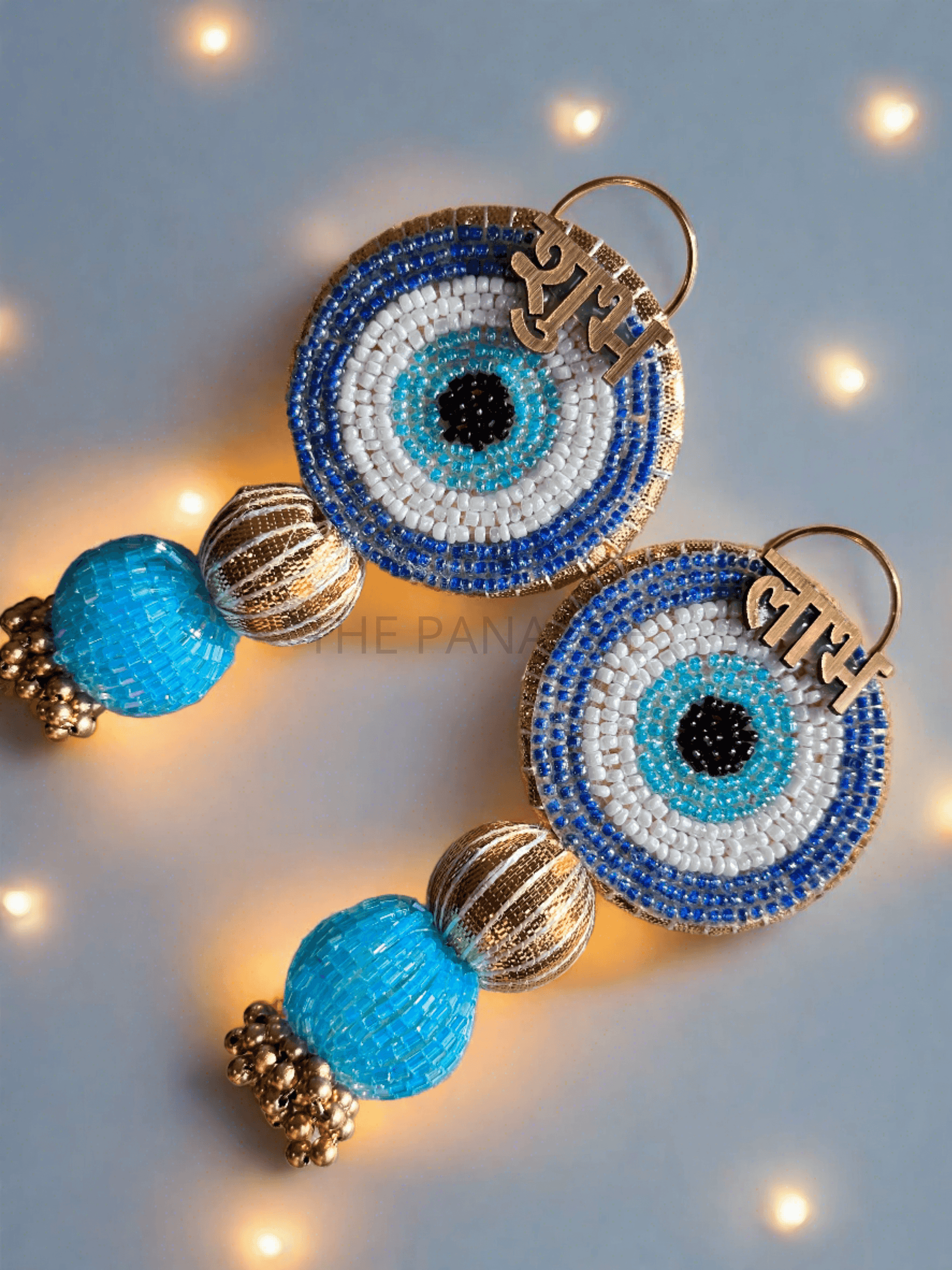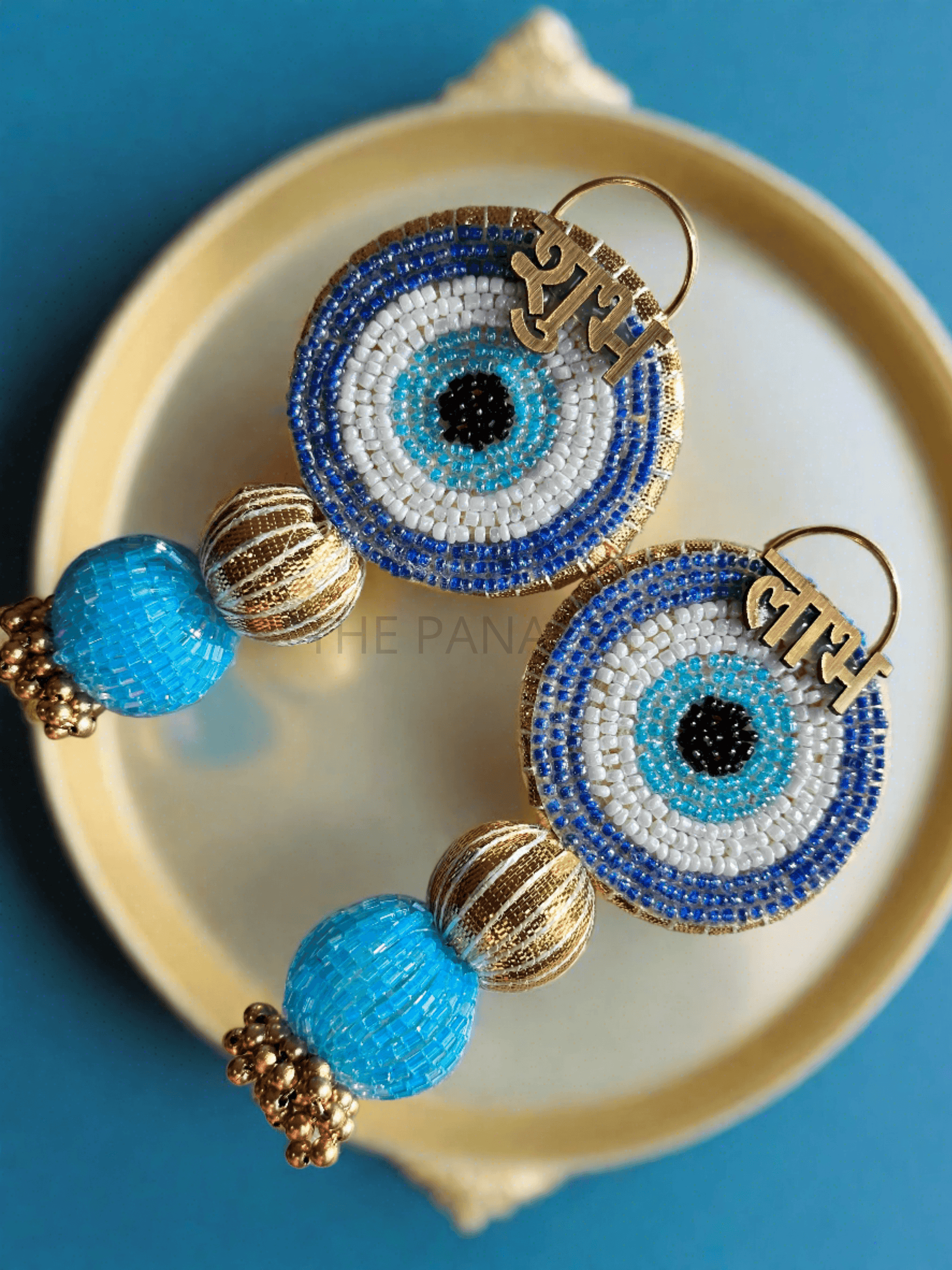 Visualize the miniature Subh Labh designed in the shape of the revered Evil Eye motif, crafted in a soothing shade of blue to symbolize protection and ward off negative energy. Each intricate detail of the Evil Eye is accentuated by delicate golden beads, enhancing its mystical allure.