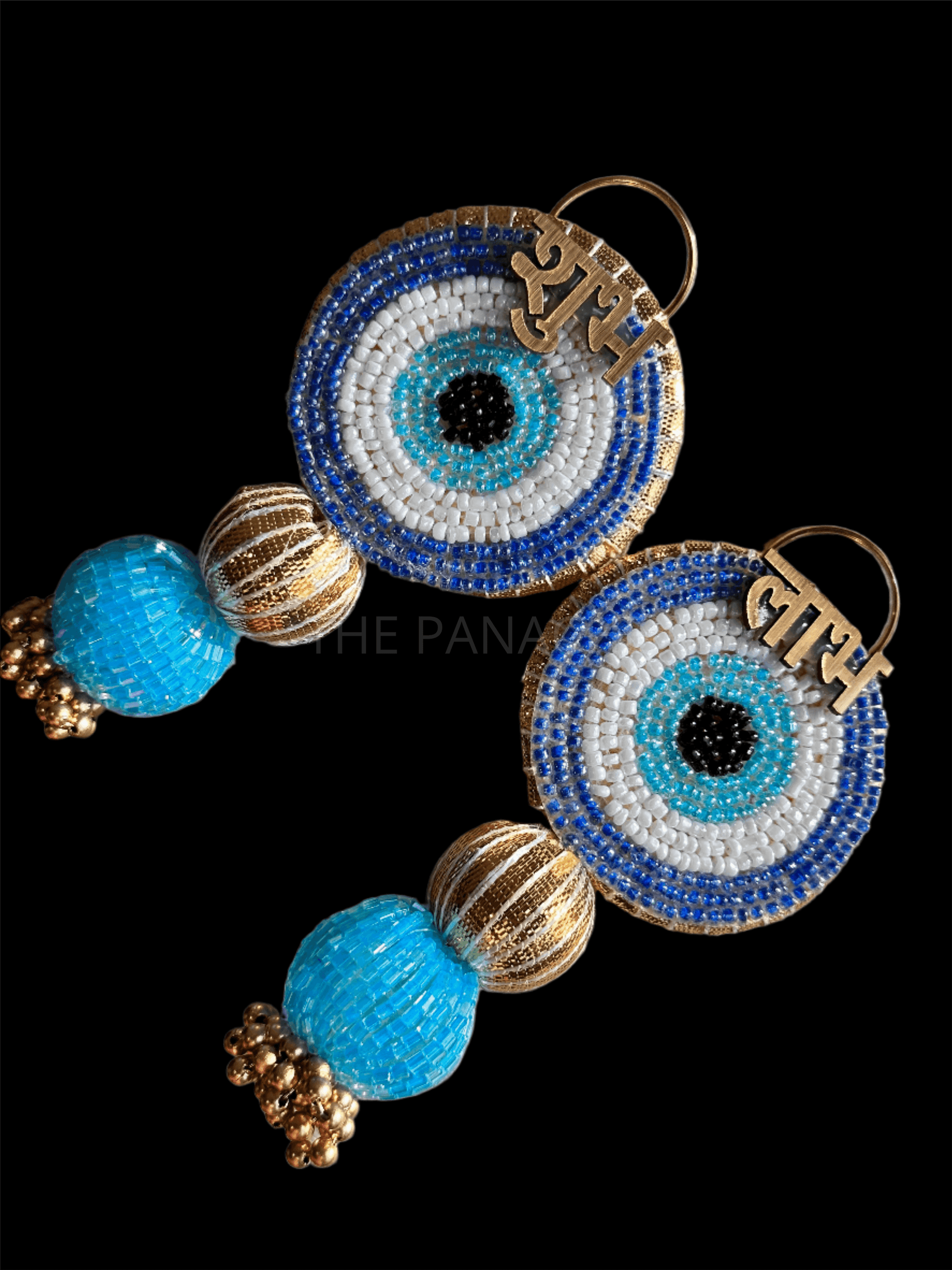 Picture round blue and golden balls delicately interspersed throughout the design, adding a touch of whimsy and elegance to the ensemble. The blue balls complement the Evil Eye motif, while the golden balls symbolize prosperity and abundance.