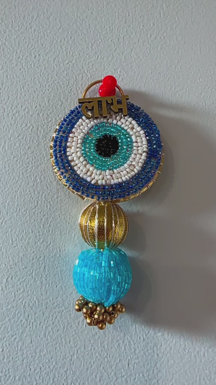 Envision a charming blue Evil Eye Mini Subh Labh adorned with small golden beads and round blue and golden balls, creating a delightful and protective decorative piece.