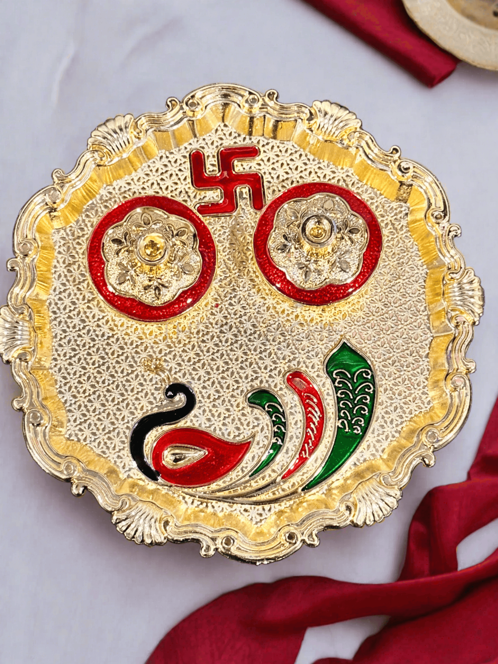 As guests admire the exquisite craftsmanship of the peacock-designed kankavati, they are captivated by its beauty and symbolism. The rich gold color and intricate detailing create a captivating focal point that evokes a sense of awe and admiration, making it a cherished addition to any home or ceremonial setting.