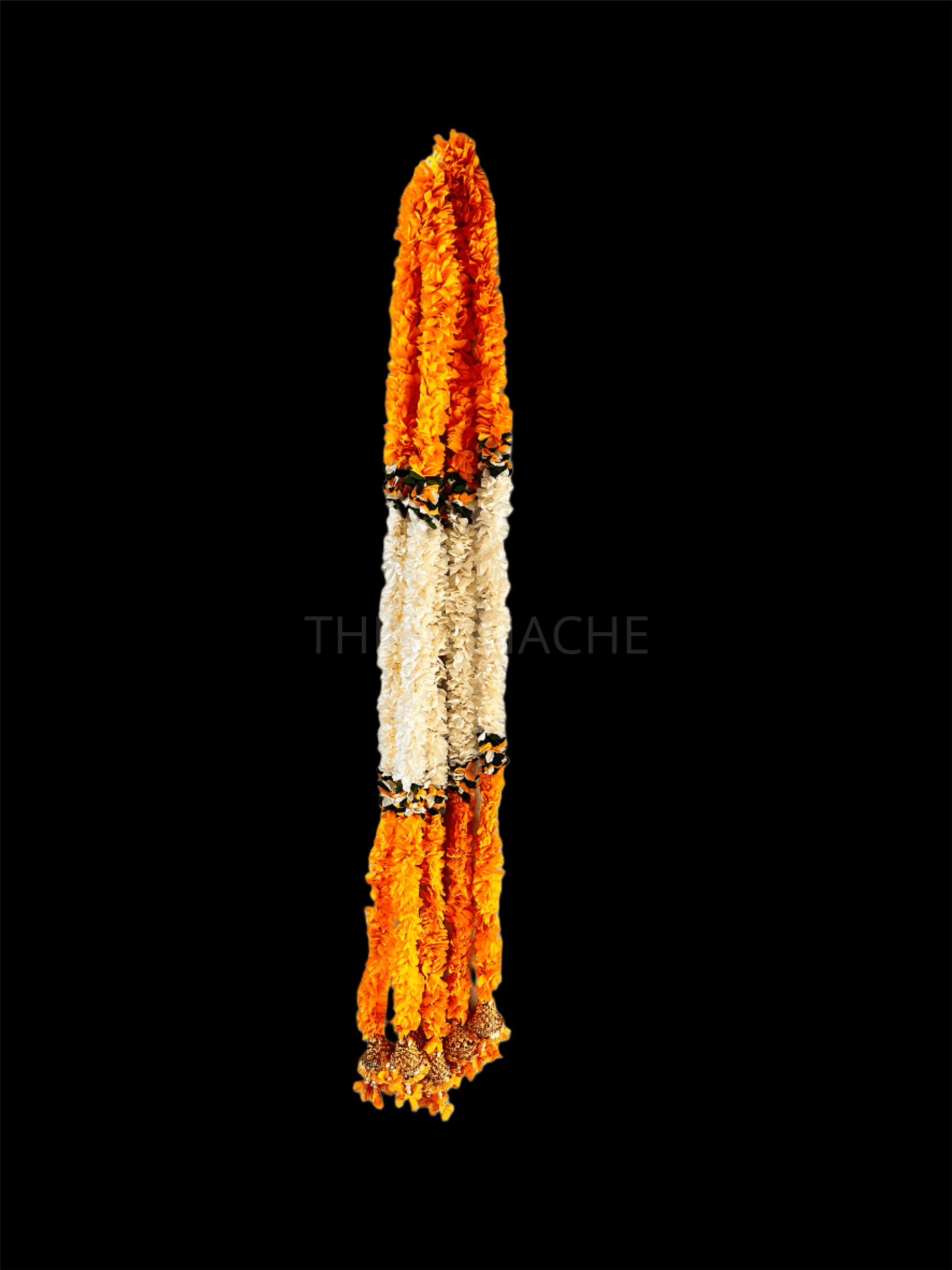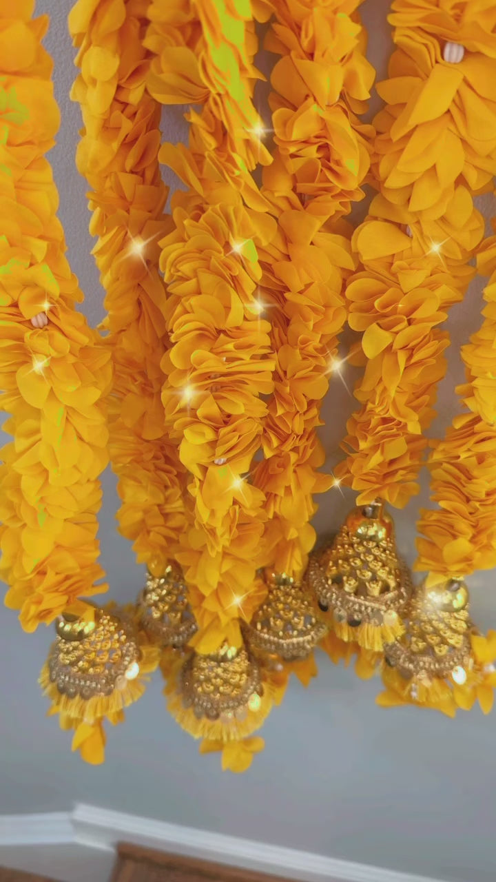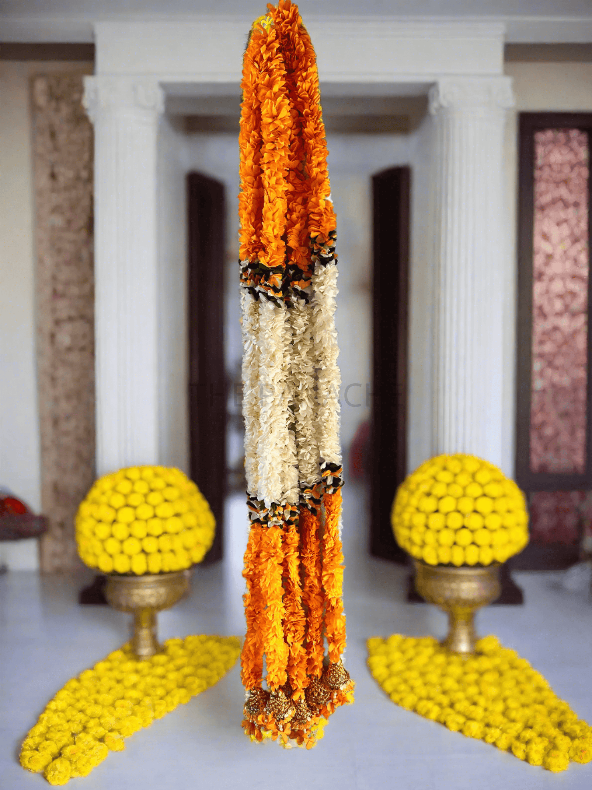 Picture stunning 5-foot-long hangings adorned with bright yellow and pure white floral arrangements, elegantly draped and emanating grace. Decorating the end of each hanging are gleaming golden bells, infusing a sense of opulence and allure.