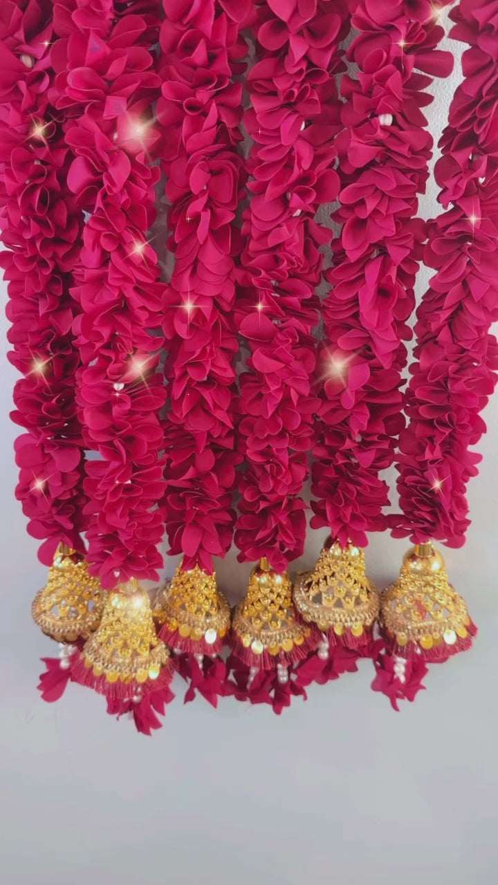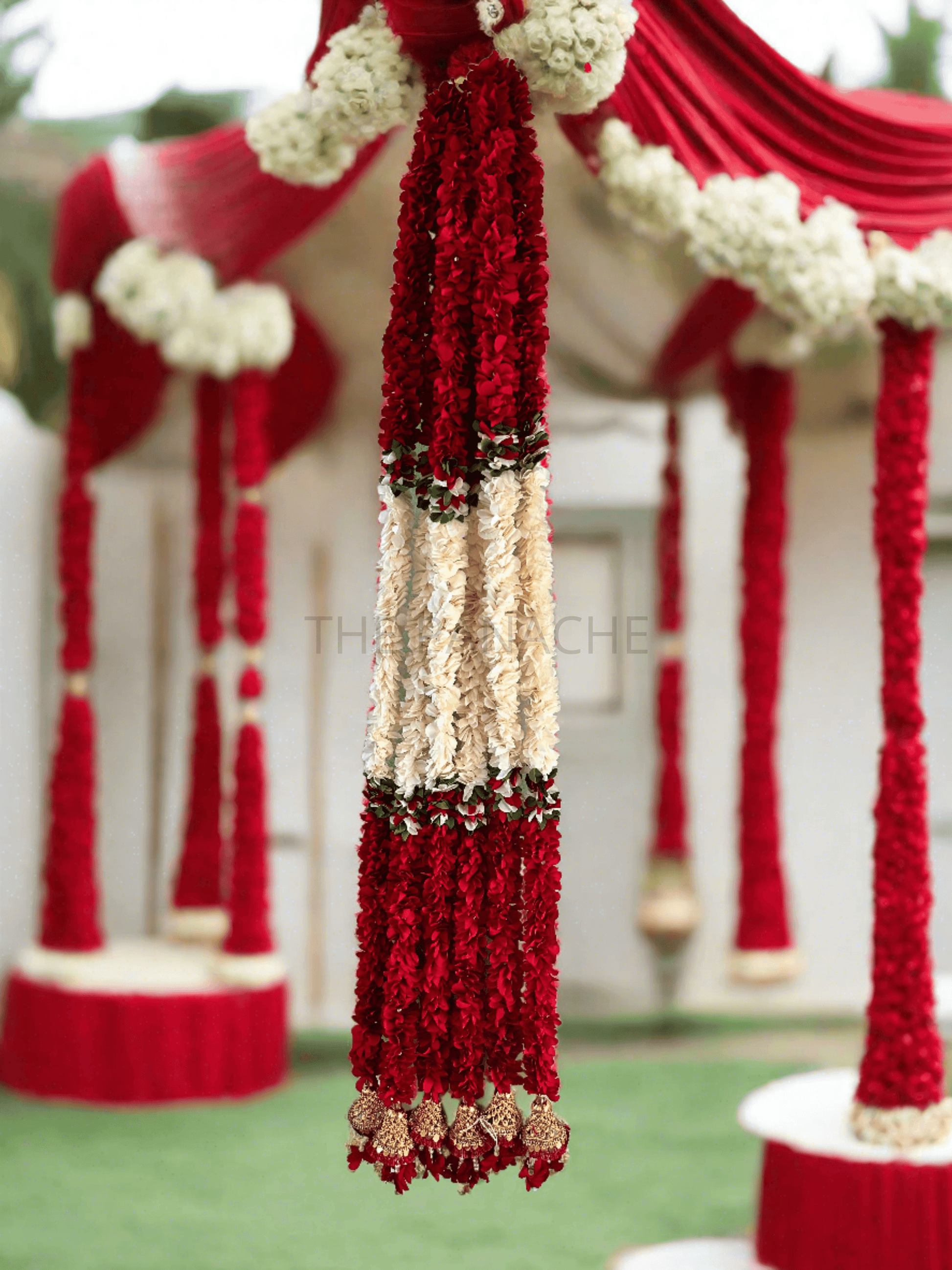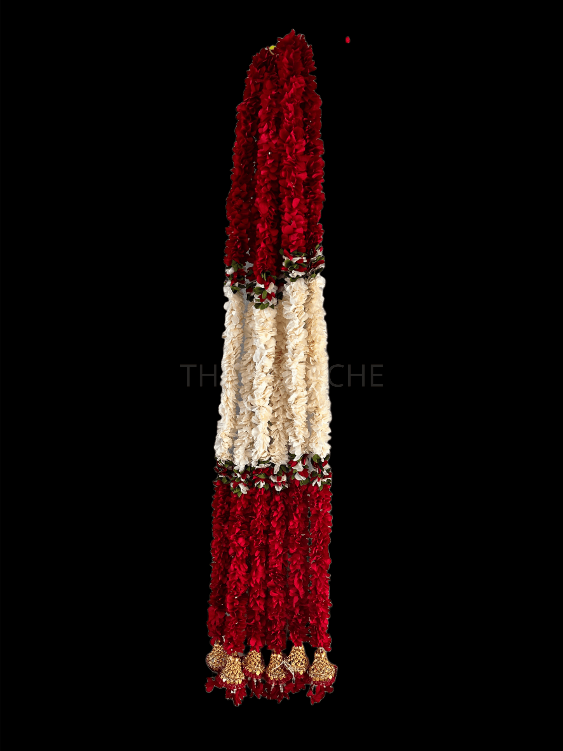 Envision exquisite 5-foot-long hangings adorned with vibrant red and pristine white floral arrangements, gracefully draping and radiating elegance. Adorning the end of each hanging are shimmering golden bells, adding a touch of opulence and charm to the ensemble.