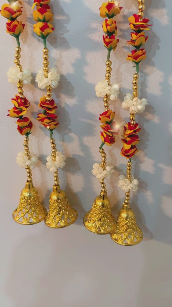 Visualize a magnificent hanging adorned with fragrant white mogra, vibrant red and yellow flowers, interspersed with shimmering gold beads, and crowned with majestic golden bells at the ends, creating a breathtaking display of beauty and opulence.