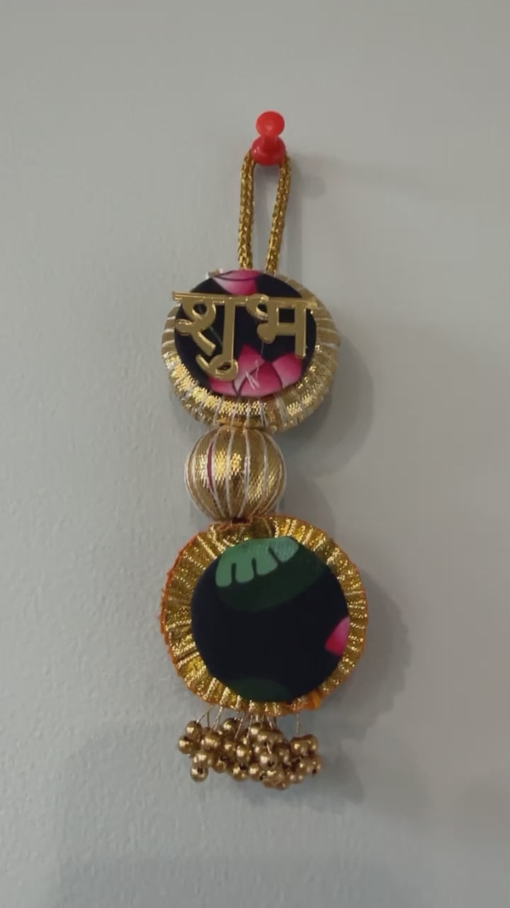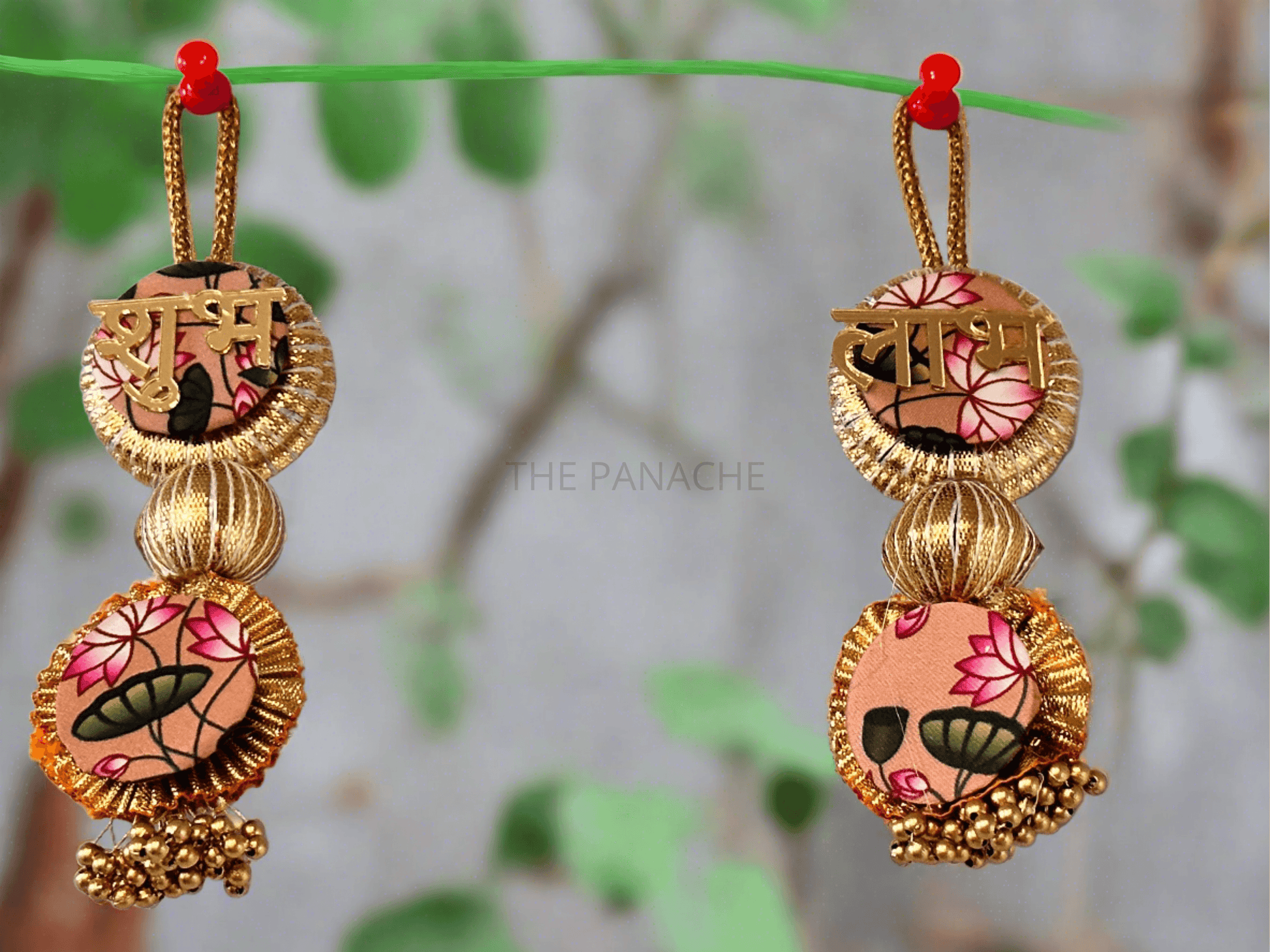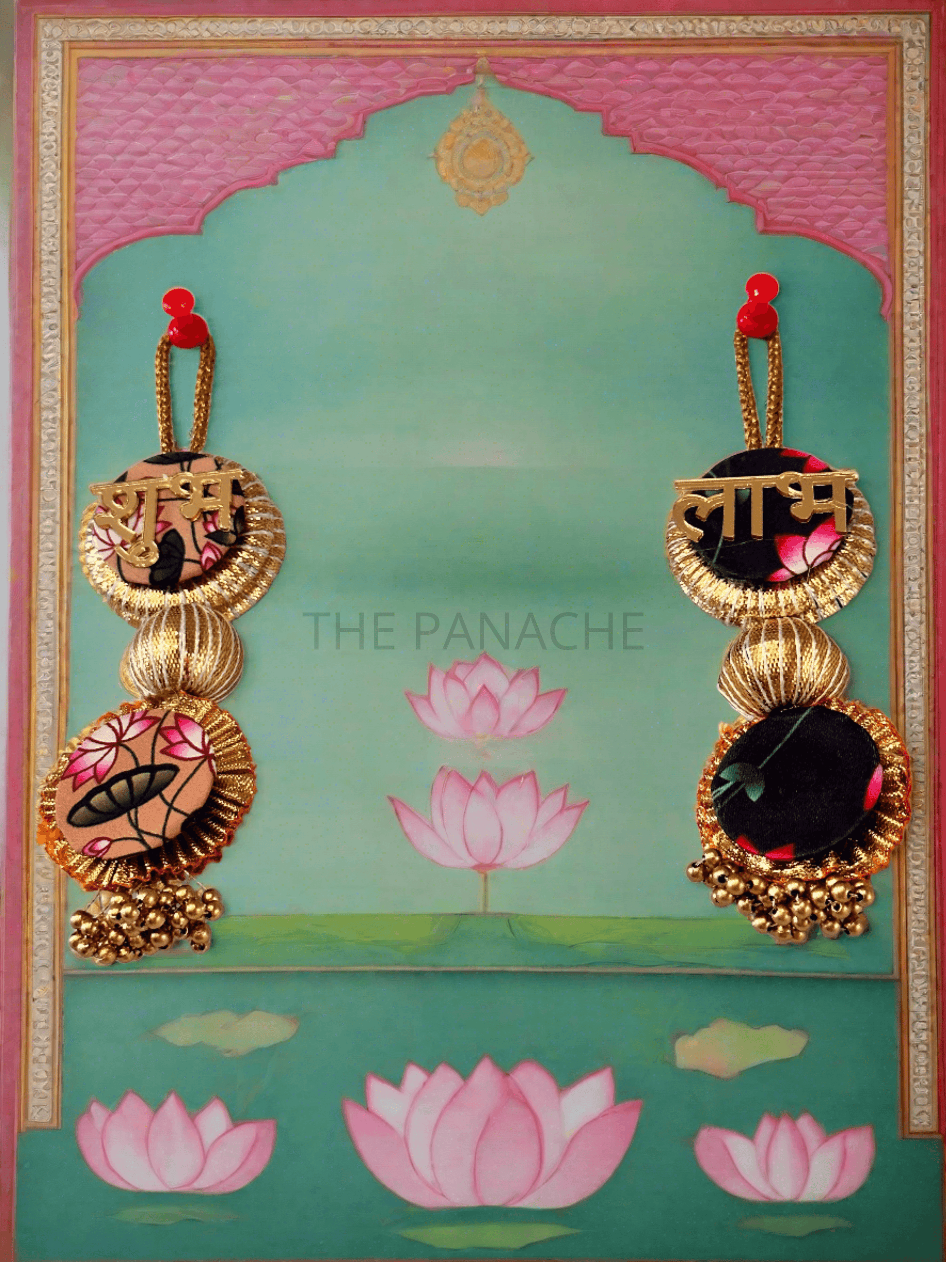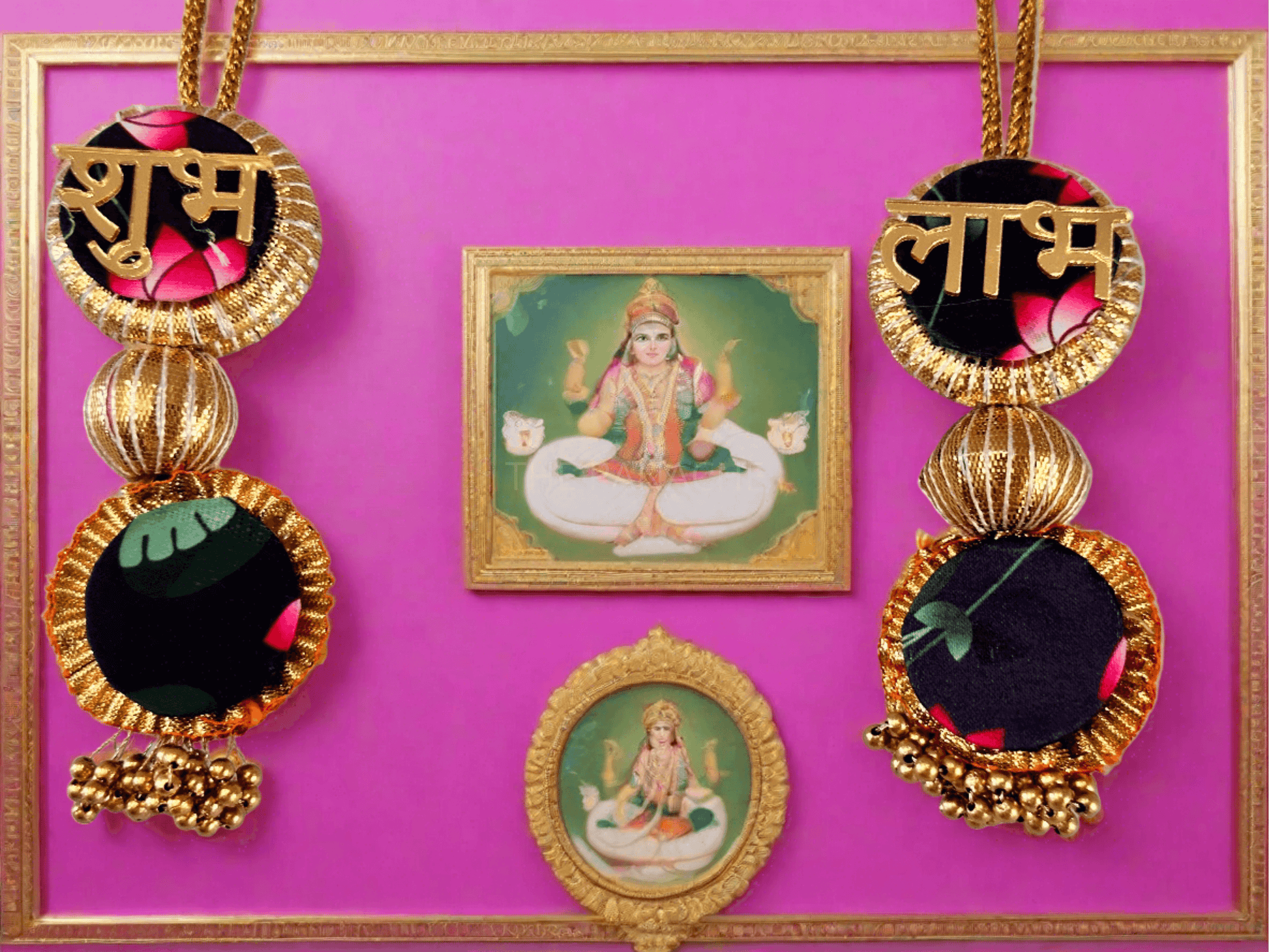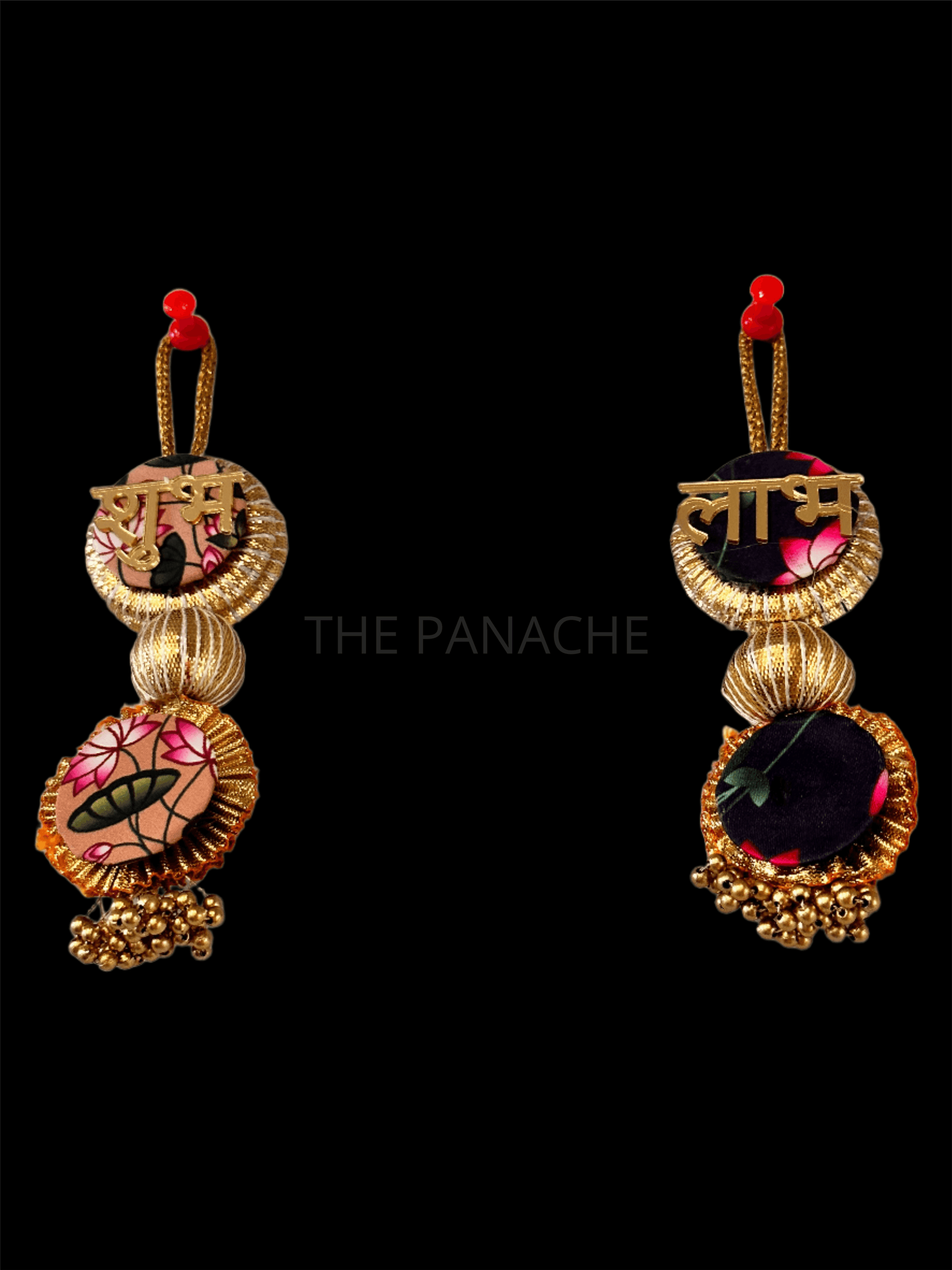 Imagine the elegant gold lettering of "Subh" and "Labh" delicately inscribed on both sides of the decorations, shimmering in the light and exuding blessings of auspiciousness and prosperity. The gold accents add a touch of opulence and sophistication, enhancing the overall beauty and elegance of the decorations.