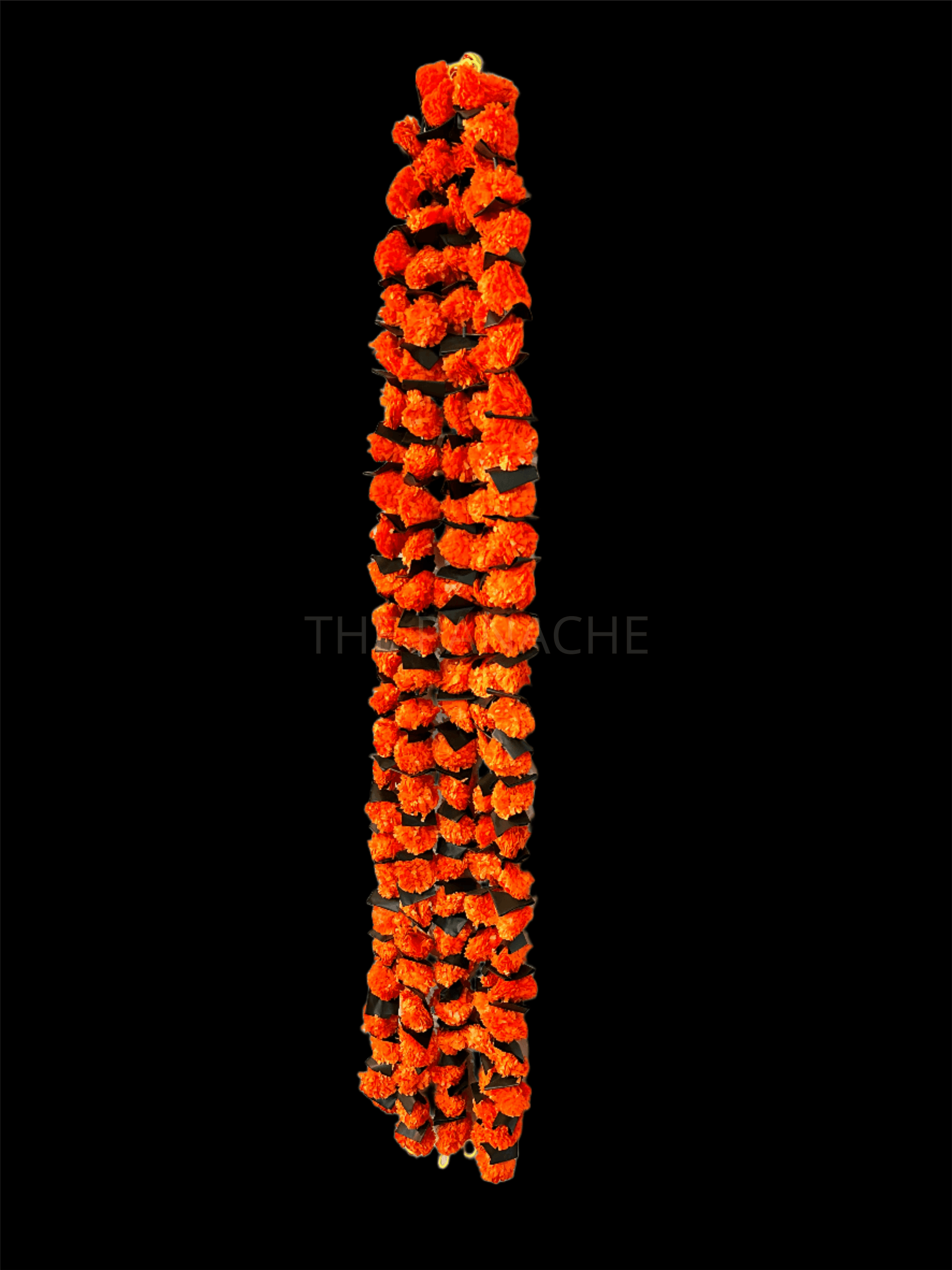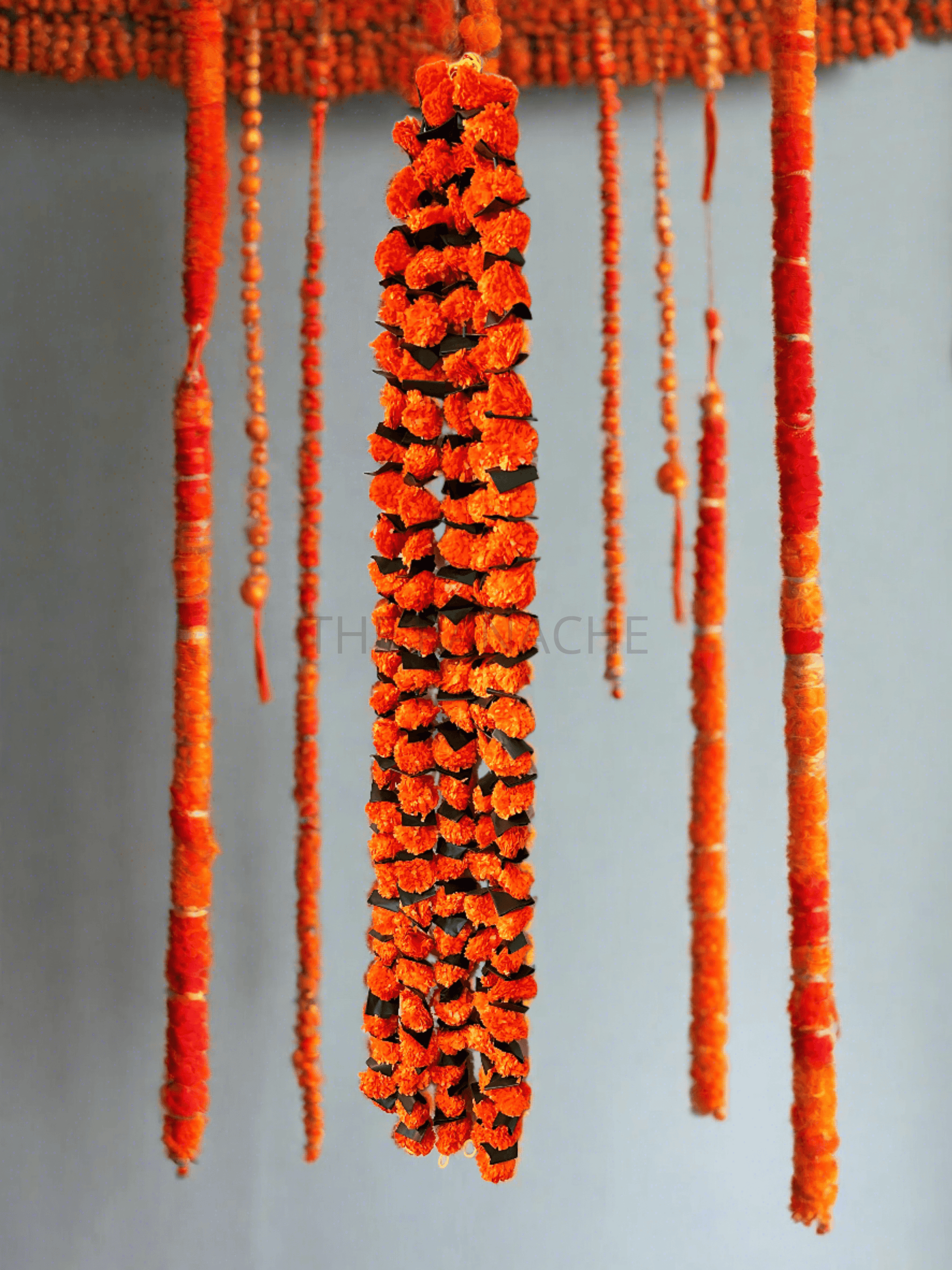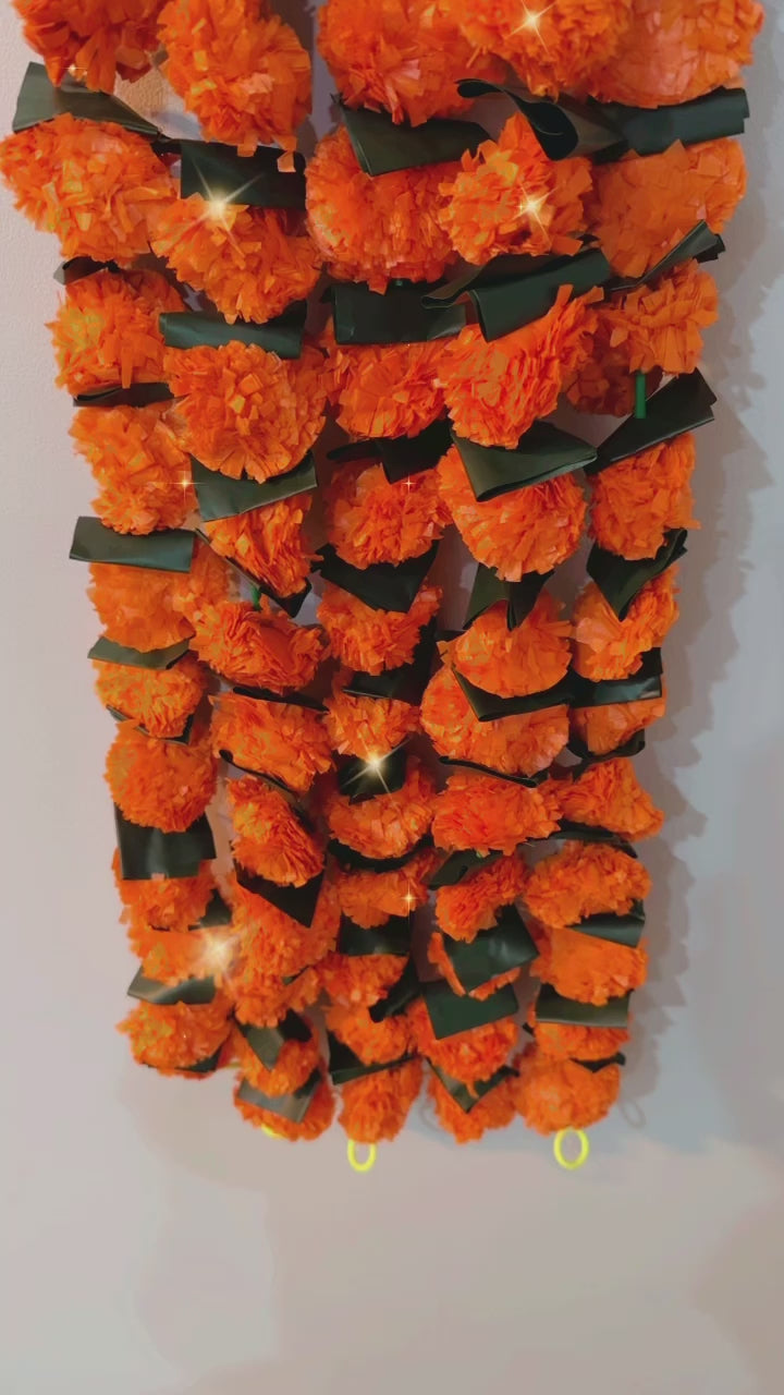Envision striking marigold flower hangings featuring vibrant dark orange blossoms interspersed with lush green leaves, creating a captivating and visually dynamic display.