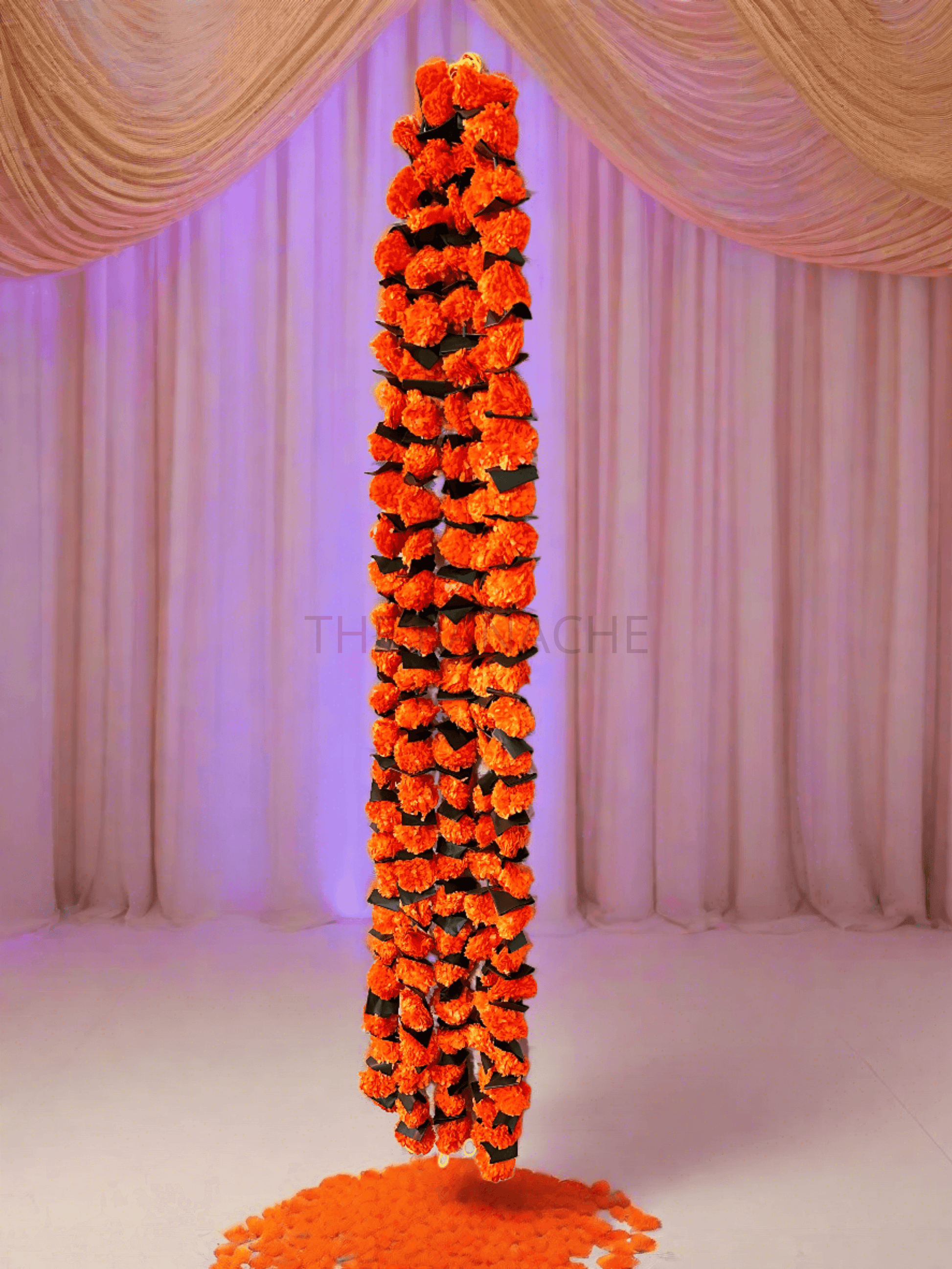 As guests admire the beauty of the marigold flower hangings, they are transported to a world of natural splendor and vitality, where every detail exudes warmth and radiance. The harmonious combination of dark orange marigold flowers with lush green leaves creates a captivating spectacle that is both visually stunning and emotionally uplifting, making these hangings a cherished addition to any setting.