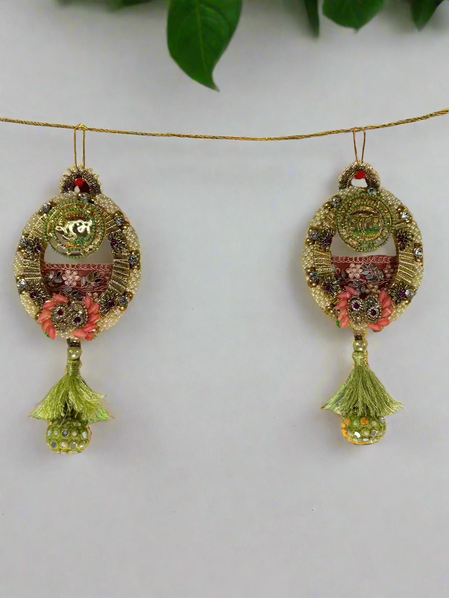 Shubh Labh" hanging ornaments, traditional Indian decorations symbolizing prosperity and good fortune. Each circular ornament features intricate beadwork, embroidery, and sacred motifs, which represents divine energy. The upper sections contain ornamental medallions surrounded by colorful floral designs, while vibrant green tassels hang from the bottom, adding elegance to the pieces.
