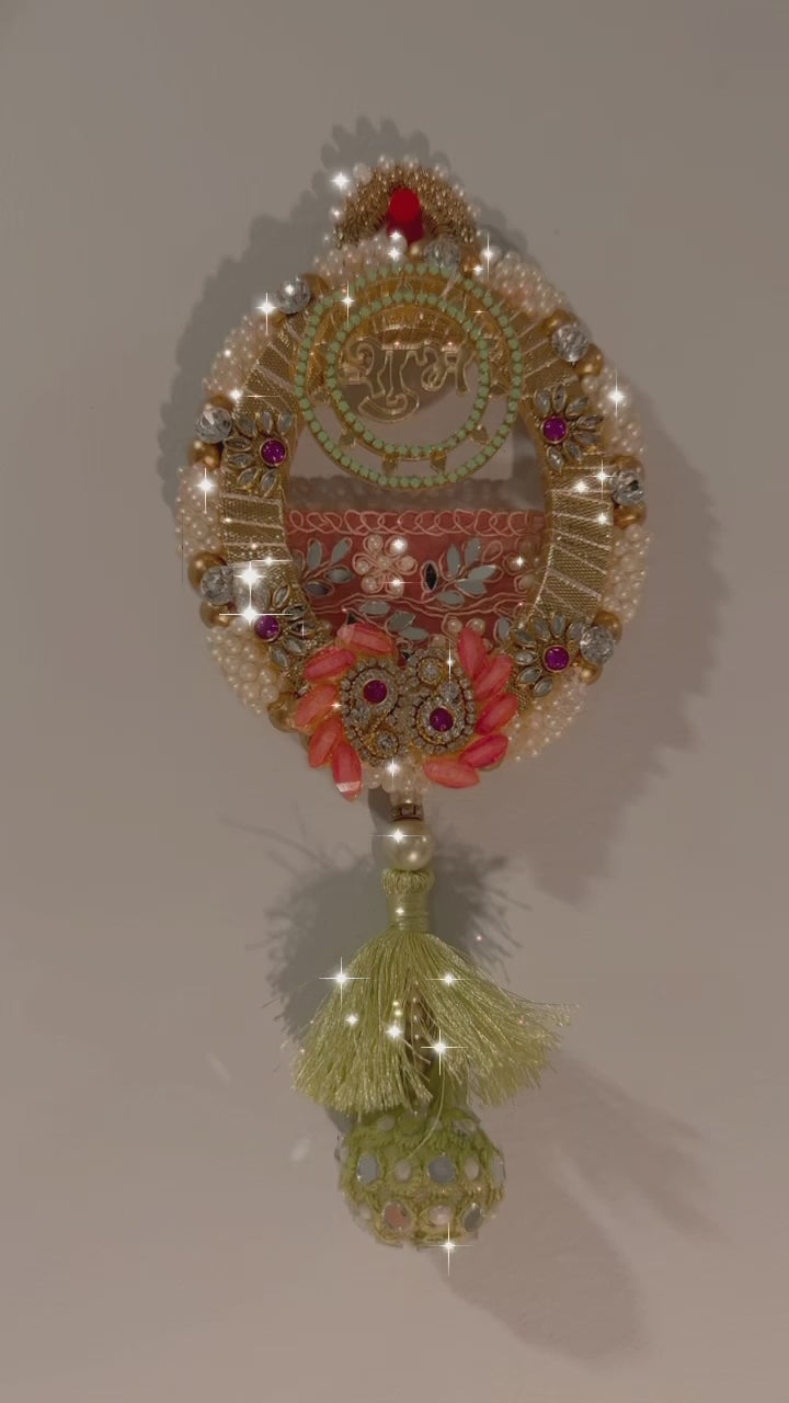Typically displayed at the entrance of homes or near sacred spaces during festivals like Diwali, these decorative items invite positivity and auspiciousness into the household. The combination of colors—gold, green, and peach—enhances their festive appeal, making them an essential part of traditional Indian decor aimed at attracting good luck and well-being.