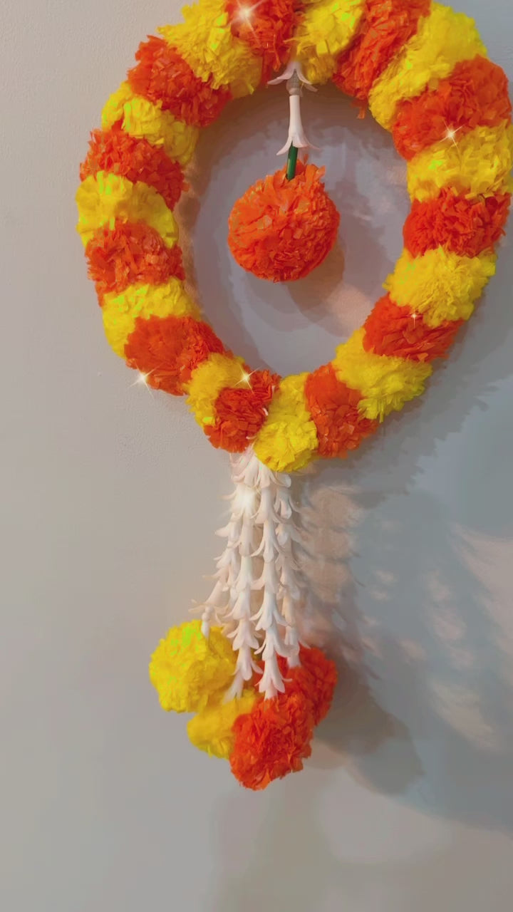 As the orange and yellow marigold pendulum hanging sways gently in the breeze, it becomes a radiant symbol of joy, abundance, and celebration, enhancing the atmosphere with its vibrant presence. Its timeless beauty and graceful design make it a cherished addition to any festive occasion or gathering.