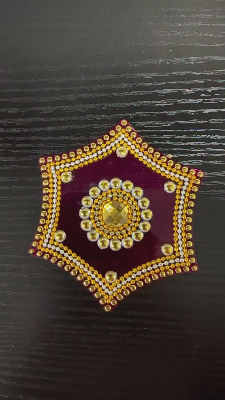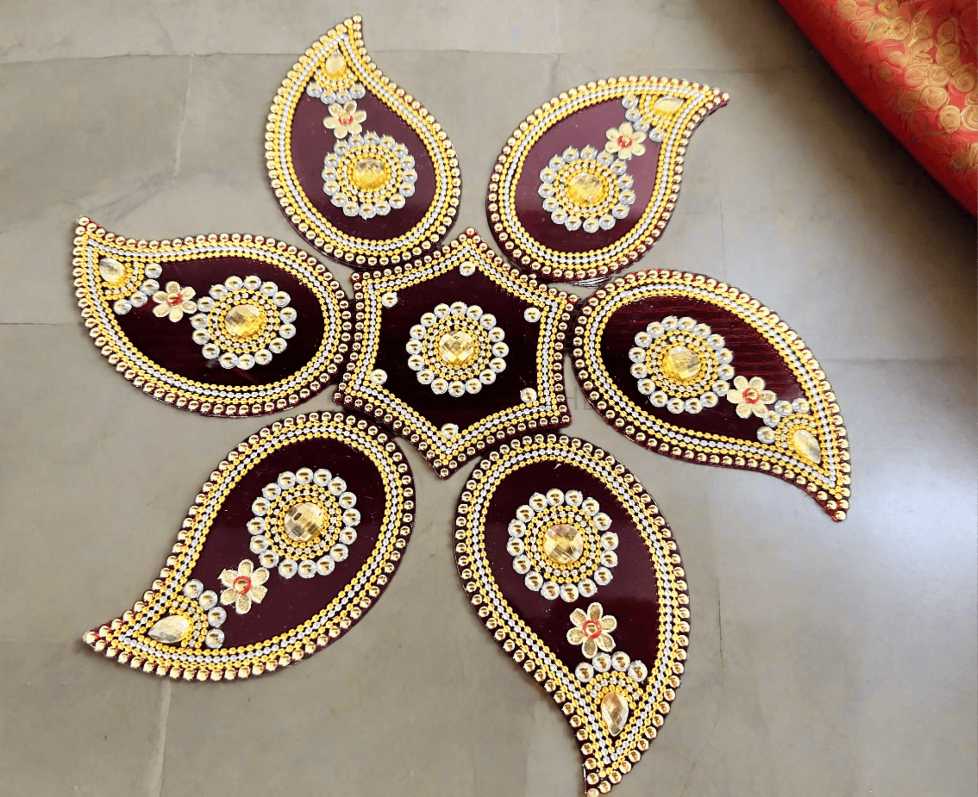 Imagine the hexagon-shaped piece intricately arranged within the rangoli, their geometric patterns adding a sense of symmetry and harmony to the composition. The hexagon is adorned with intricate gold work, reflecting the skill and craftsmanship of the artisans who meticulously created them.