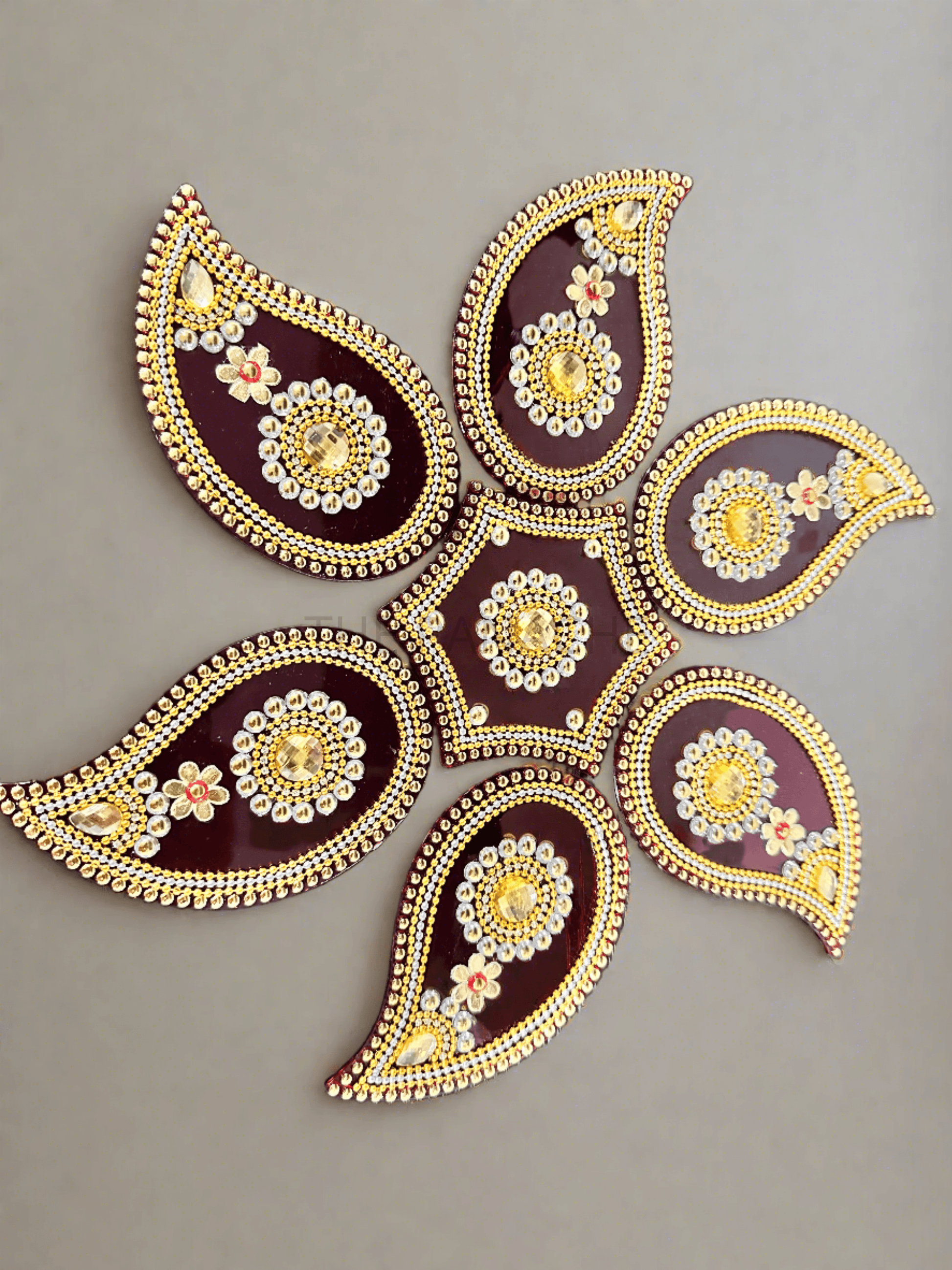 Picture the vibrant red base of the rangoli, symbolizing passion, energy, and vitality, serving as the canvas for the exquisite gold work. The ambiya shape, inspired by the mango motif, represents abundance, fertility, and auspiciousness in Indian culture, infusing the design with layers of symbolism and cultural significance.