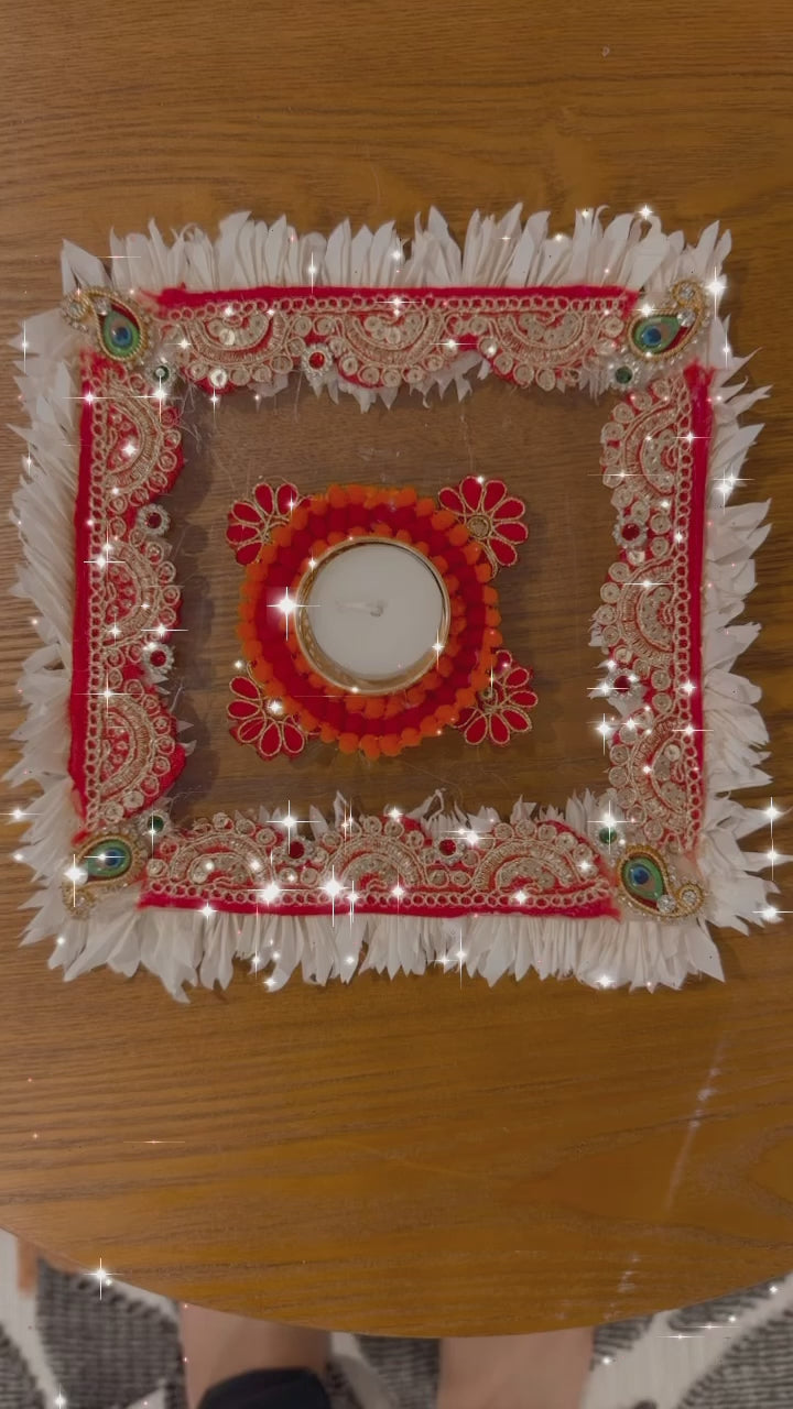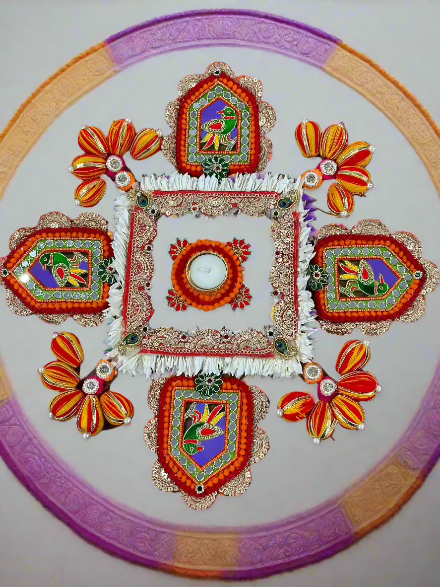Traditional yet colorful theme, combining intricate patterns with vibrant colors. The centerpiece is square-shaped, bordered with white and orange accents, with a small candle or diya in the middle. Surrounding this central square are four prominent parrot-themed elements, showcasing intricate embroidery and embellishments in shades of green, purple, orange, and red. These add a regal and festive touch to the design.