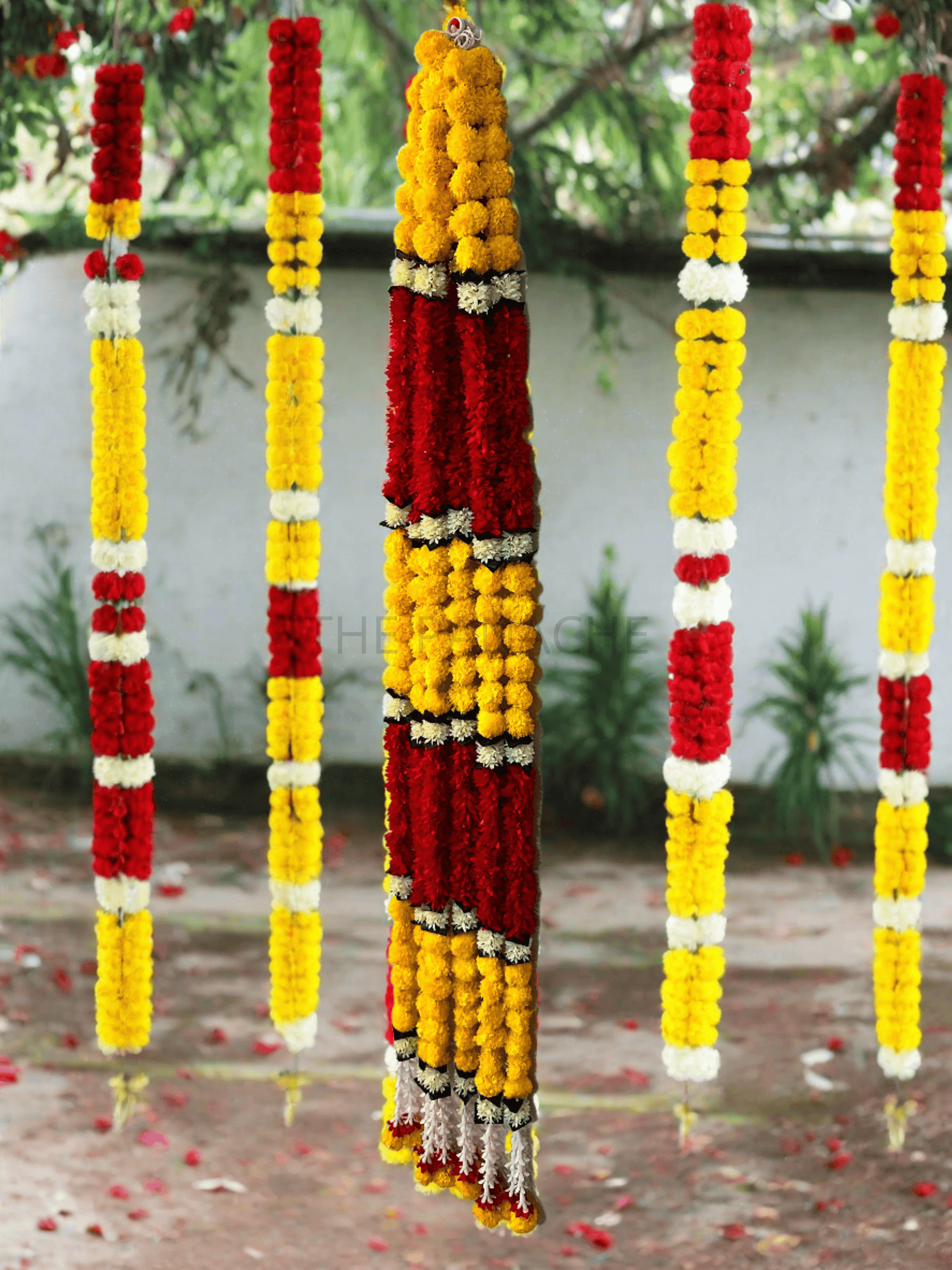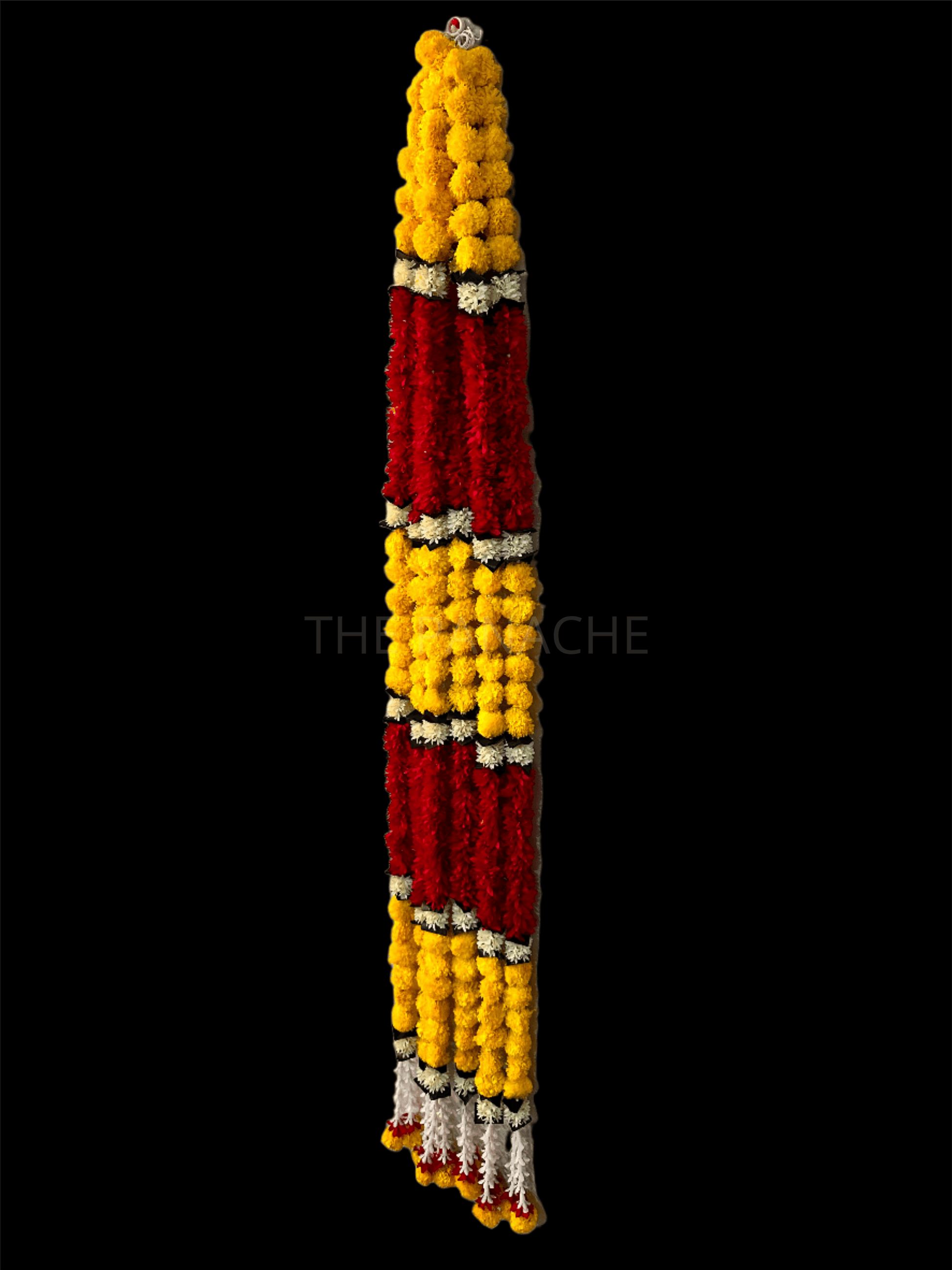 Visualize an exquisite 5-foot hanging adorned with vibrant yellow marigold, fragrant white mogra, red flowers, and lush green leaves, exuding a delightful and refreshing ambiance.