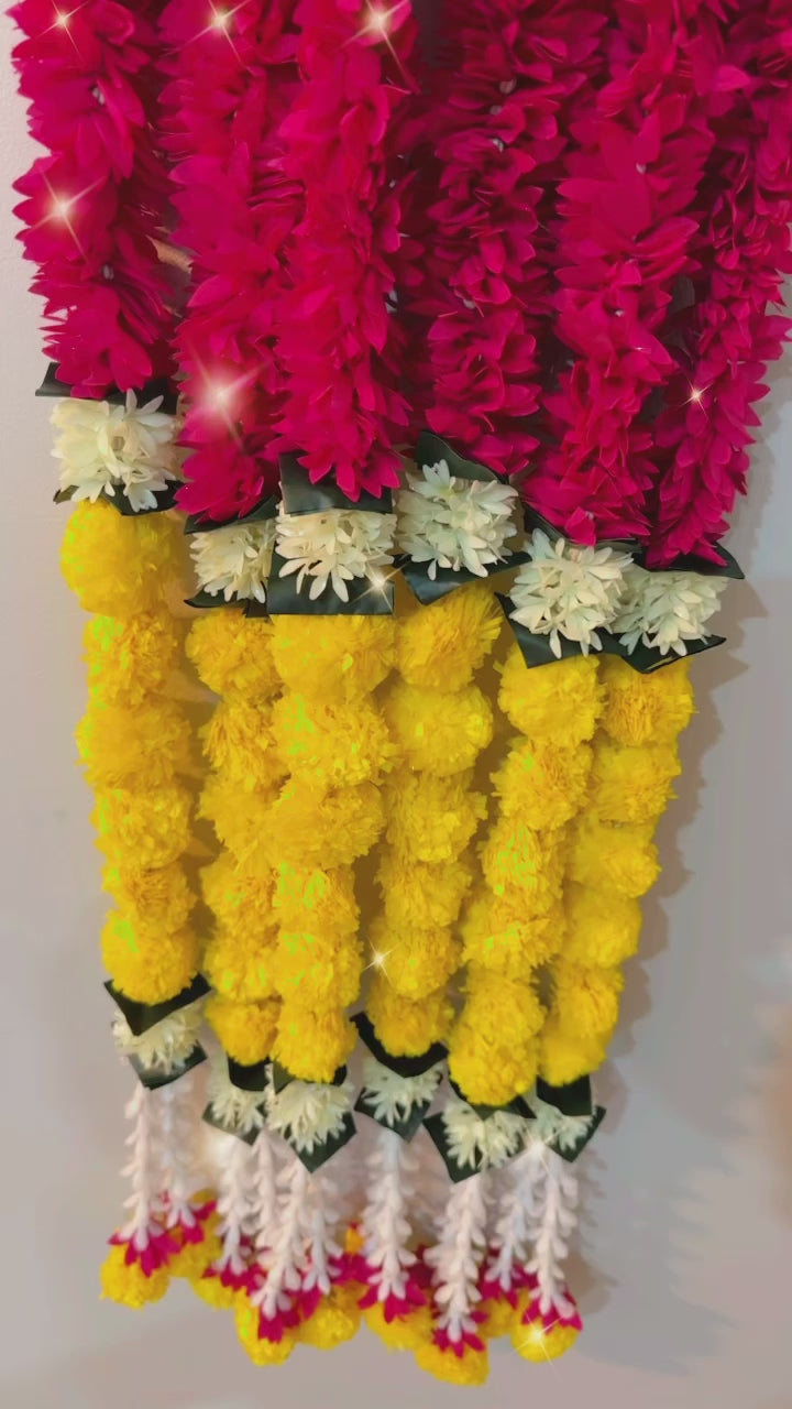 As the yellow marigold, white mogra, red flower, and green leaf hanging sways gently in the breeze, it becomes a radiant symbol of joy, abundance, and celebration, enhancing the atmosphere with its vibrant presence. Its timeless beauty and graceful design make it a cherished addition to any festive occasion or gathering.
