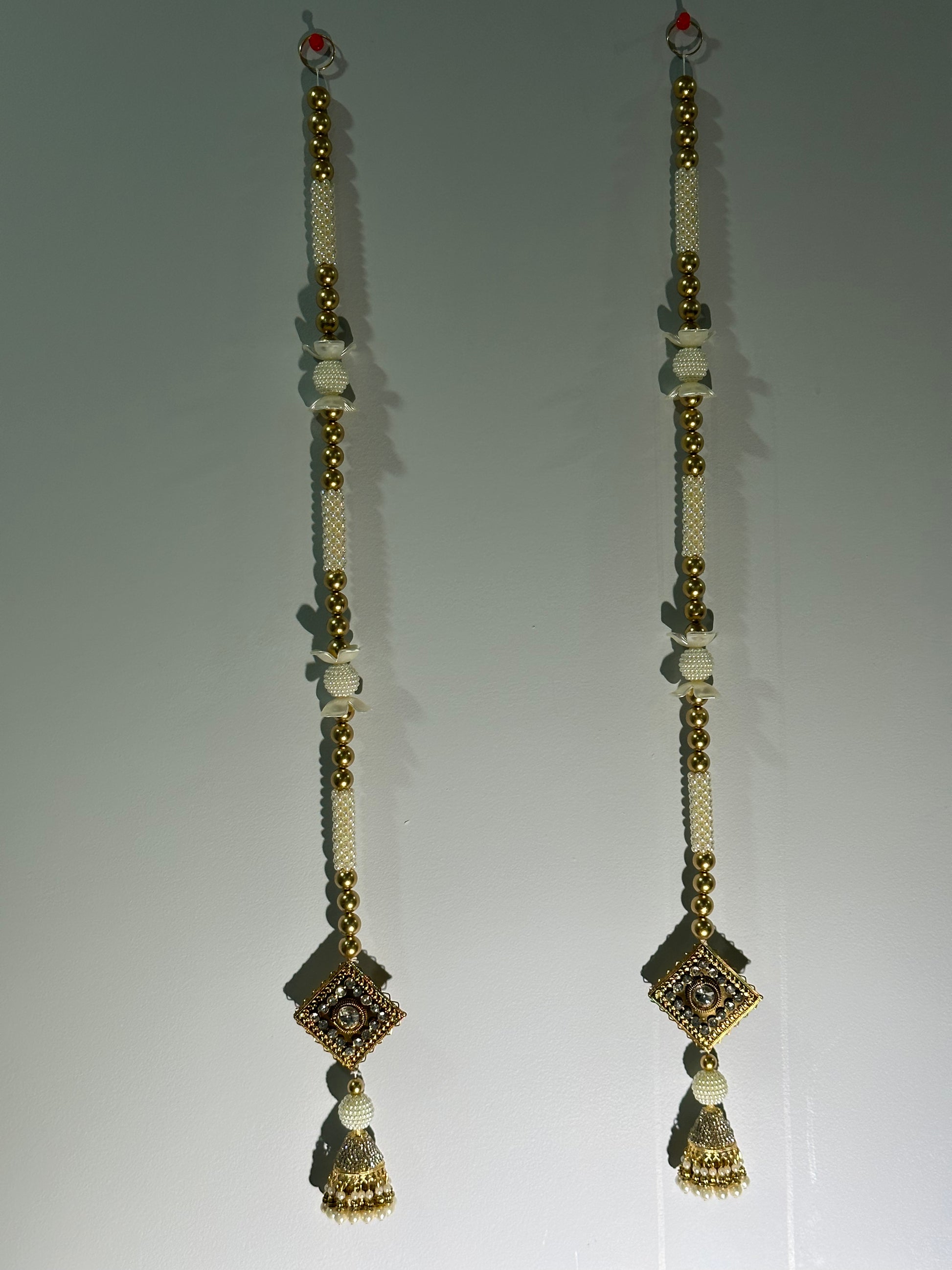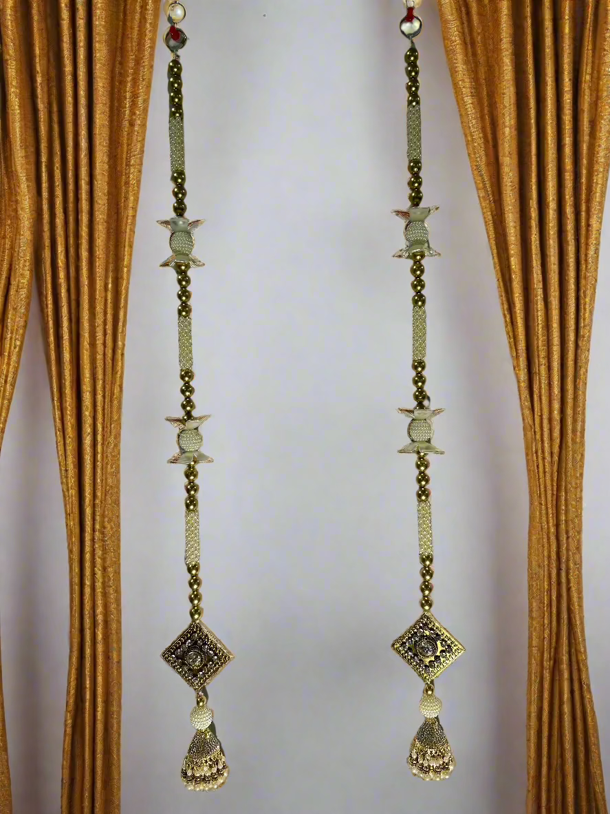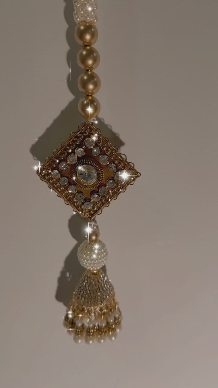 Ideal for festivals such as Diwali, Navratri, or for wedding décor, this hanging can be displayed at doorways, windows, or along walls to bring an opulent and festive vibe. The pearls symbolize purity and elegance, while the gold beads evoke wealth and prosperity, making this decorative hanging a perfect choice for adding a refined and celebratory touch to your home or event décor.