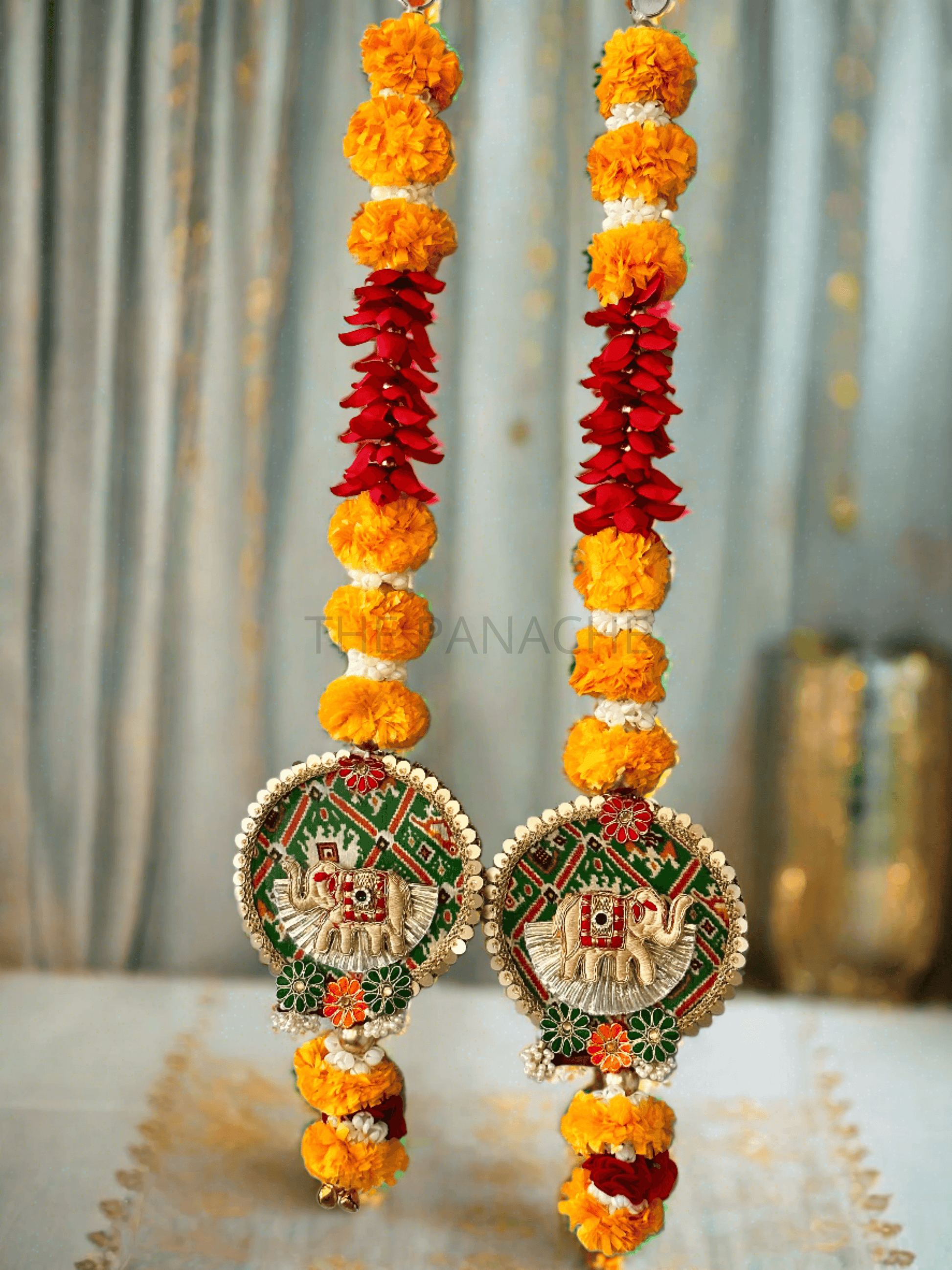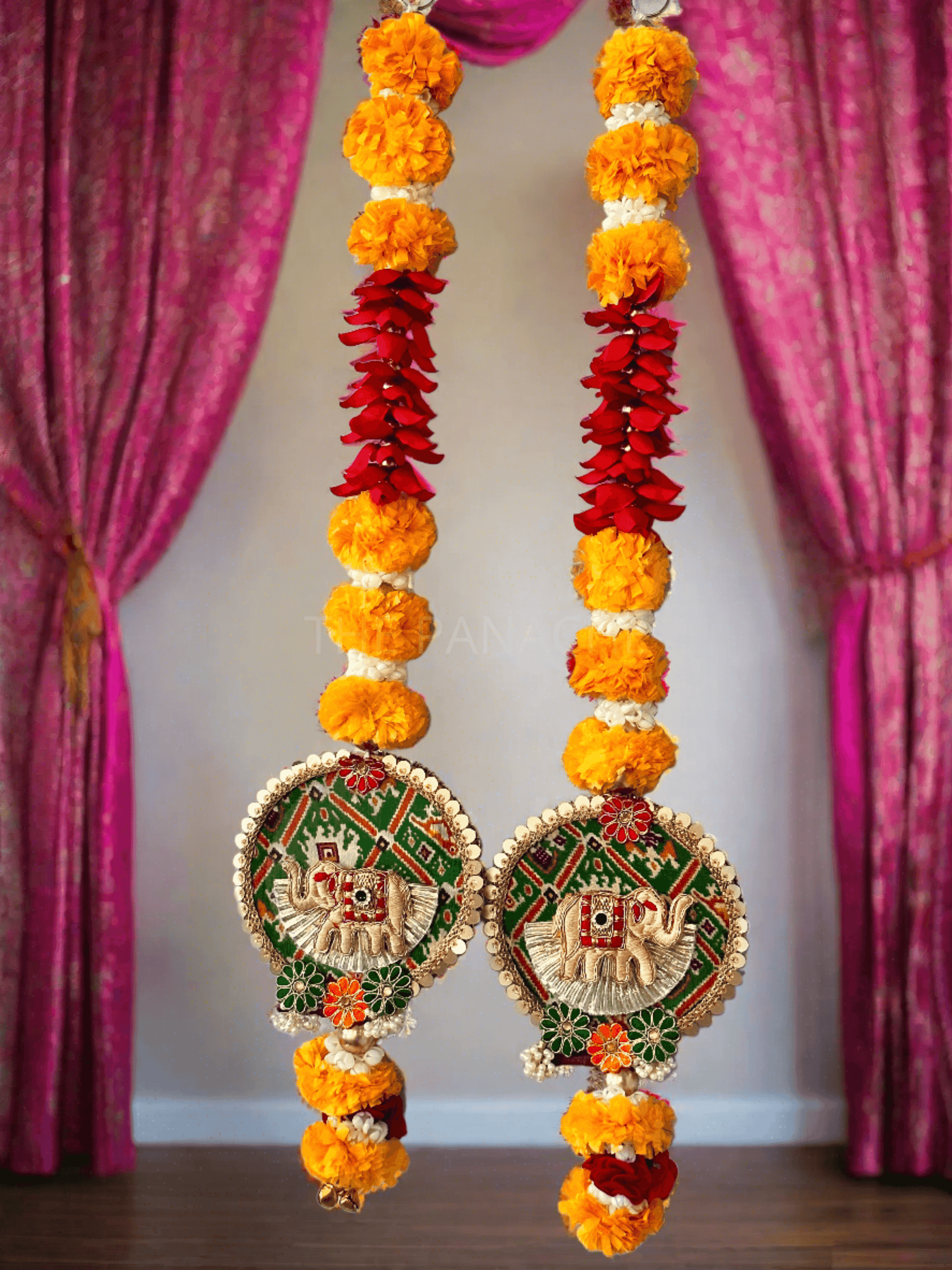 Imagine the vibrant yellow marigold and red flowers meticulously arranged around the elephant motif, their cheerful hues adding a pop of color and vibrancy to the ensemble. These flowers evoke a sense of joy and celebration, infusing the decoration with a lively and festive atmosphere.