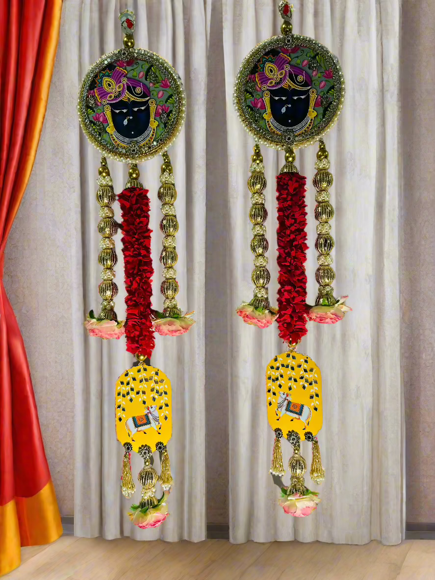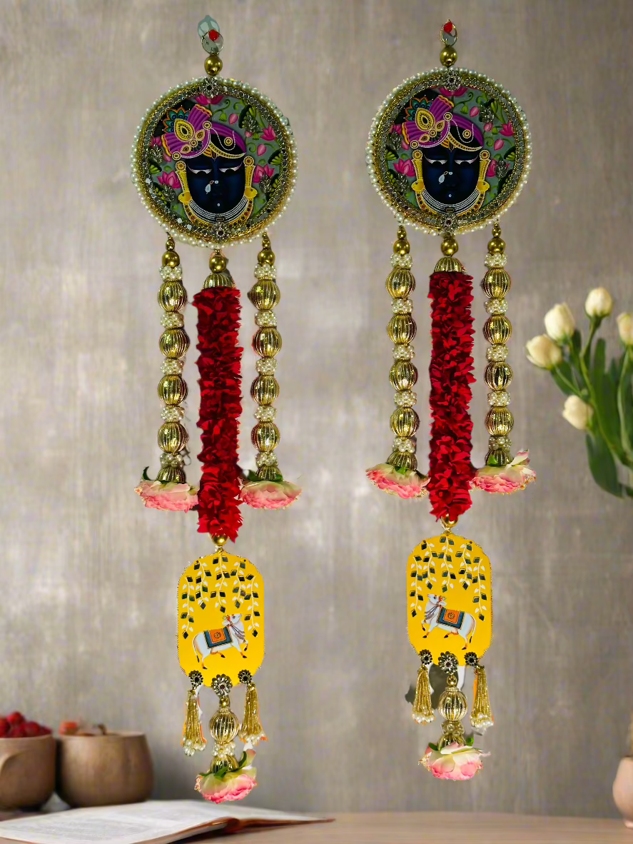 Perfect for adorning temple spaces, entryways, or living areas, the Pichwai Themed Shreenathji Hangings create a spiritual and serene ambiance. They serve as a beautiful reminder of devotion and add an element of elegance and tradition to your decor. Whether used during festivals like Diwali, Janmashtami or simply to enhance the spiritual atmosphere in your home, these hangings bring a sense of peace, positivity, and cultural heritage, while honoring the divine grace of Lord Shreenathji.