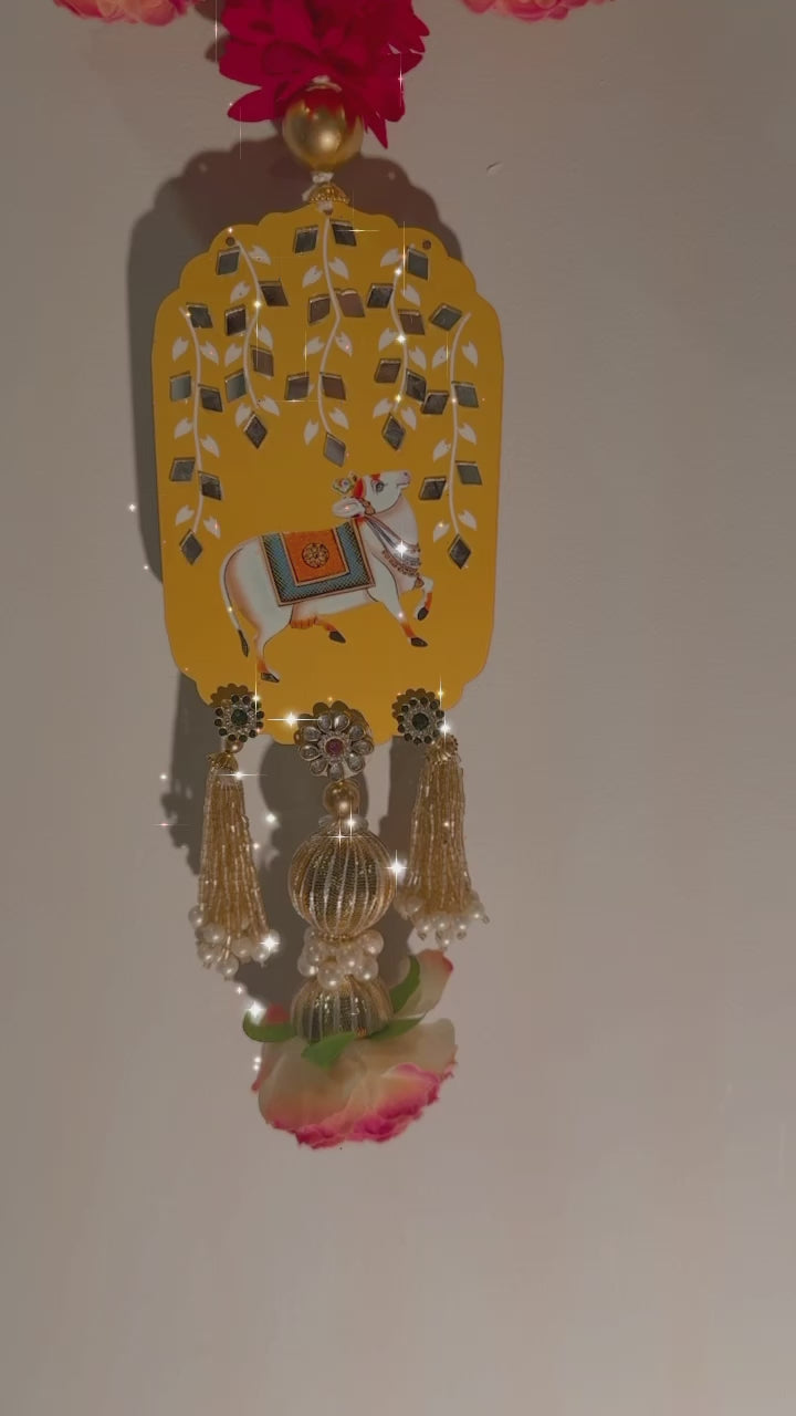 The Pichwai Themed Shreenathji Hangings are exquisite decor pieces inspired by the traditional Pichwai art form, which celebrates the divine beauty of Lord Shreenathji. These hangings feature intricate designs depicting elements associated with Lord Shreenathji, such as lotus flowers, cows, and rich floral motifs, often found in Pichwai paintings. The vibrant colors and detailed patterns evoke a sense of devotion, bringing the divine presence into your home. Embellished with pearls, gold beads, and intricate embellishments, these hangings reflect the opulence and cultural depth of traditional Indian artistry.