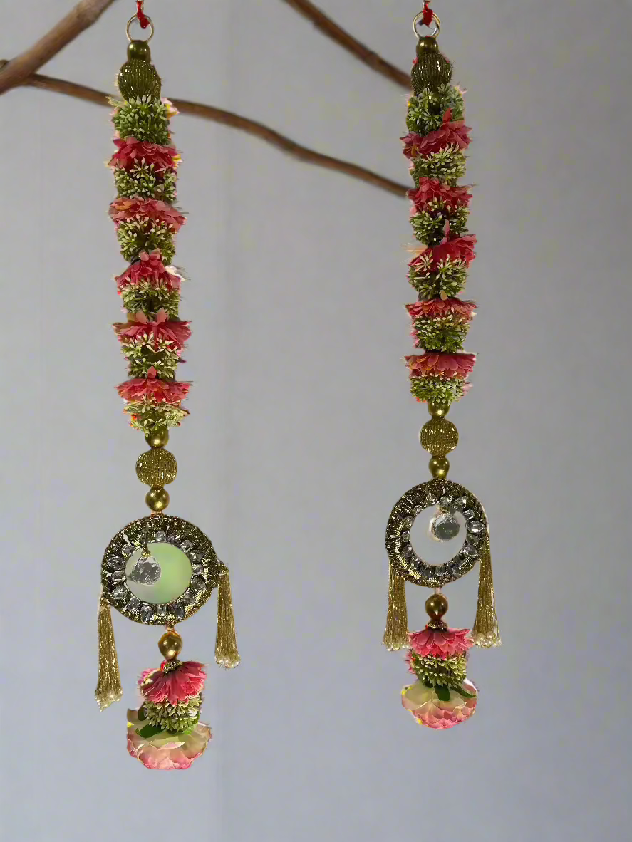 The Cherry Blossom Hangings are a captivating decor piece inspired by the delicate beauty of cherry blossoms. These hangings feature intricate artificial cherry blossom flowers in soft pink and white hues, evoking the elegance and grace of springtime blooms. The addition of pearls and gold beads further enhances their charm, adding a touch of luxury and sophistication to the overall design. With their graceful floral arrangements and dangling elements, these hangings create a stunning visual effect that instantly uplifts any space.