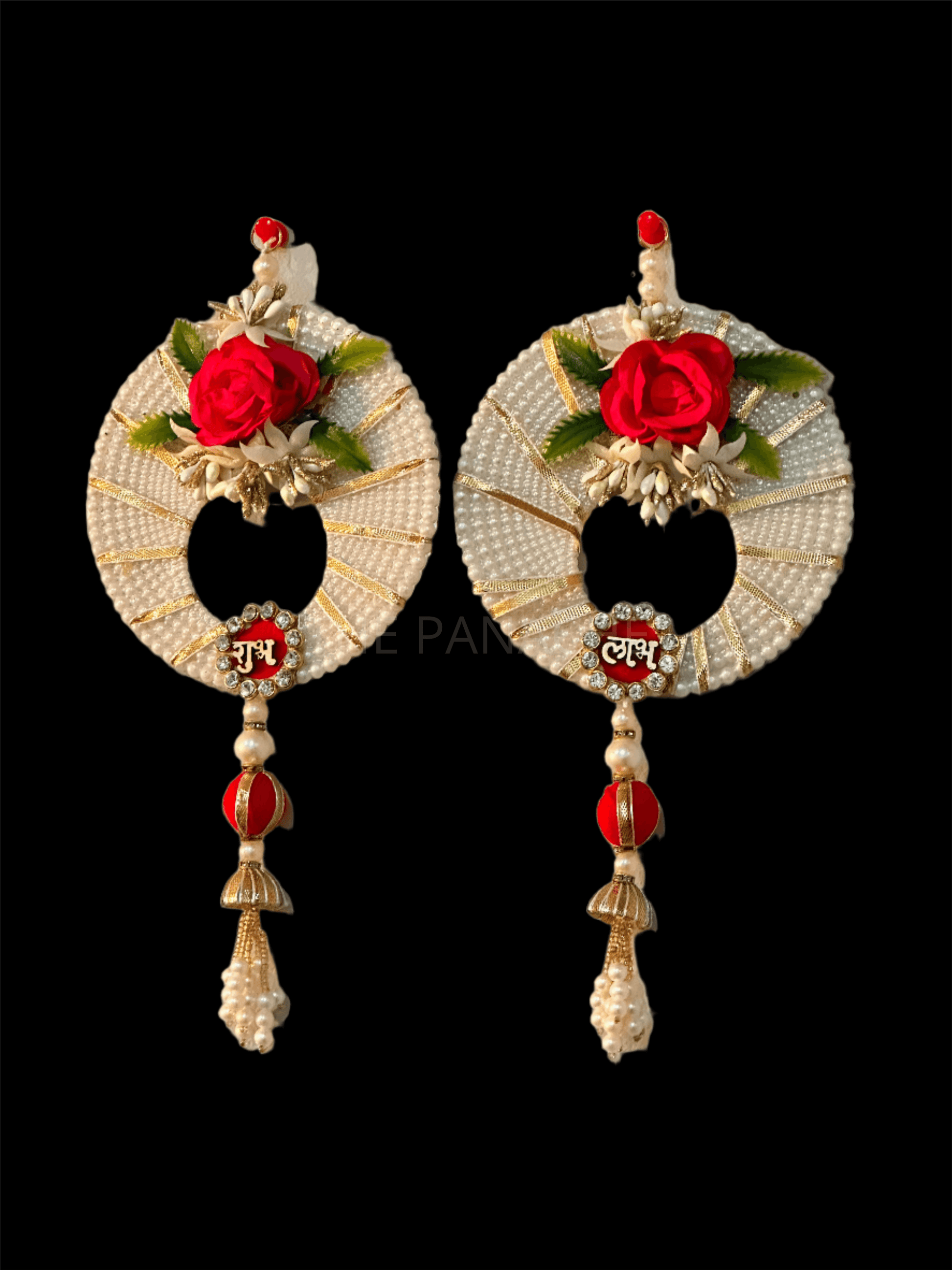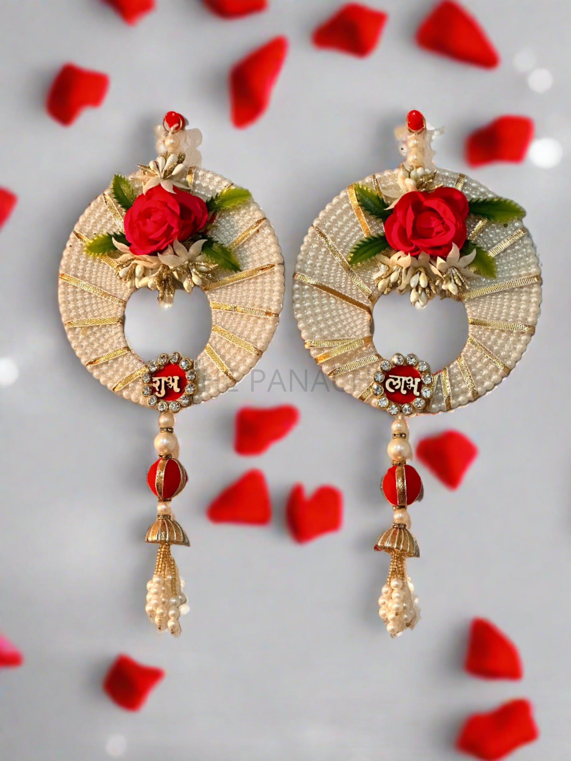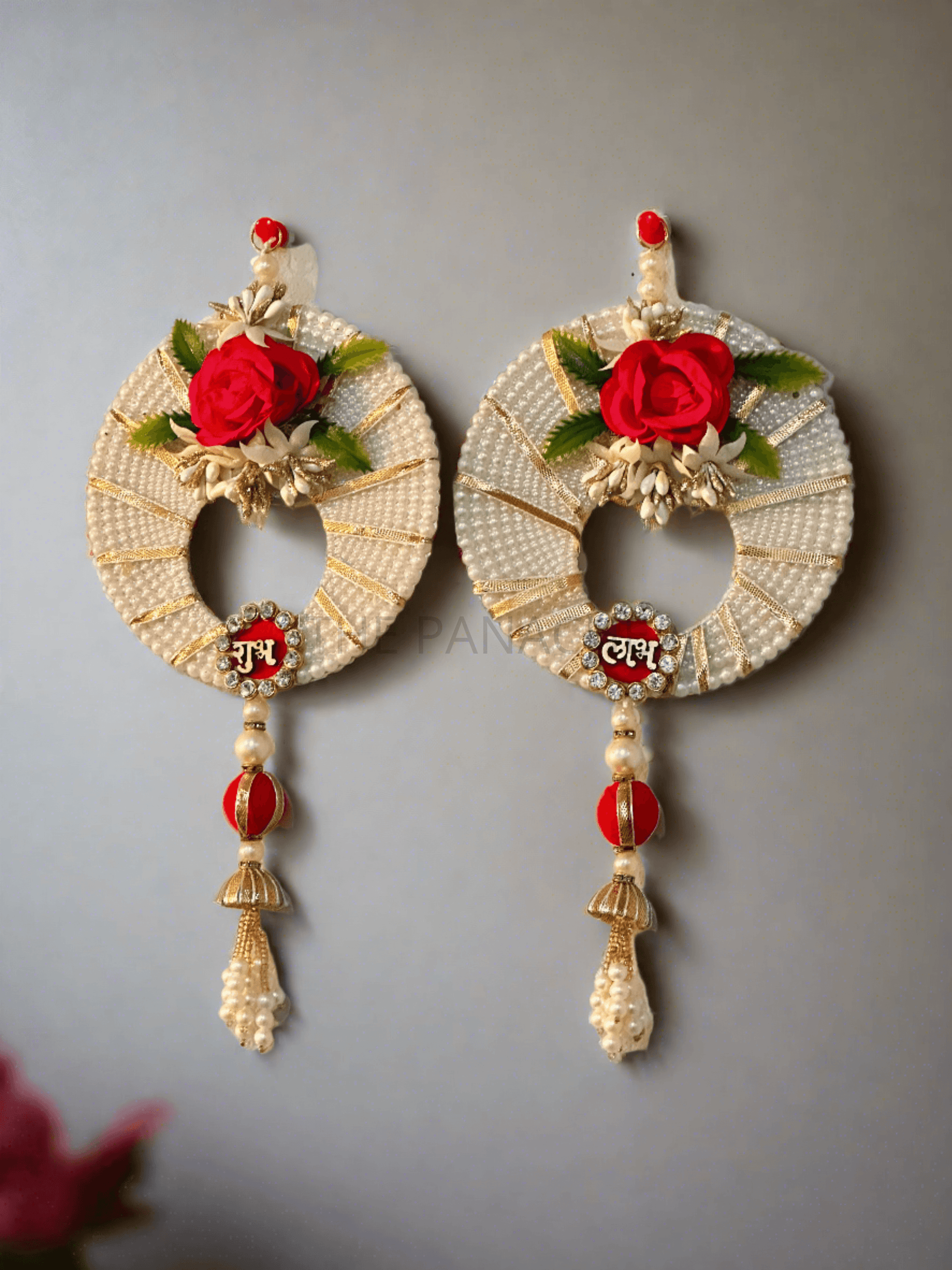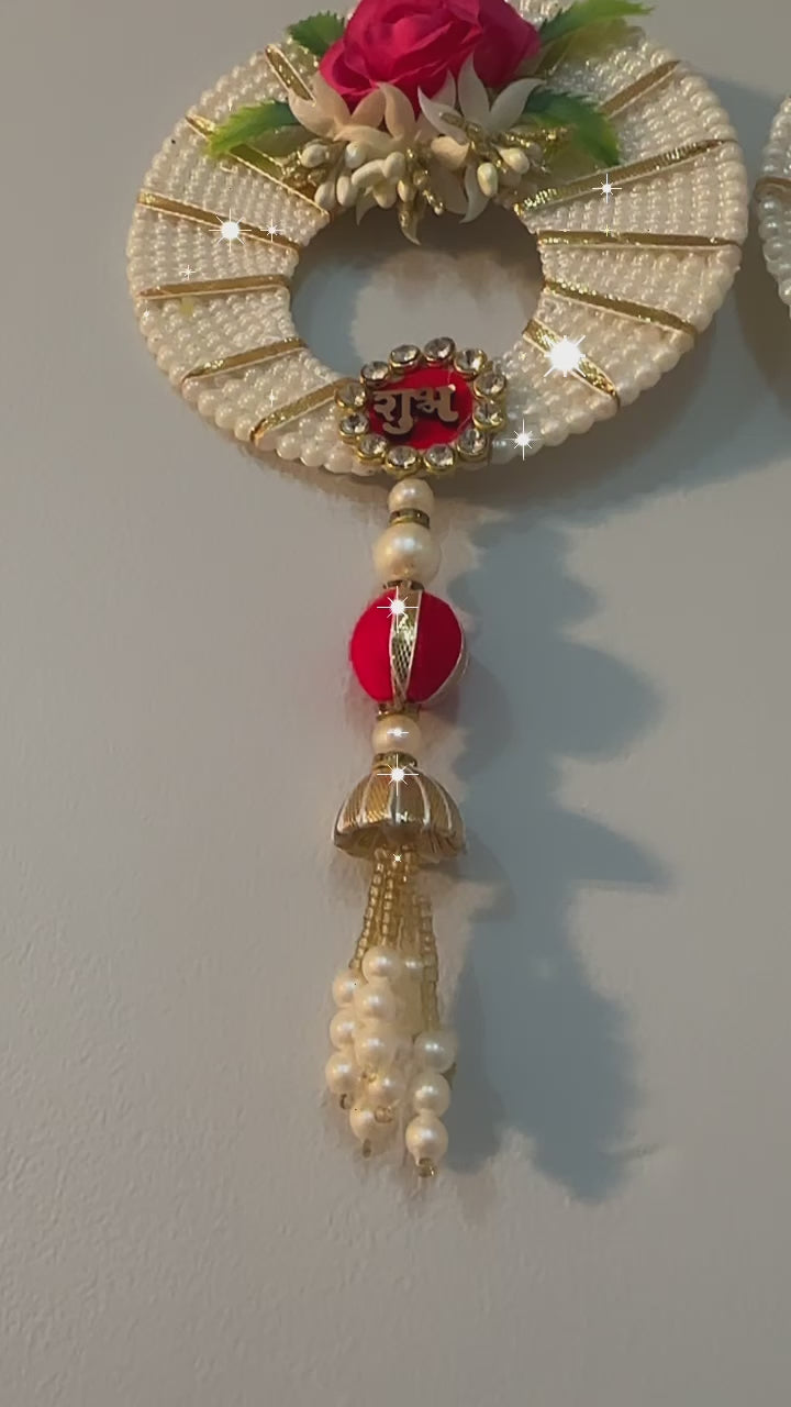 Admire the intricate craftsmanship and symbolism embodied in this circular Subh Labh decoration, where every element tells a story of tradition and elegance. Its harmonious fusion of pearls, the red rose, and decorative accents creates a captivating spectacle, making it a cherished addition to any celebration or home.