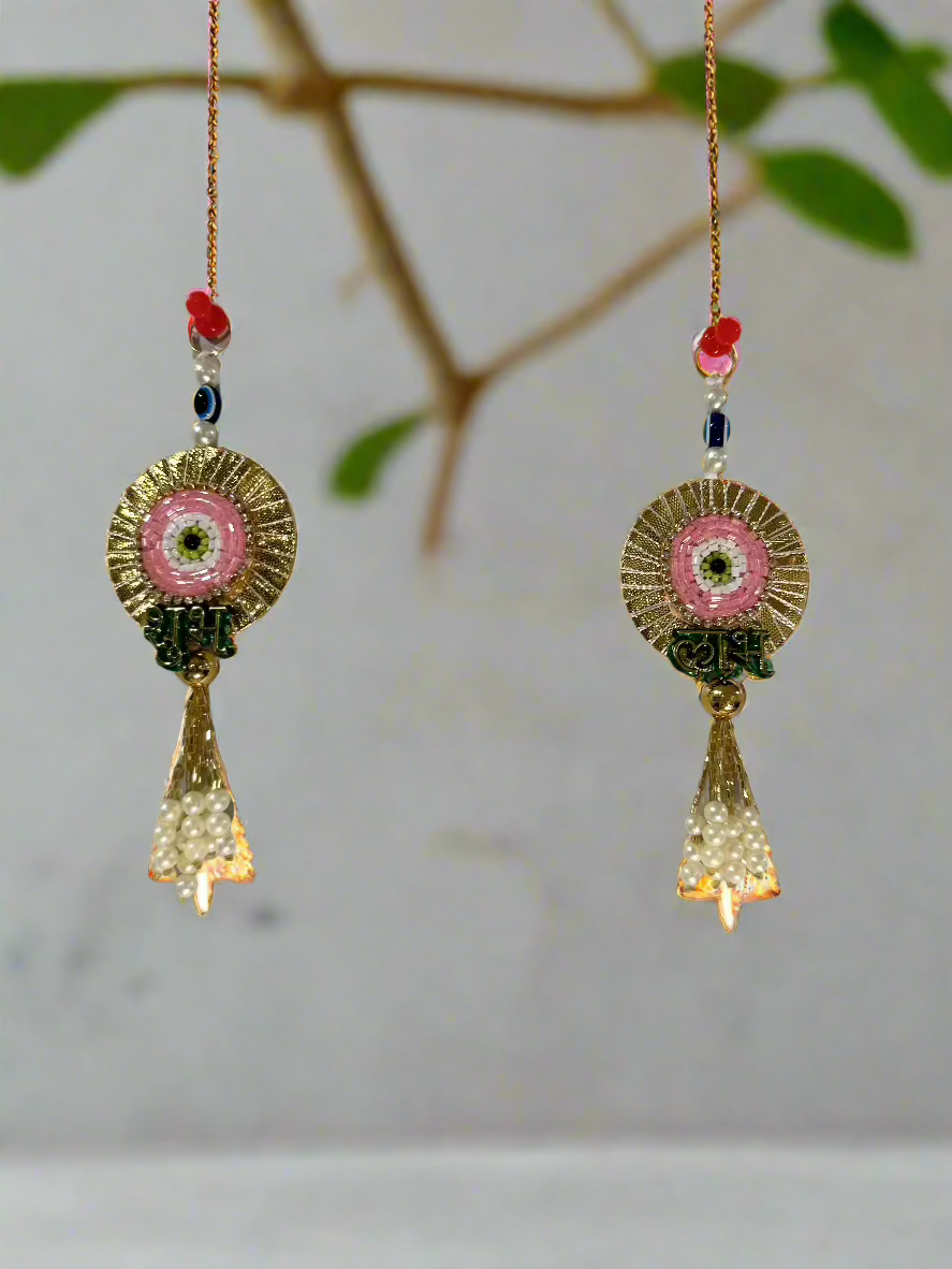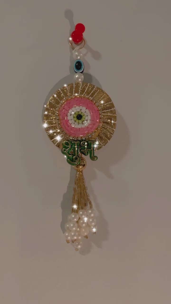 The Pink Evil Eye Shubh Labh Mini Hangings are a charming blend of traditional symbolism and modern design. Featuring a delicate pink evil eye at the center, these mini hangings incorporate the ancient belief of warding off negative energy with the protective power of the evil eye, while the words "Shubh" and "Labh" invite auspiciousness and prosperity. The combination of soft pink, gold accents, and pearl-like tassels gives these pieces a graceful, elegant appearance, perfect for adorning small spaces like doors, windows, or car mirrors.
