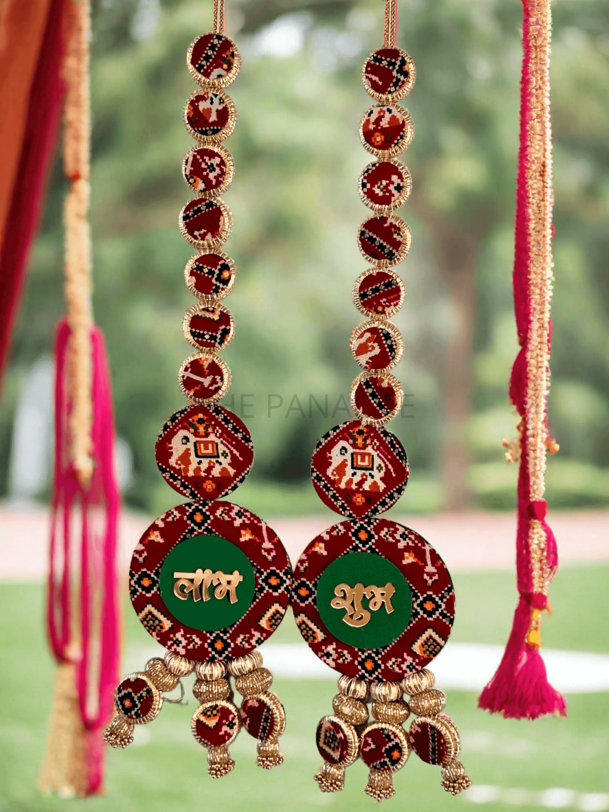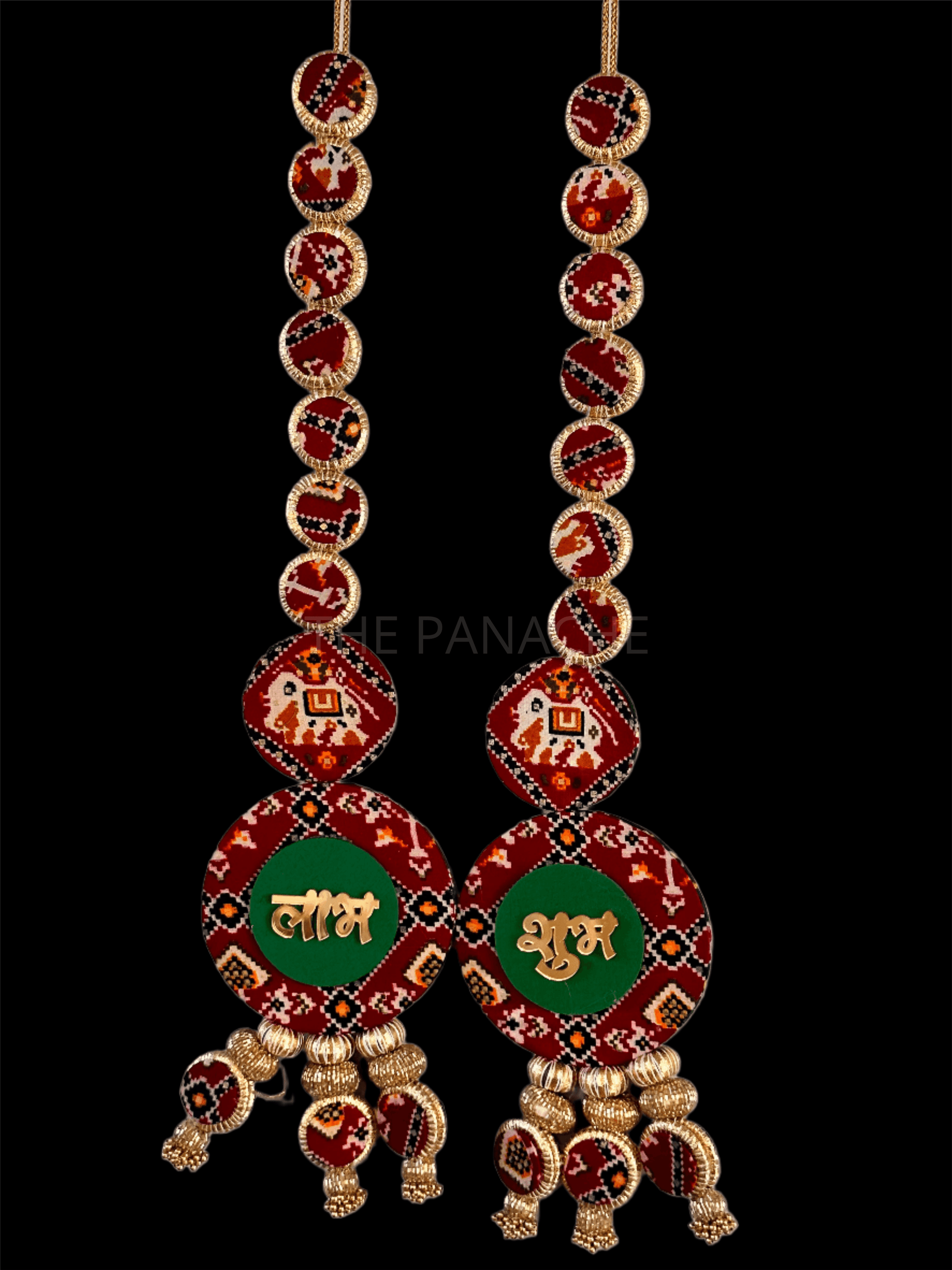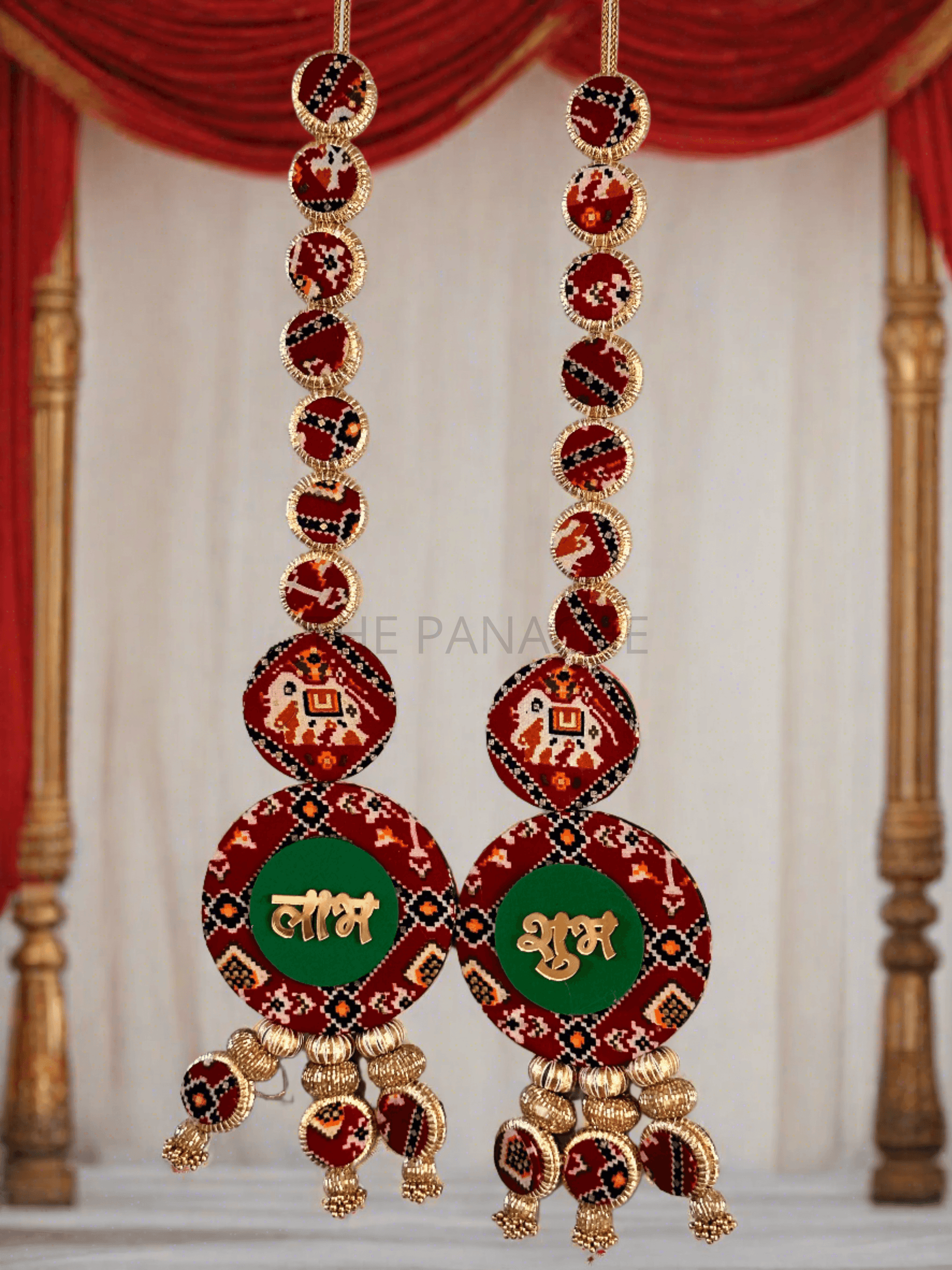 Visualize a stunning dual-sided Subh Labh decoration crafted from vibrant Patola fabric in red and green hues, adorned with intricate gold bead decorations, radiating elegance and cultural richness.