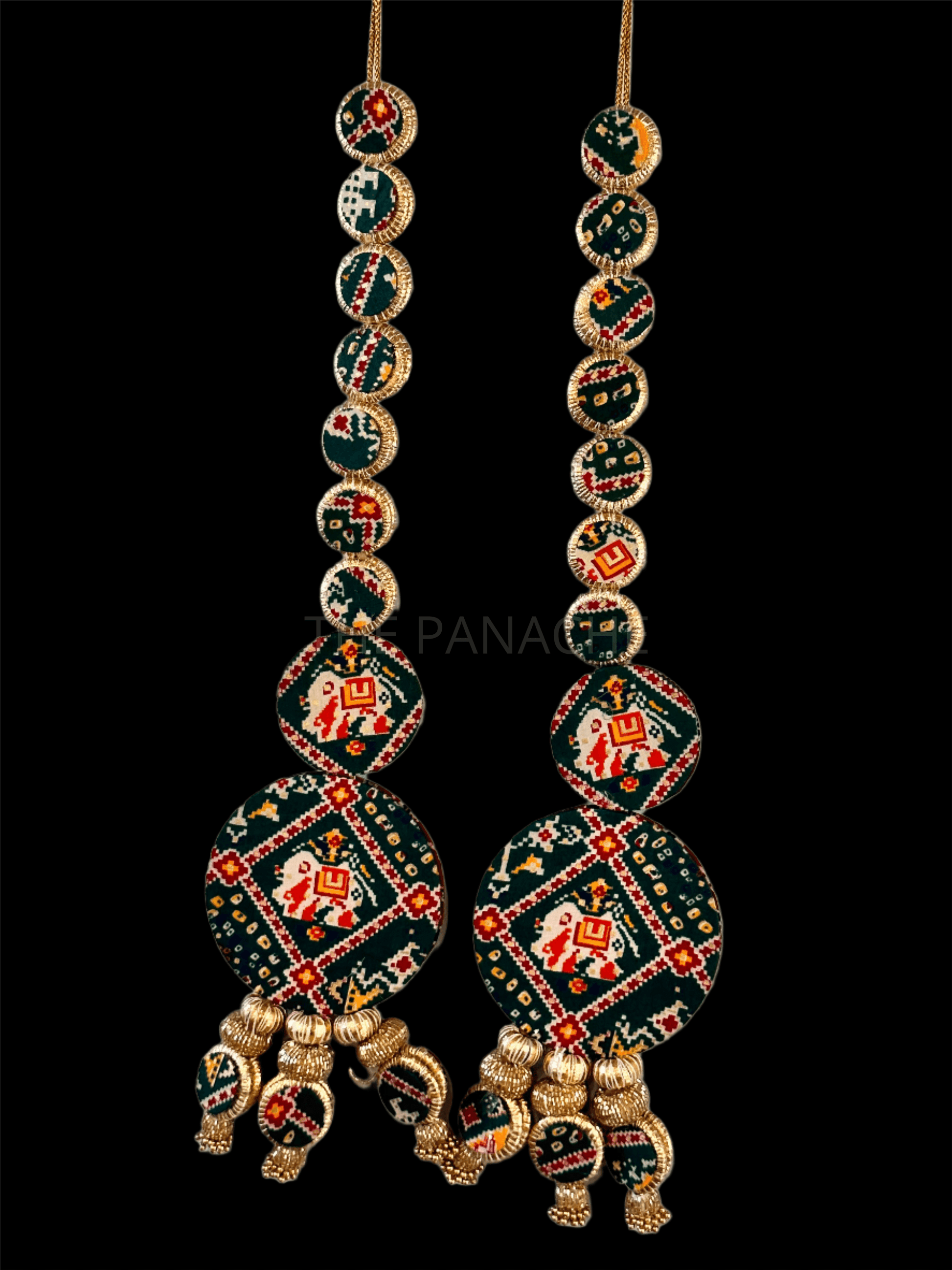 Picture one side of the decoration featuring rich red Patola fabric, symbolizing vitality and auspiciousness, while the other side showcases lush green Patola fabric, representing growth and prosperity. The dual-sided design allows for versatility in display, offering beauty from every angle.