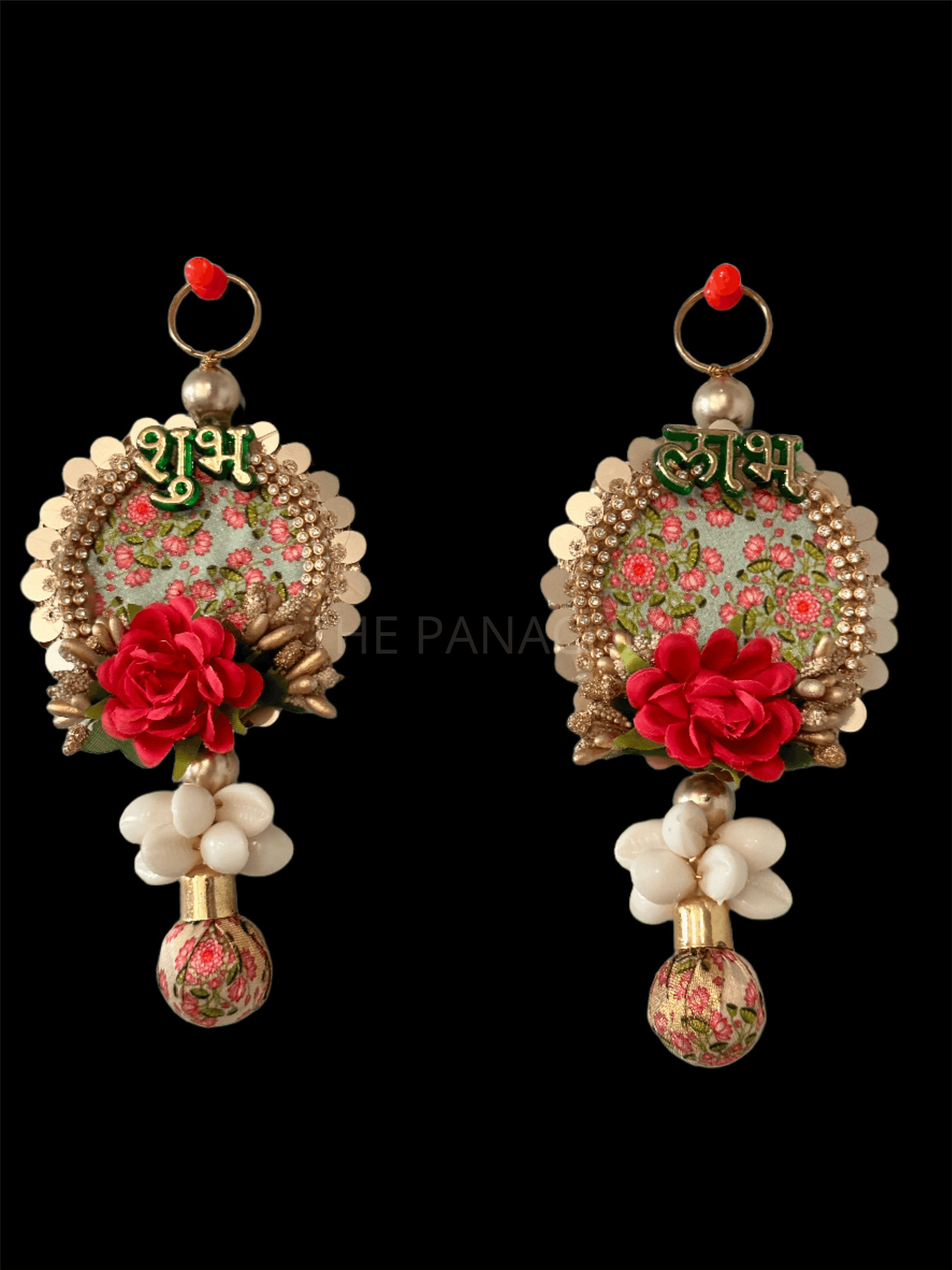 Imagine the lavish gold beads delicately arranged around the Subh Labh motifs, adding a touch of opulence and luxury to the ensemble. The shimmering gold beads catch the light, casting a warm glow and enhancing the overall beauty of the decoration.