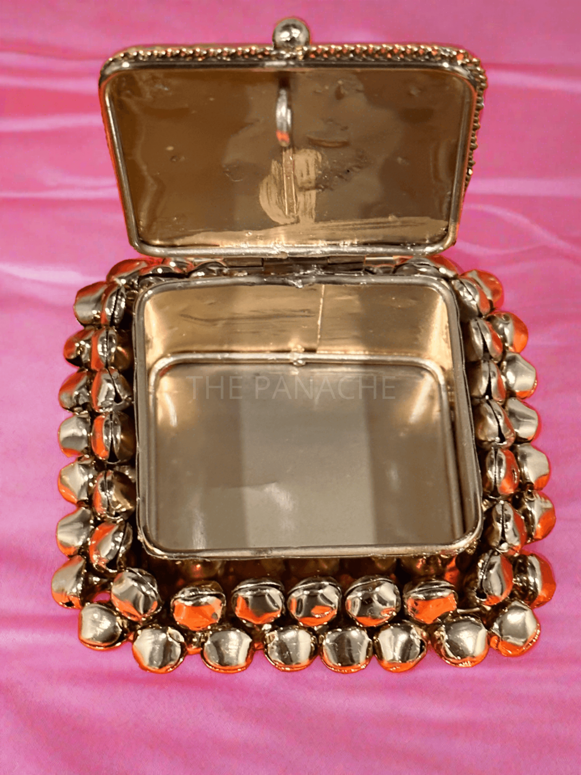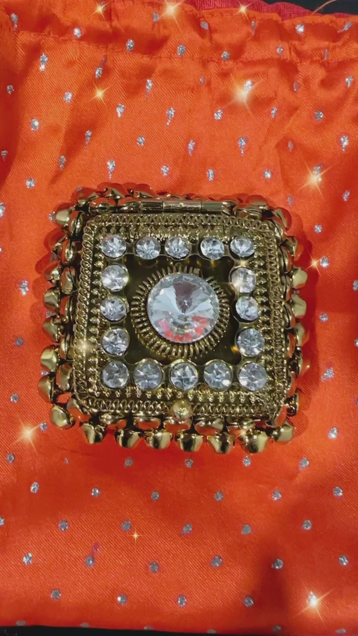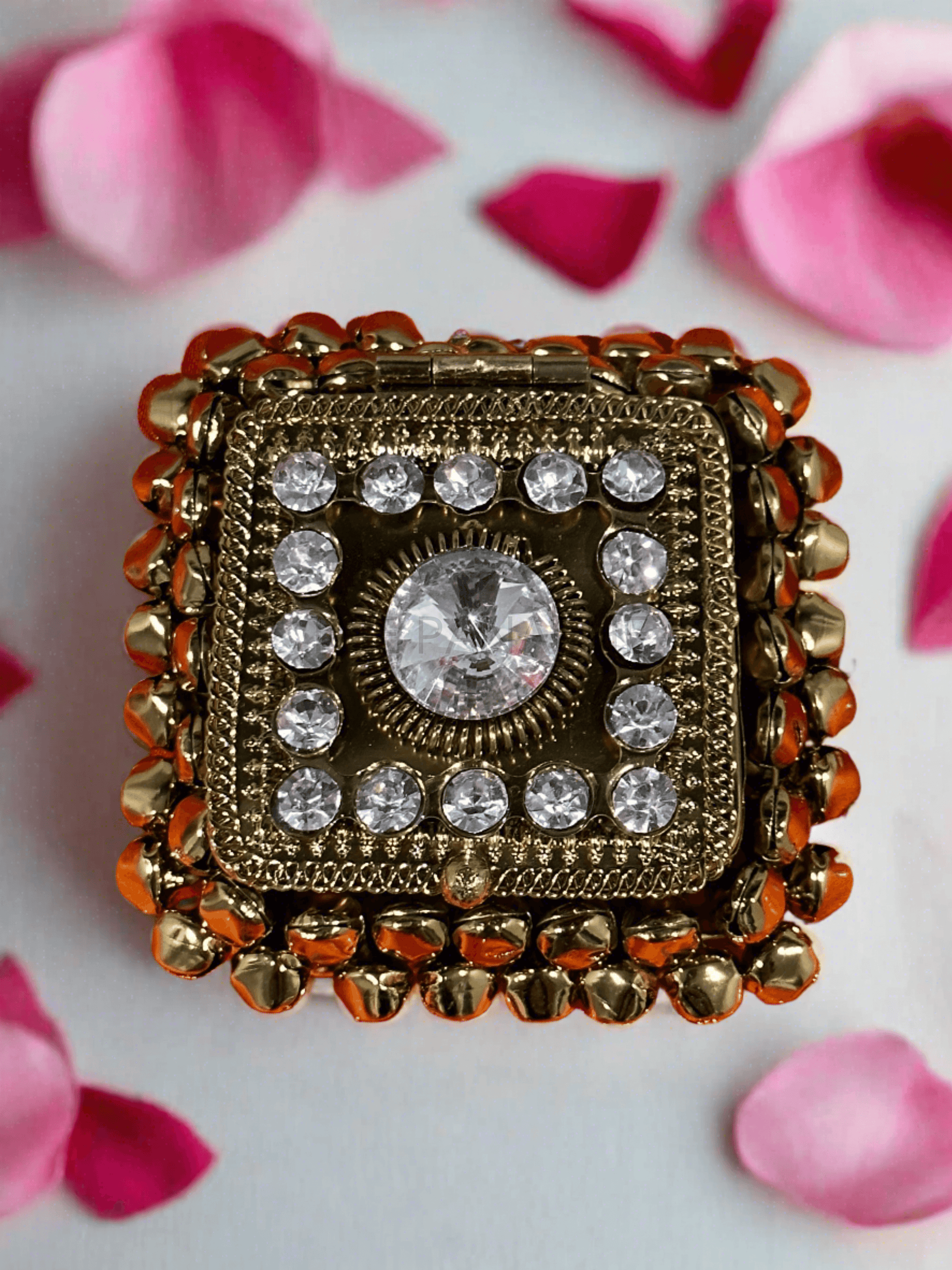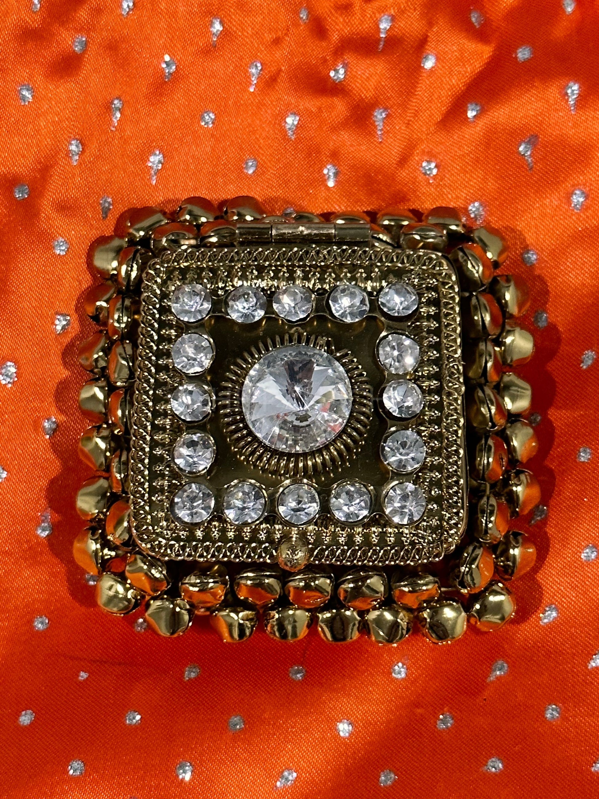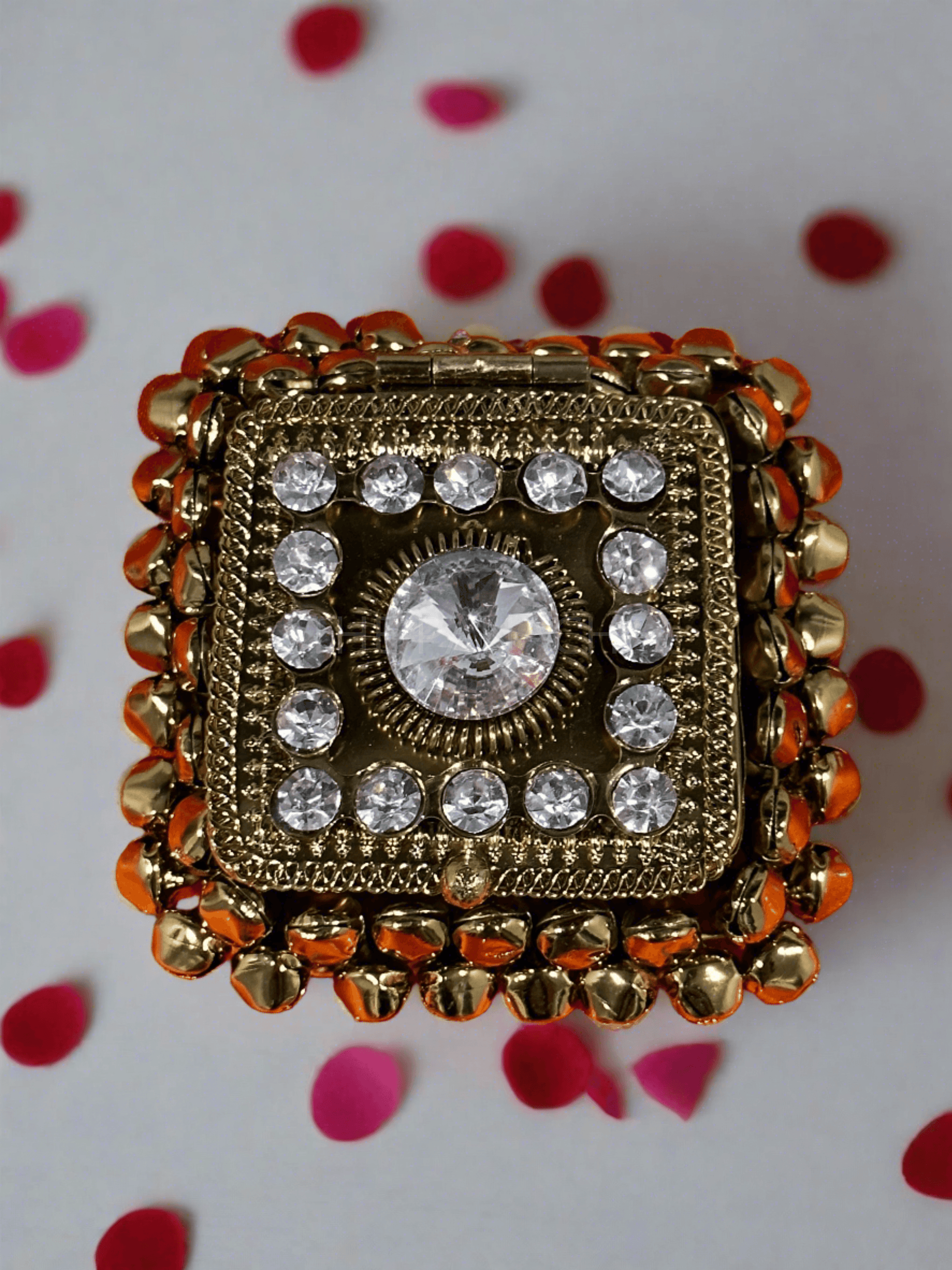 Whether displayed on a shelf, countertop, or dressing table, the square multipurpose dabbi with ghungroo and Kundan studding stands as a symbol of timeless beauty and traditional craftsmanship, adding a touch of elegance to any space.