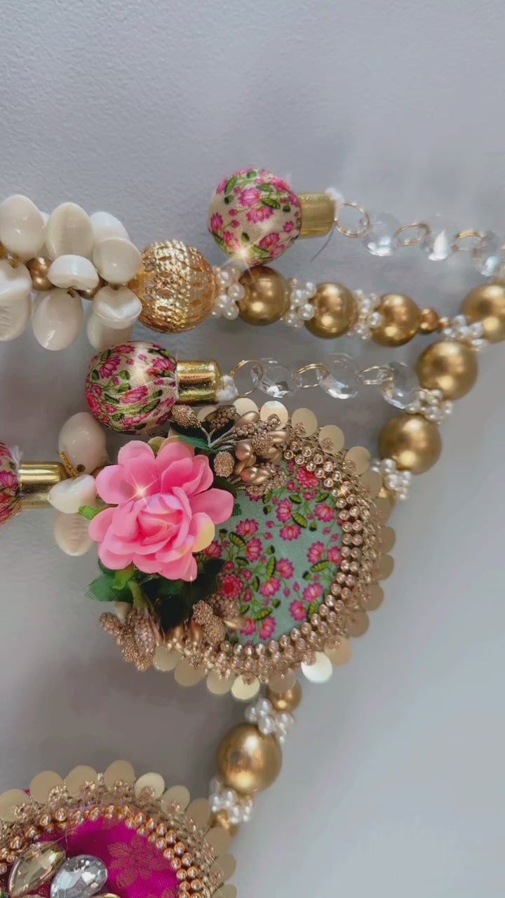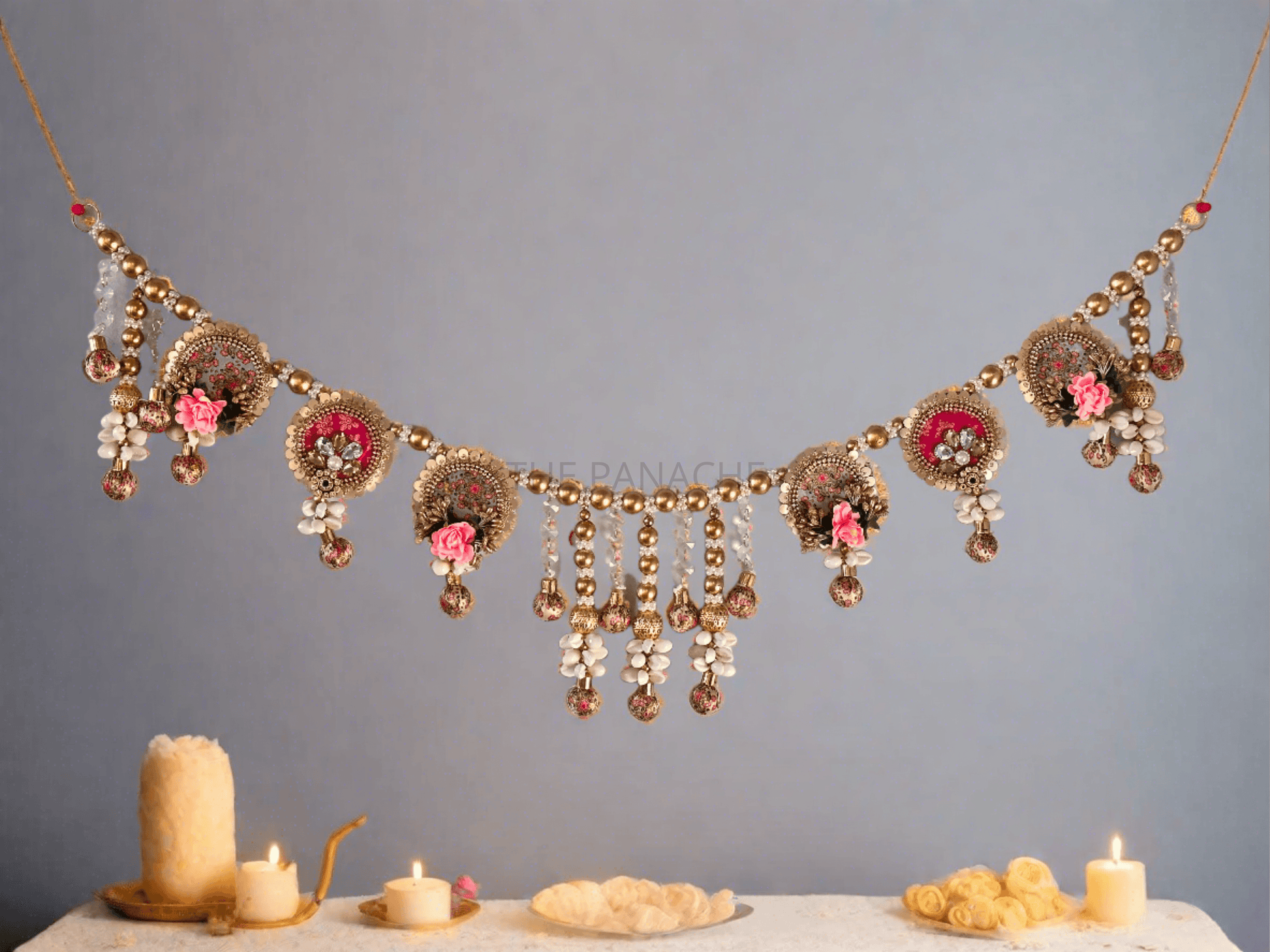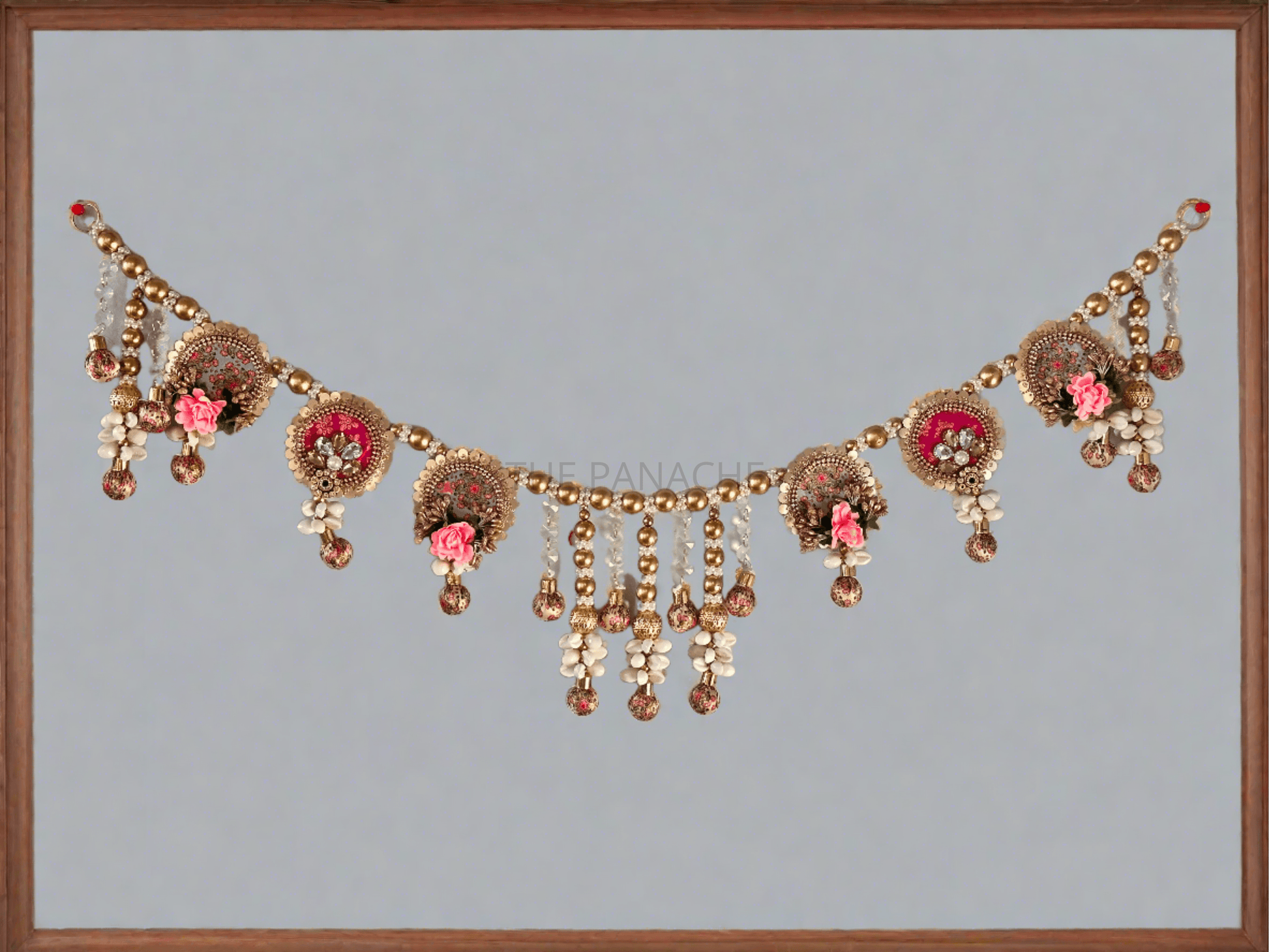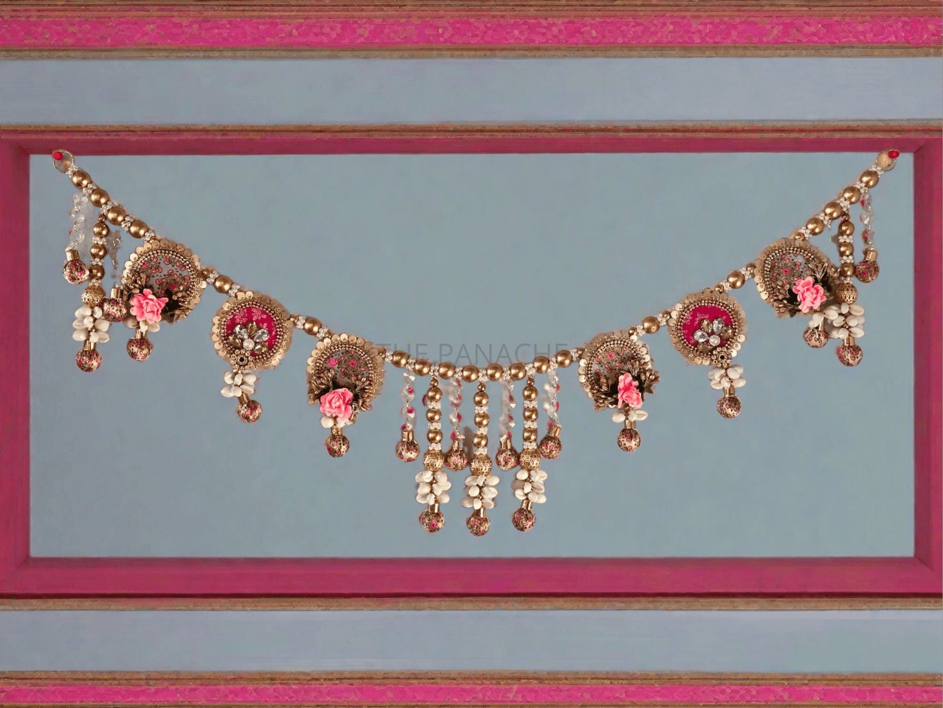 Imagine strands of lustrous gold beads delicately woven throughout the toran, adding a touch of elegance and luxury to the ensemble. These beads catch the light, casting a warm and inviting glow that enhances the beauty of the artwork.