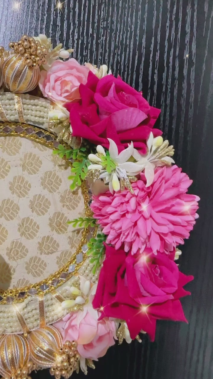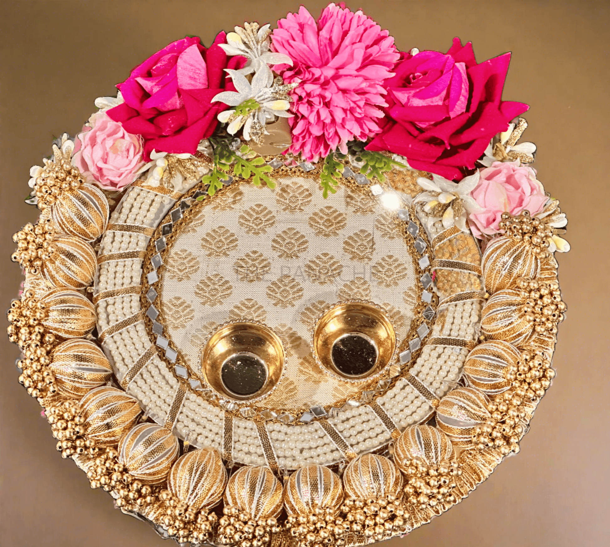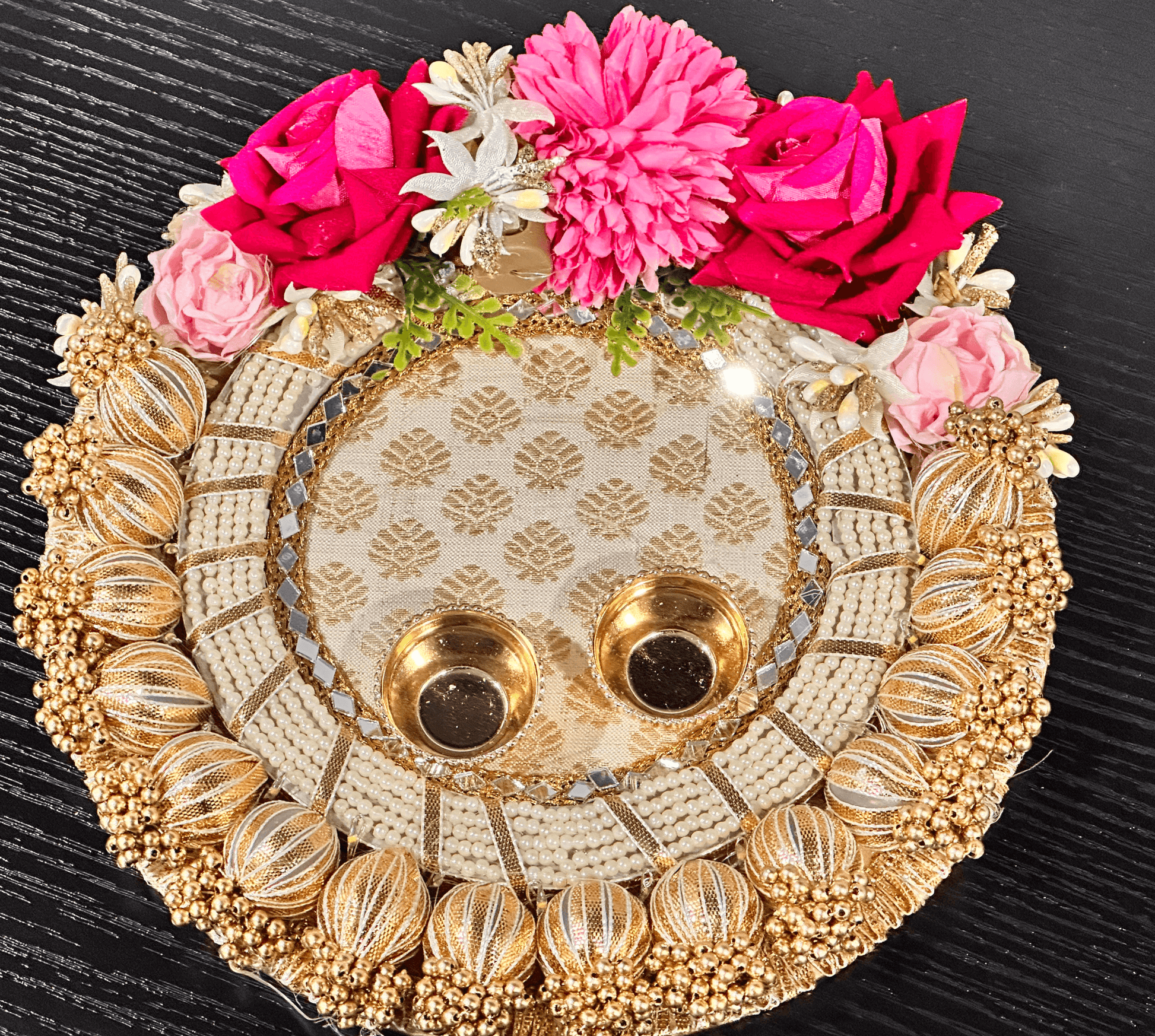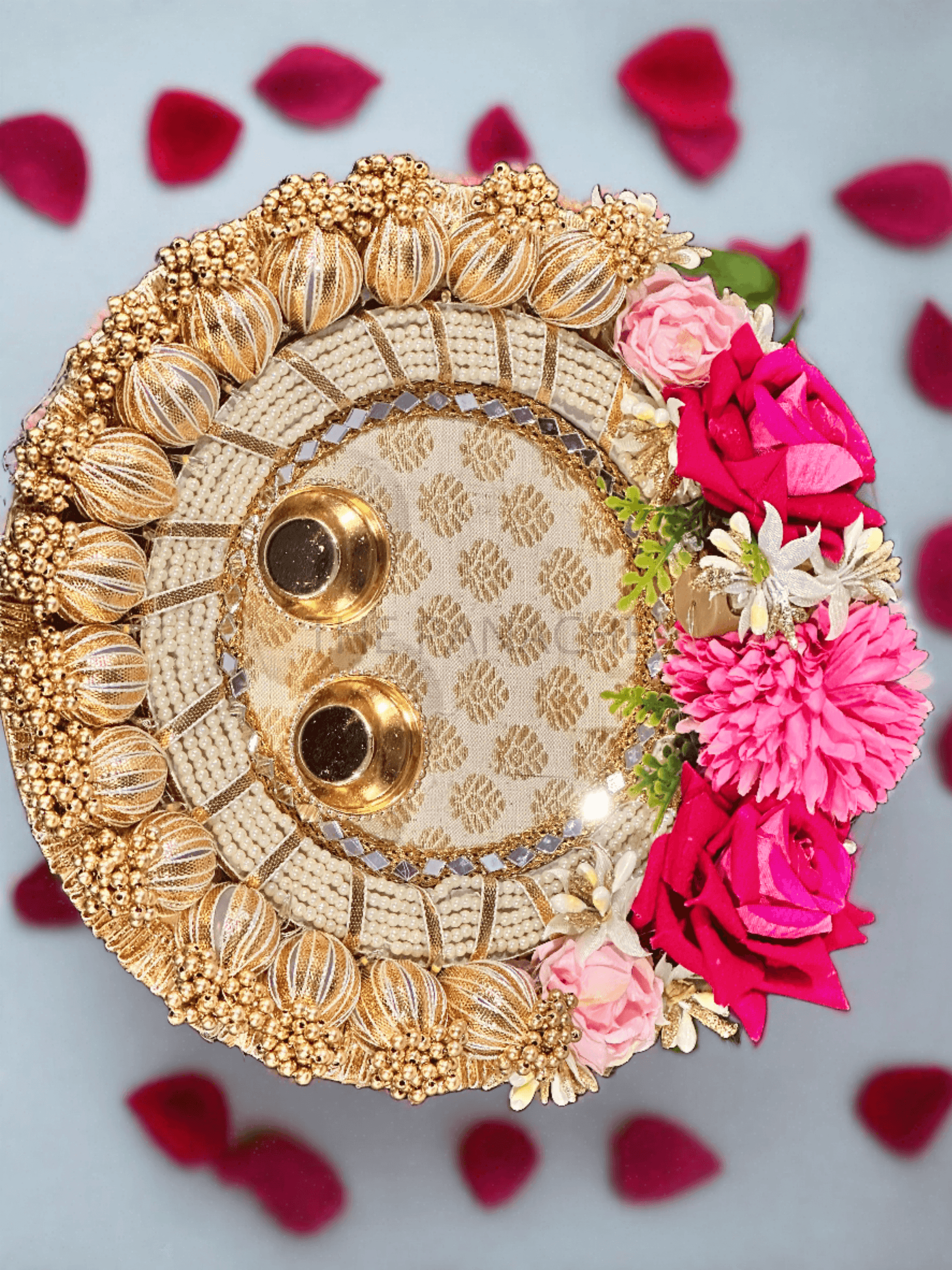 Imagine an exquisite pooja thali crafted from gold-colored metal, adorned with delicate pink flowers adorning its surface. Encircling the circumference of the thali are round gold fabric beads, adding a touch of opulence and luxury to the design. In the interior of the thali, envision a mesmerizing arrangement of mirrors, reflecting light and creating a sense of depth and elegance.